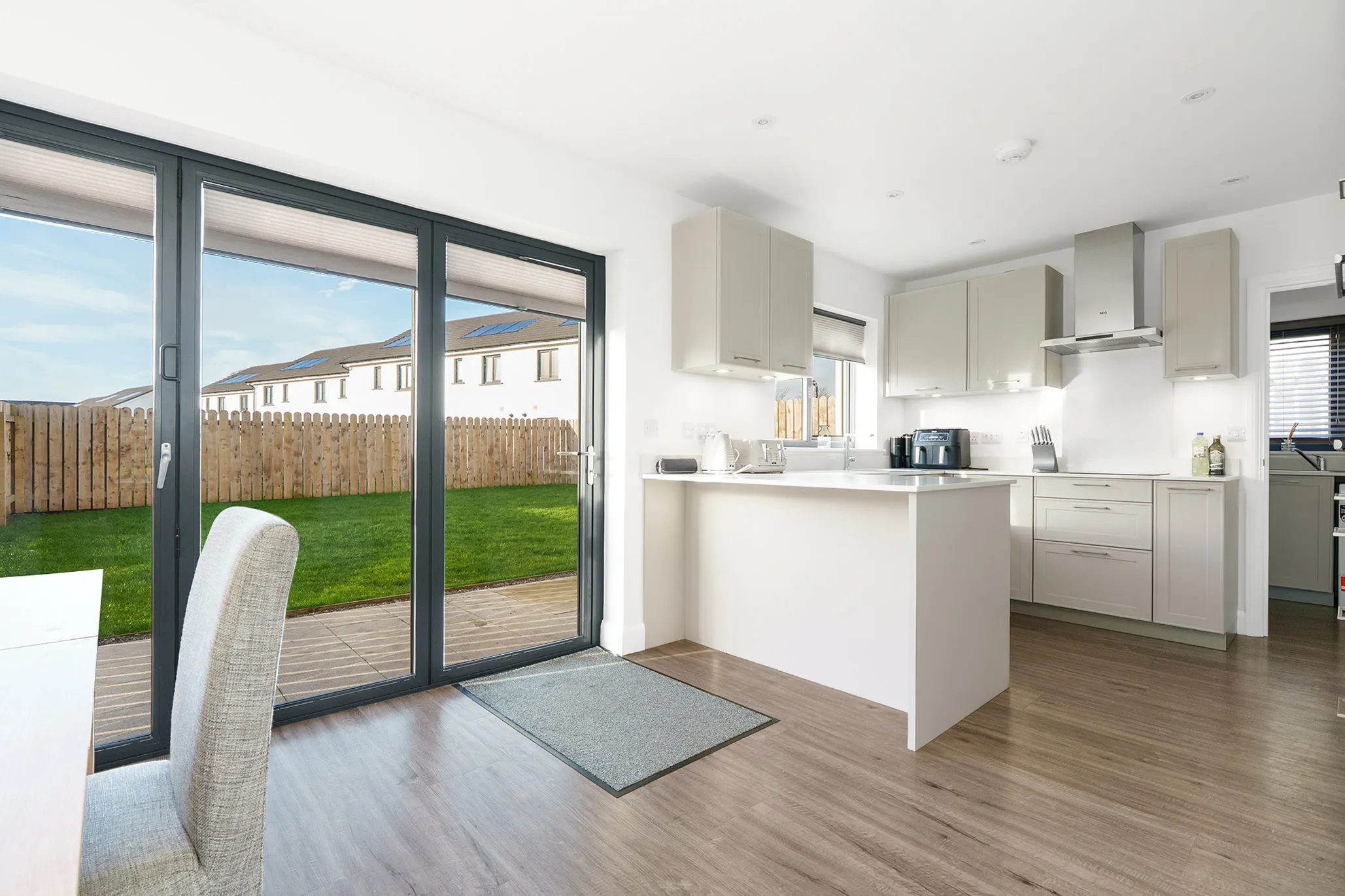 The spacious ground floor layout includes a welcoming entrance hall, living room, and a stunning open-plan dining kitchen fitted with AEG integrated appliances and sleek bi-folding doors opening onto the rear garden and patio – ideal for entertaining or relaxing. A utility room and ground floor cloakroom (WC) add to the home’s practicality.