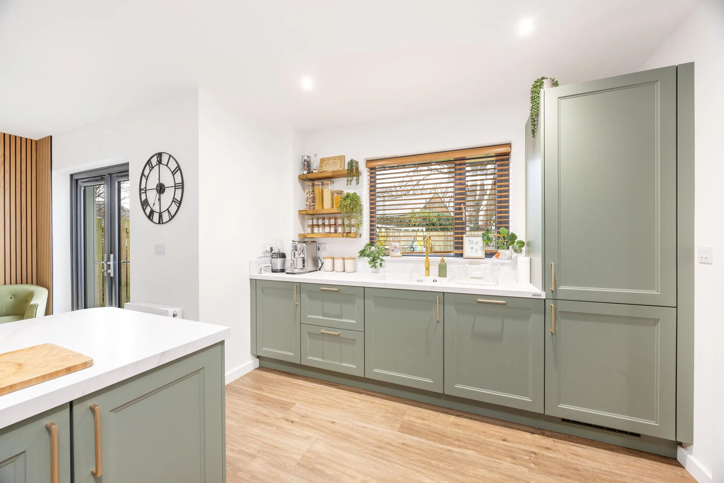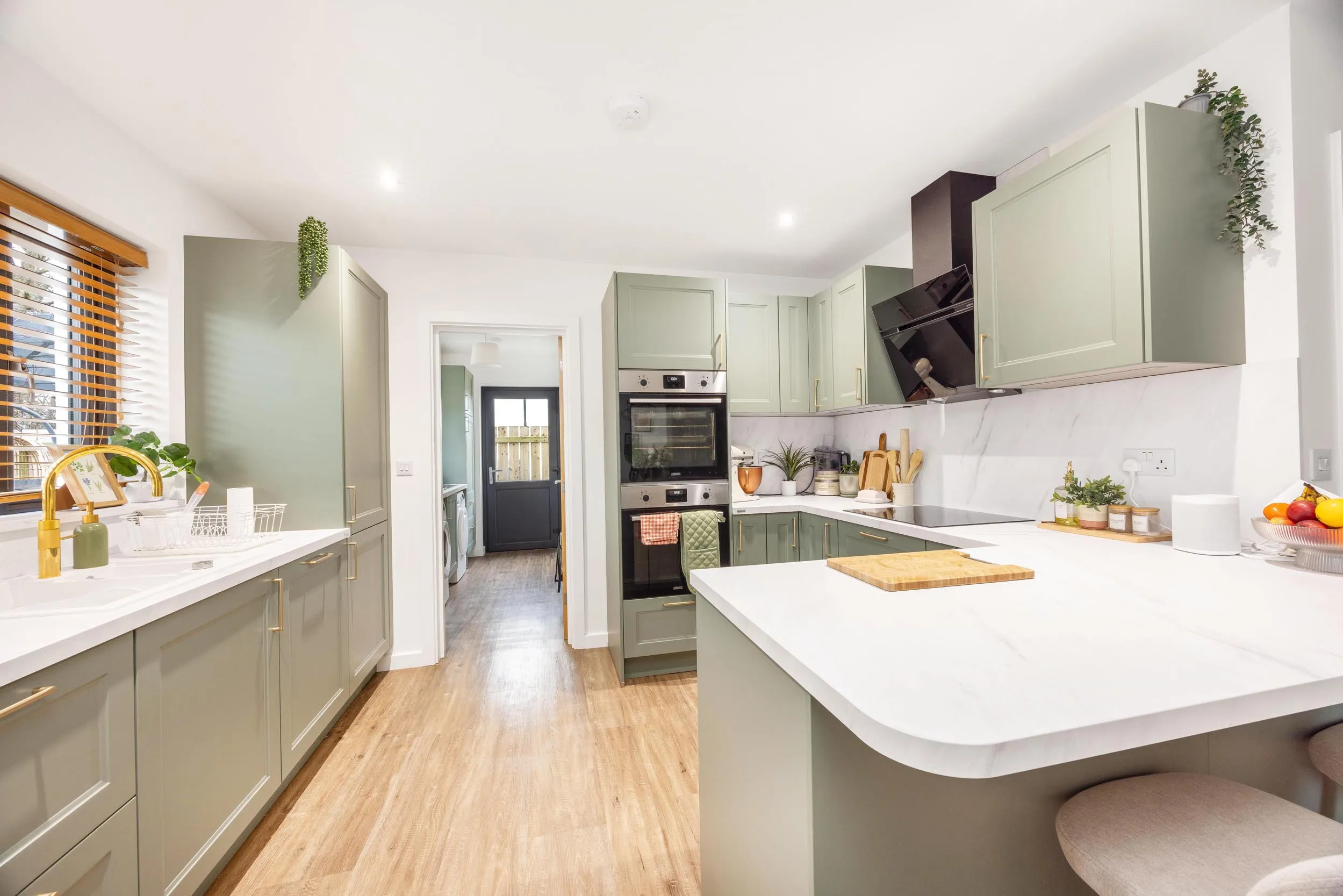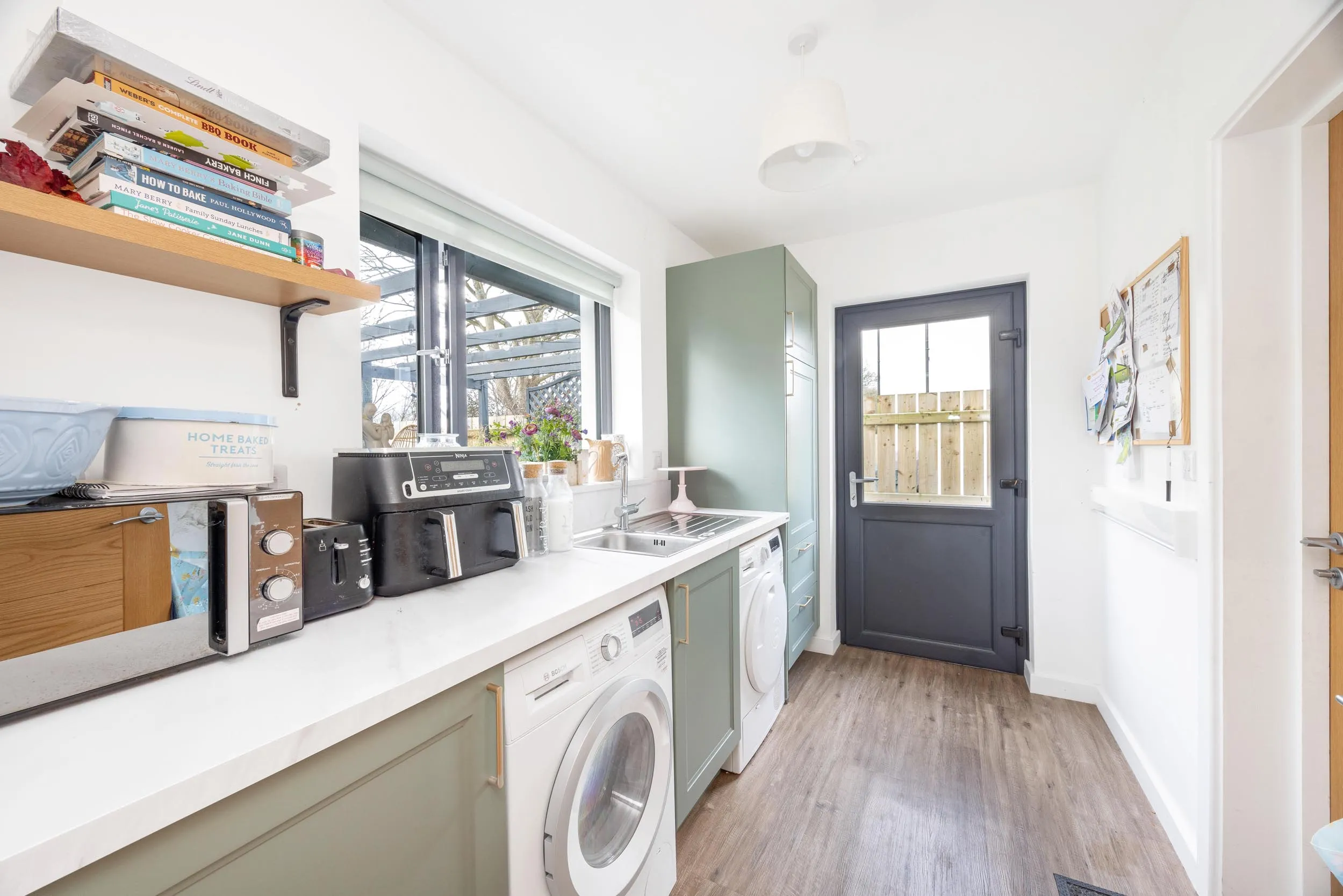 The accommodation opens with an entrance porch leading into a welcoming reception hall with a useful storage cupboard and a cloakroom (WC). A stylish living room provides a relaxing retreat and features double doors opening into the stunning dining kitchen, creating a wonderful flow for both everyday living and entertaining. The kitchen is truly a standout feature, having been upgraded to a bespoke specification with custom cabinetry, upgraded handles and worktops, two integrated ovens instead of one, a Quooker boiling hot water tap, and a bespoke bar area complete with feature lighting. A matching utility room offers further storage, including a larder unit, and provides integral access to the attached garage.