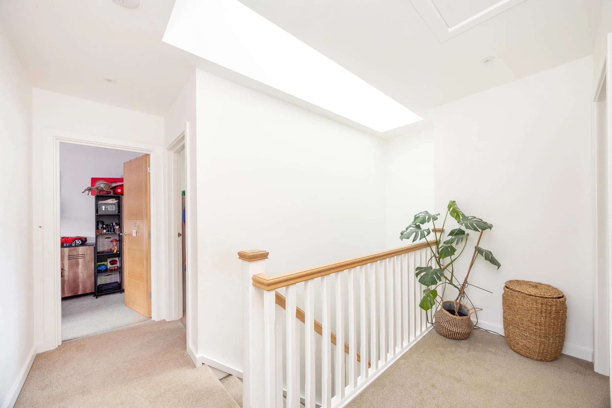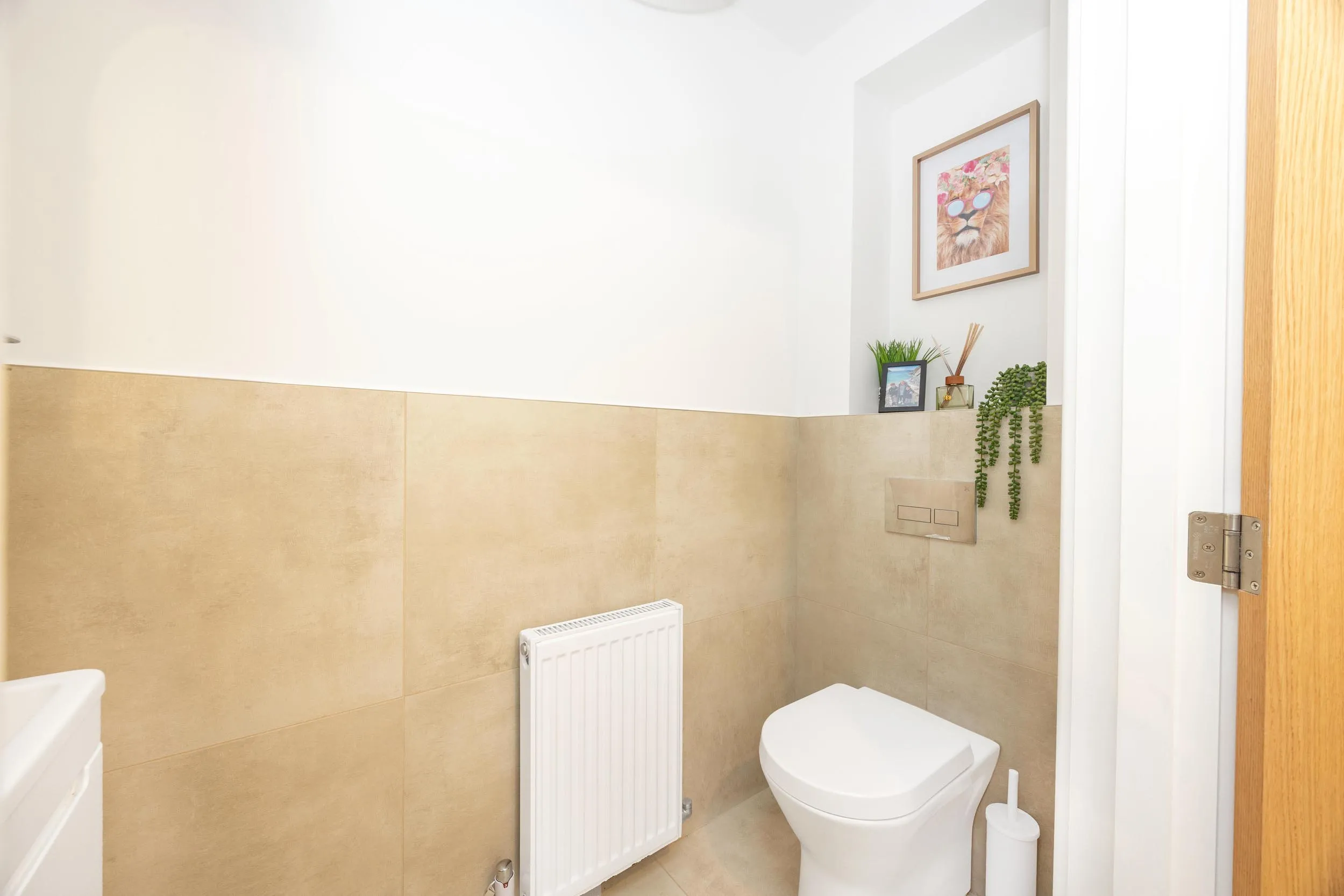 To the first floor are four generous double bedrooms. The principal bedroom benefits from a luxurious en suite shower room finished with marble-style tiling, while the family bathroom is equally impressive, featuring patterned floor tiles and both rooms enjoying the rare advantage of separate bath and shower facilities.