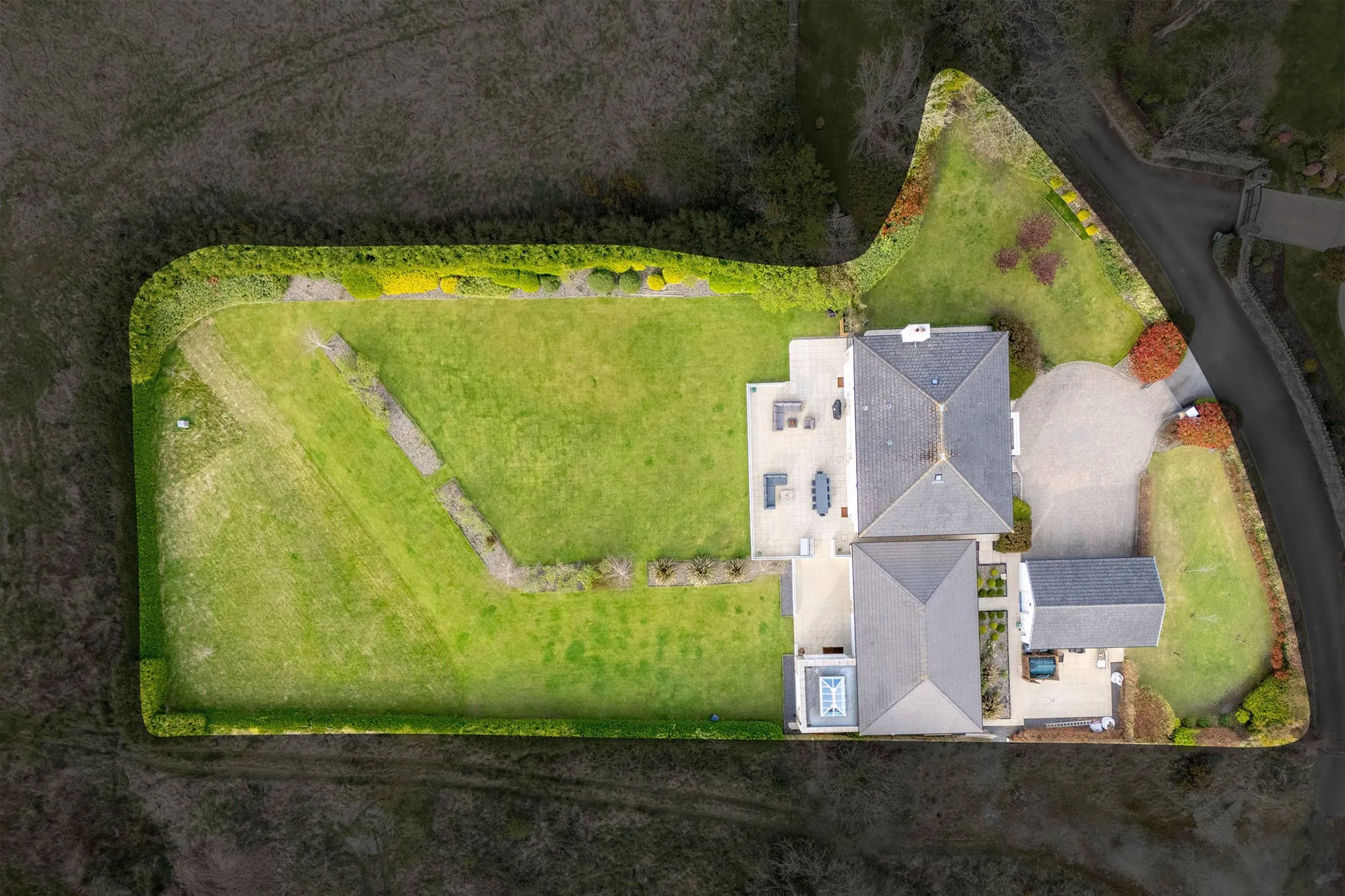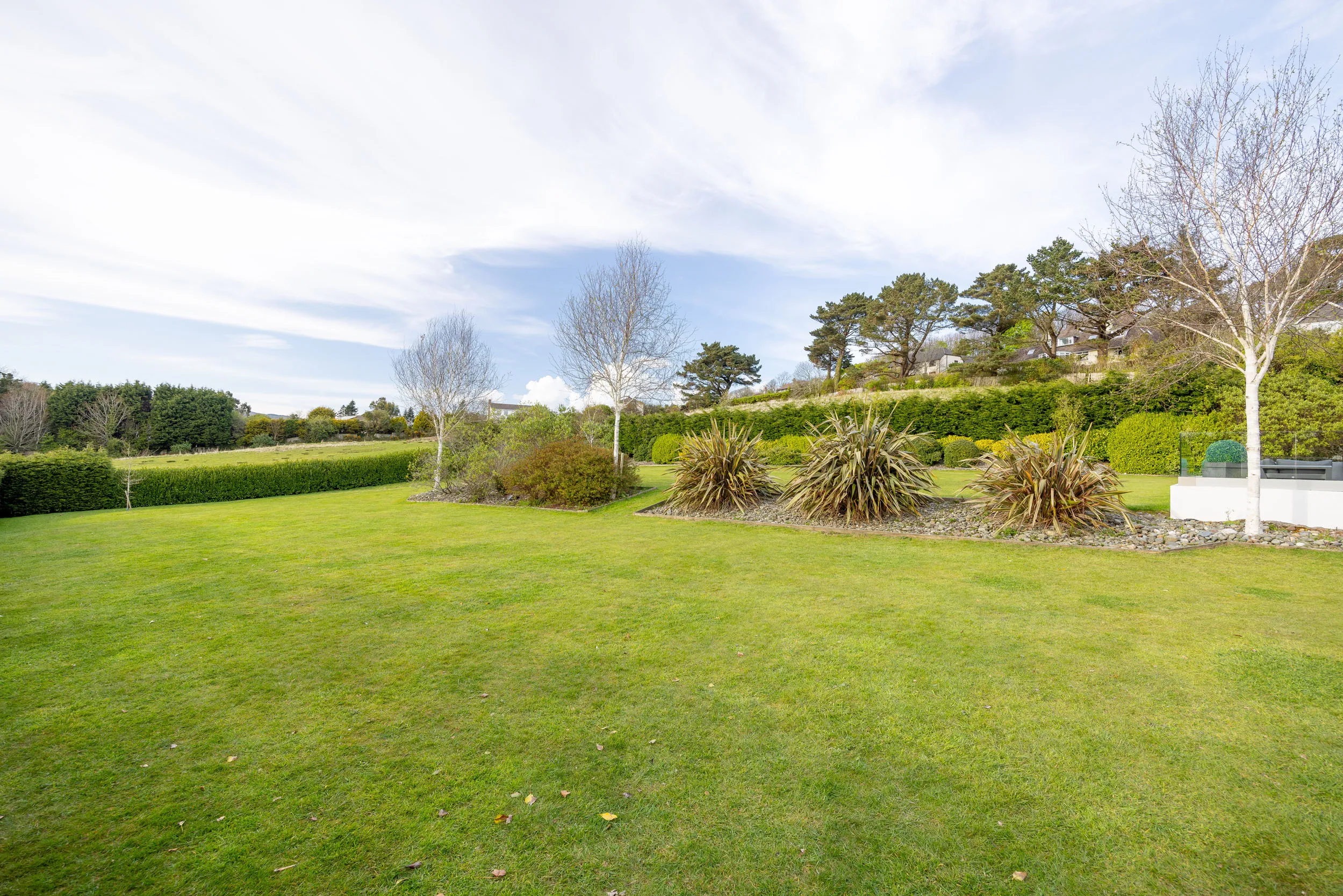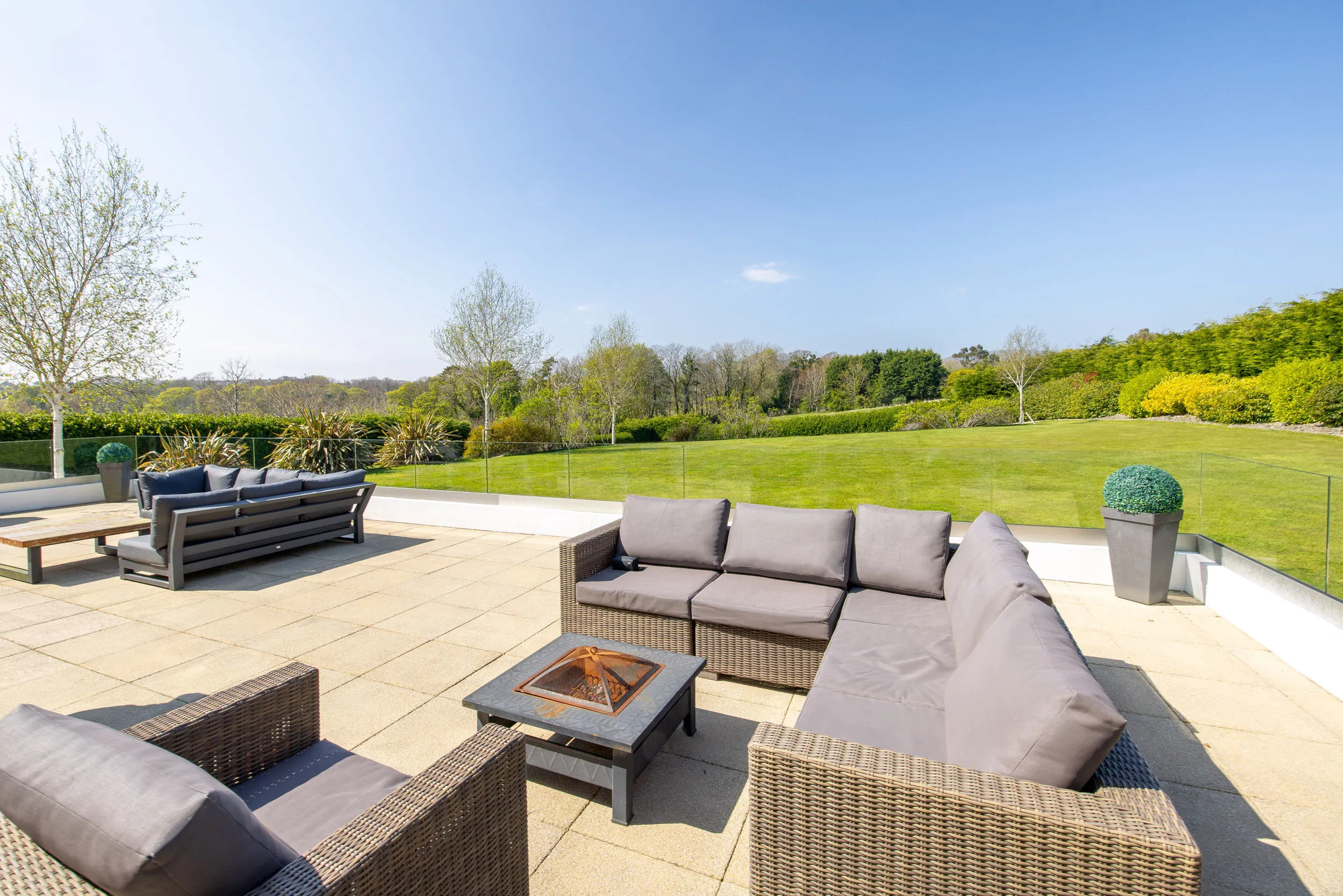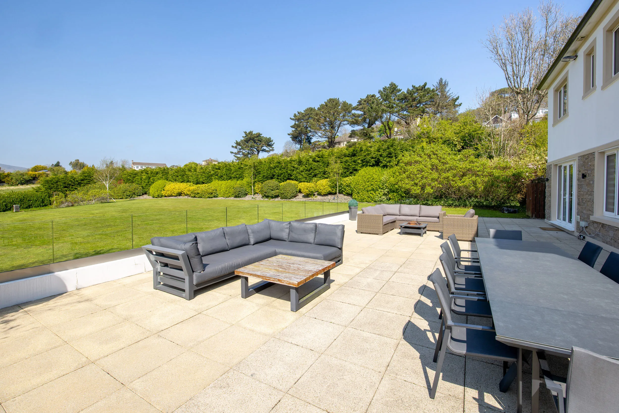 The property is set within beautifully landscaped gardens extending to approximately one acre, enjoying a stunning parkland backdrop. Outdoor entertaining is enhanced by a large paved patio with glass-panelled balustrade, creating a stylish and private space for relaxation or hosting.