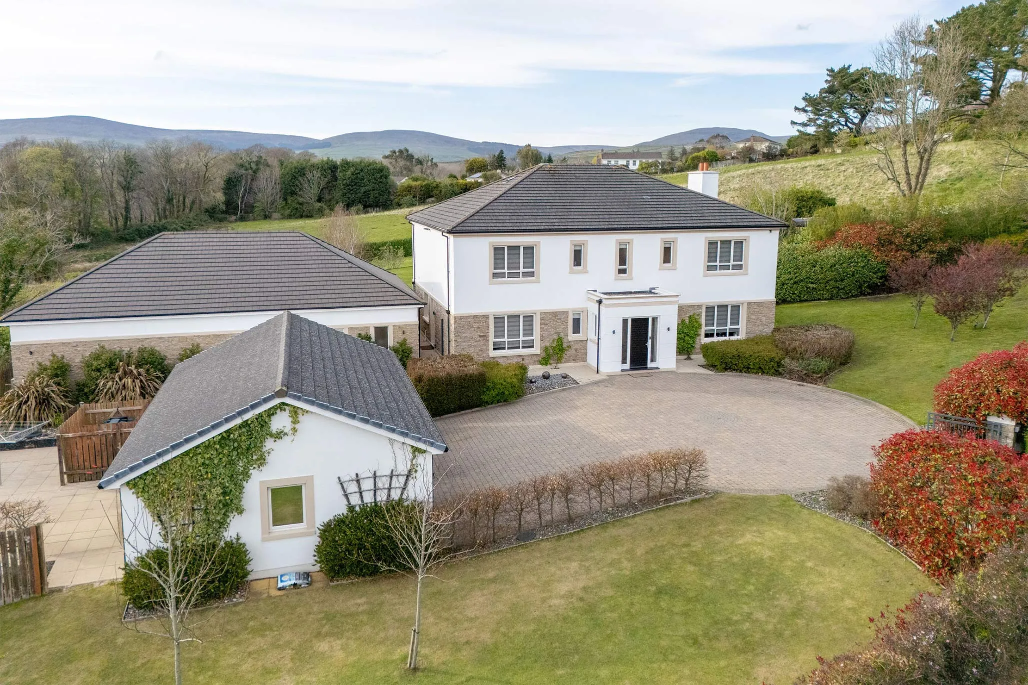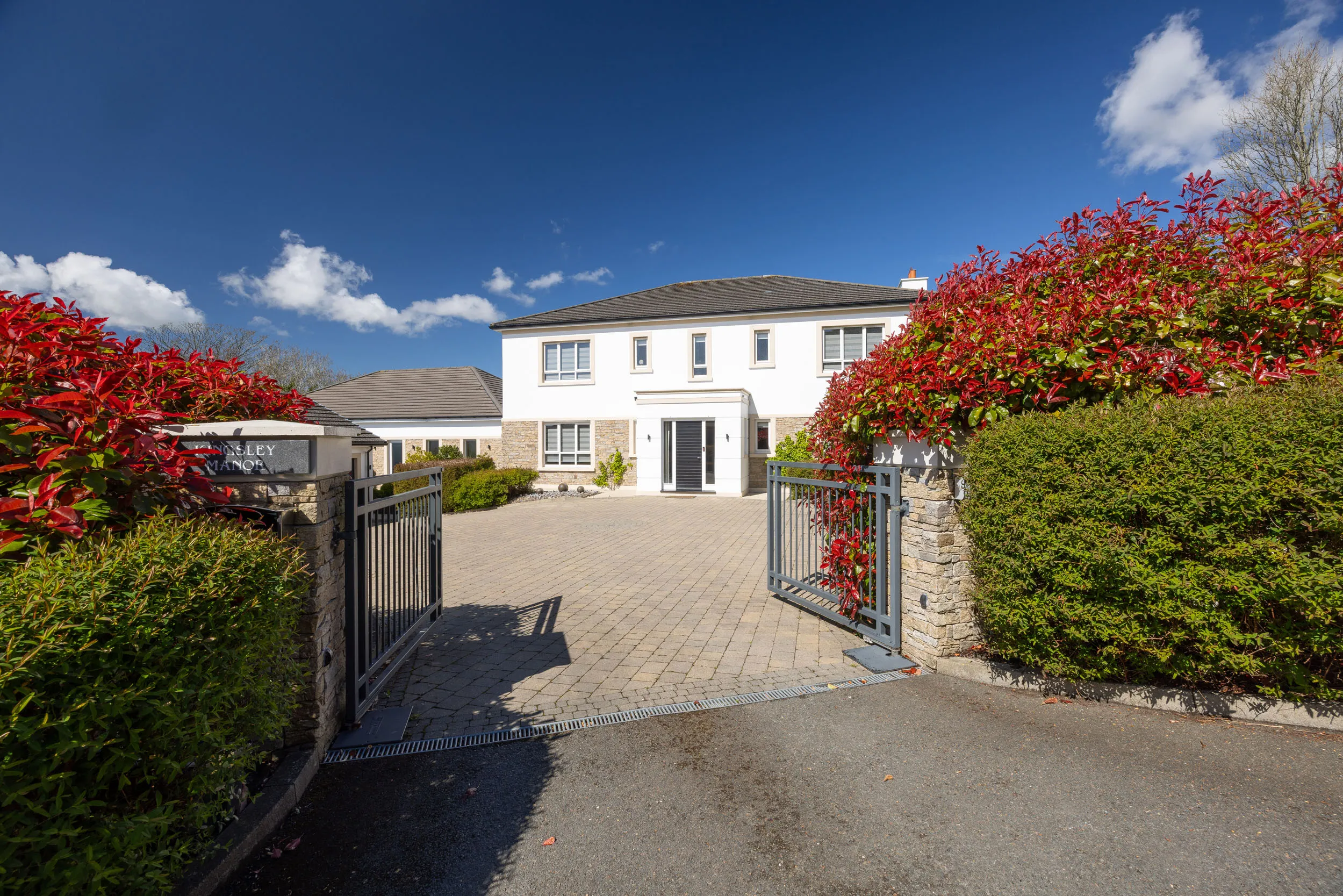 - Gated driveway leading to a courtyard style parking area also providing access to the detached triple garage block