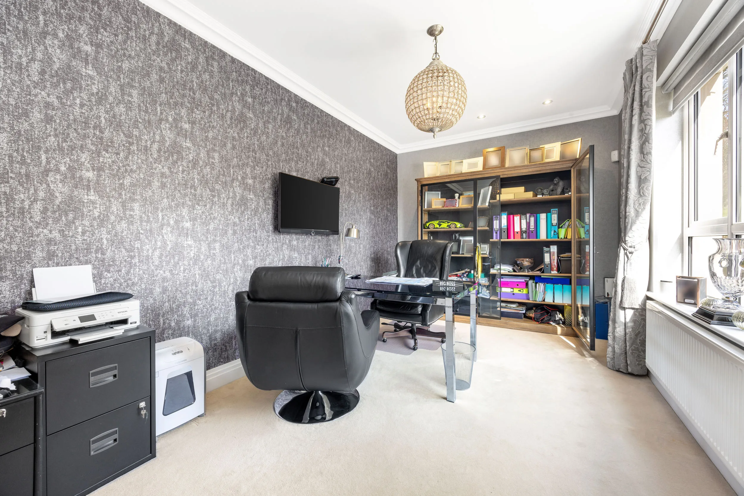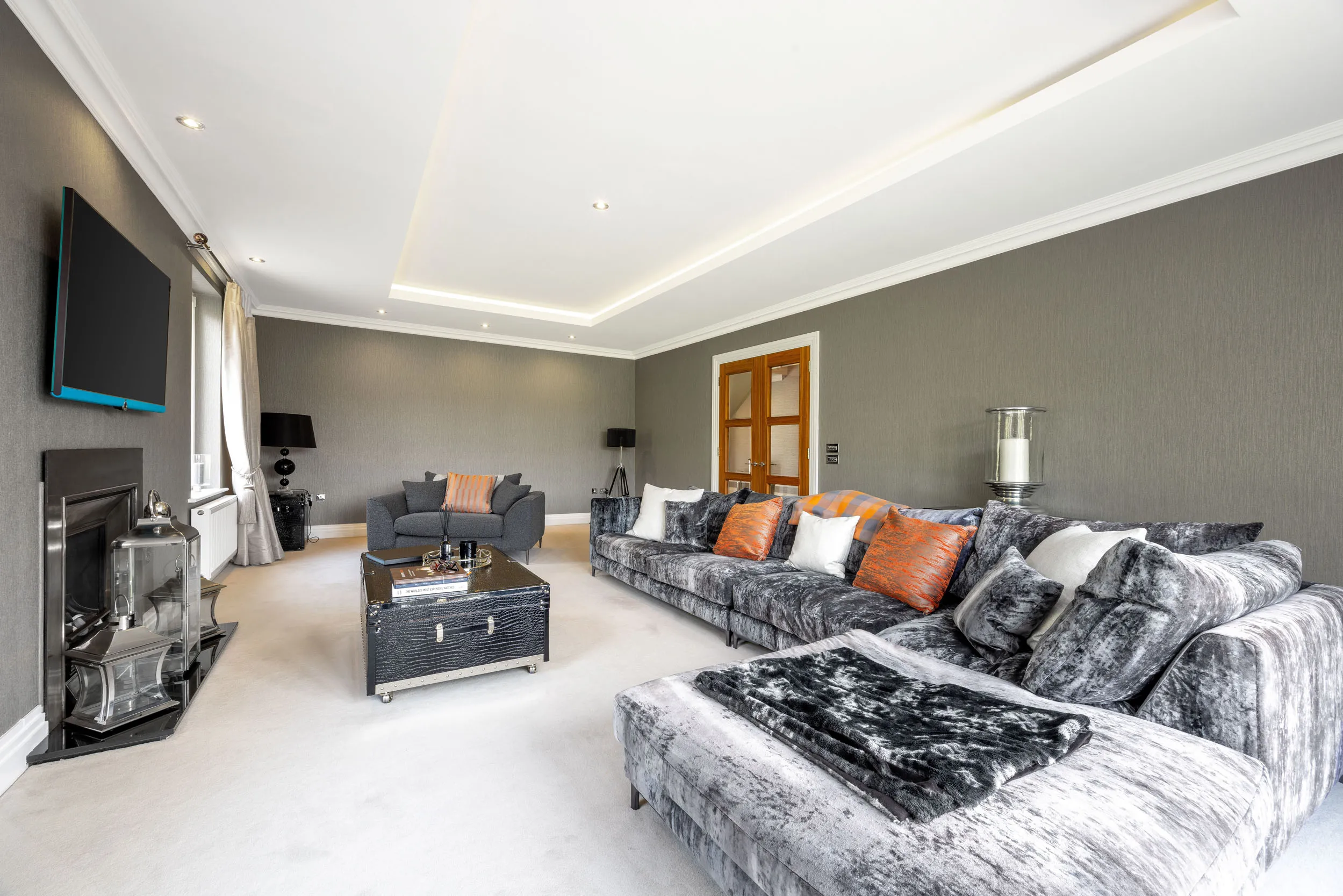 The property provides extensive accommodation complemented by the finest luxury fixtures and fittings throughout. A grand, welcoming reception hall, complete with a striking sweeping staircase, sets the tone for the home’s impressive scale and attention to detail. There are three sumptuous reception rooms – a formal living room, a refined family room, and a spacious study – alongside a superb, family-focused dining kitchen featuring bi-folding doors that open onto the rear gardens, seamlessly blending indoor and outdoor living and creating a stunning backdrop for entertaining.