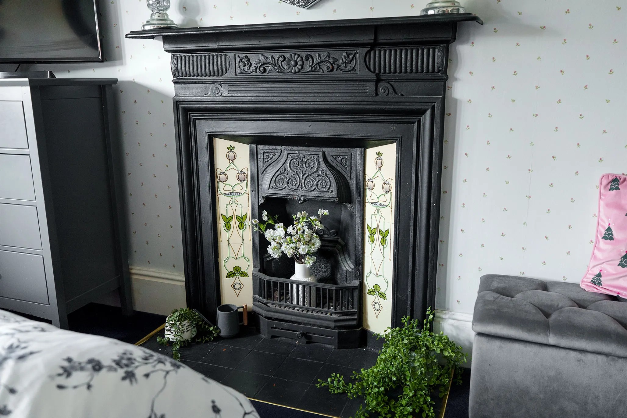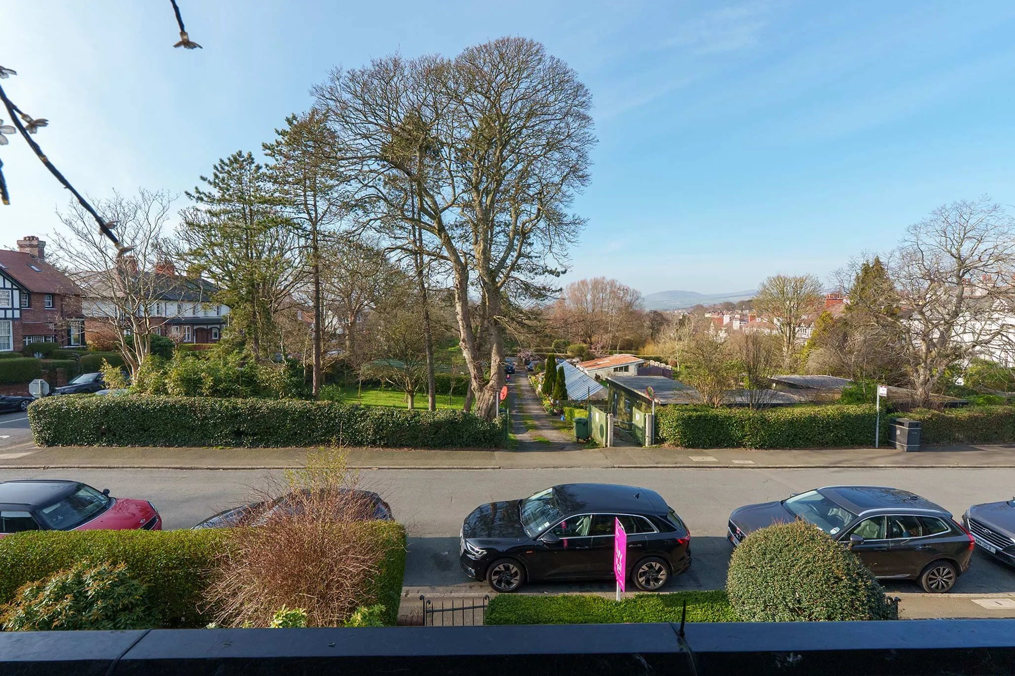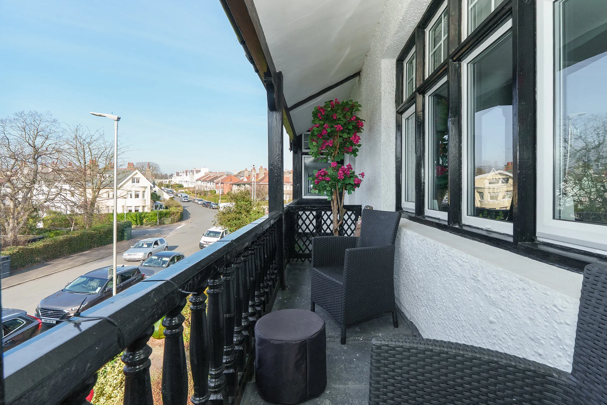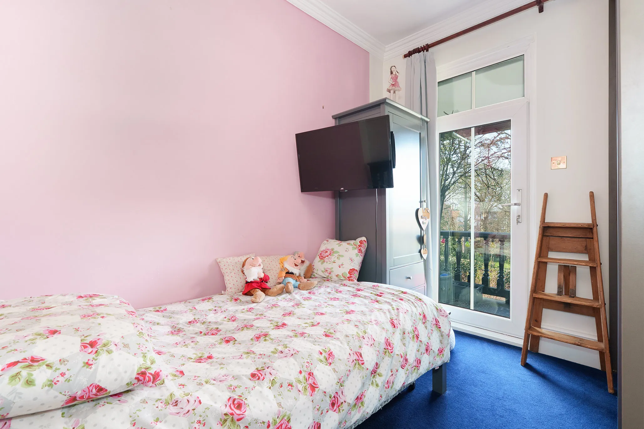 To the first floor, there are three bedrooms. The principal bedroom benefits from an en-suite, while another enjoys access to the balcony, an ideal spot to take in views over Brunswick Gardens. A well-appointed family bathroom serves this level.