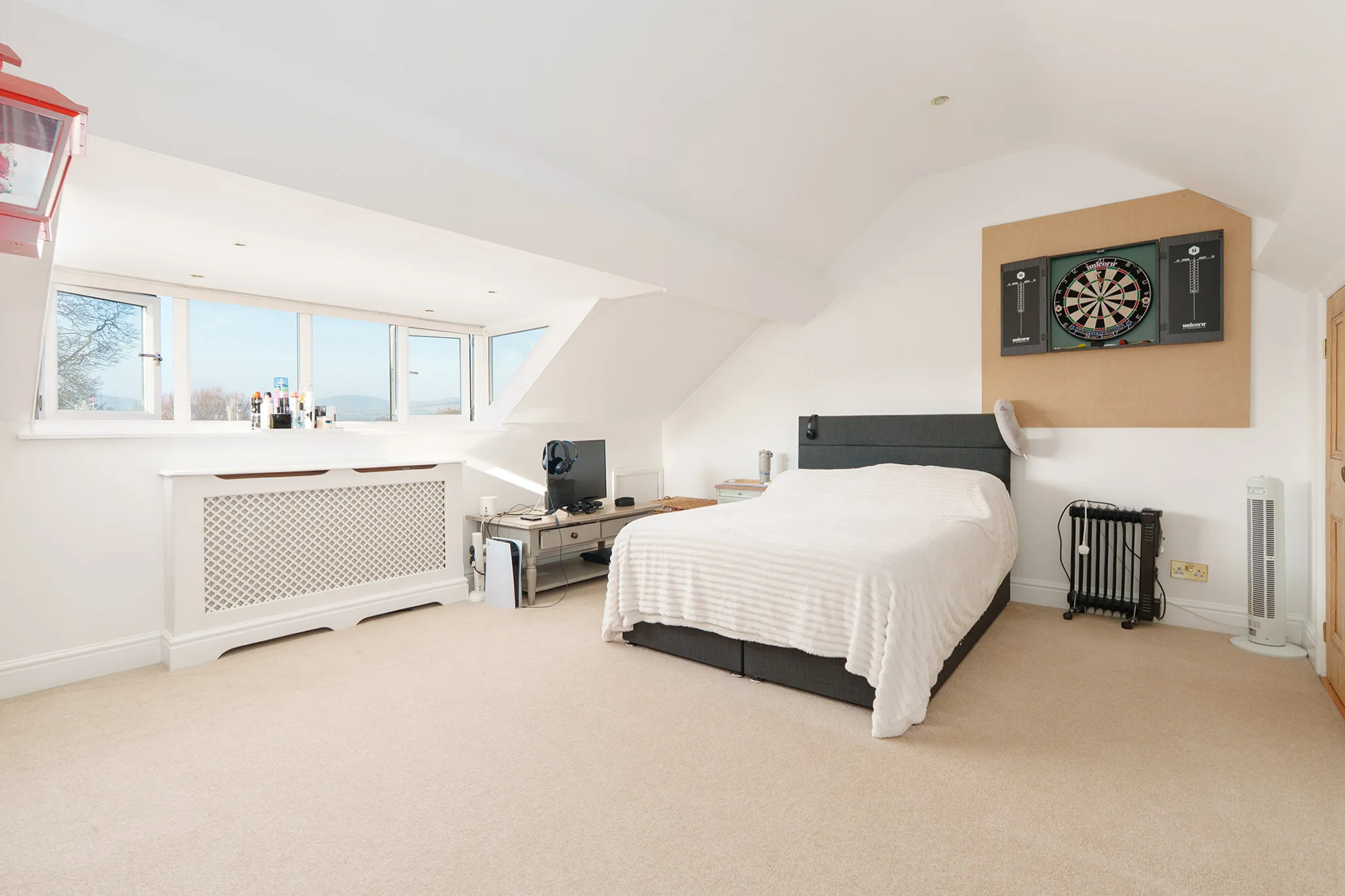 The second floor is dedicated to a spacious bedroom, complemented by extensive eaves storage.