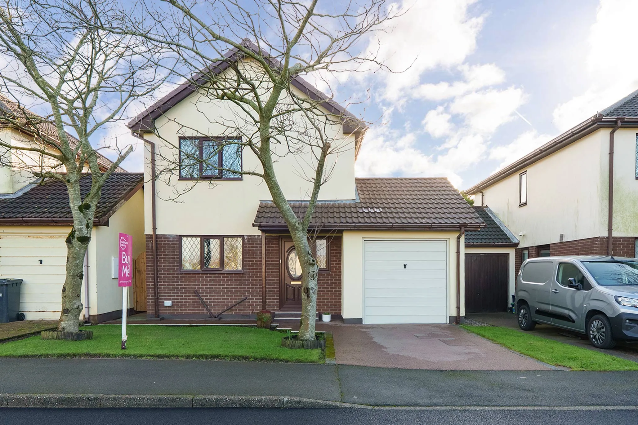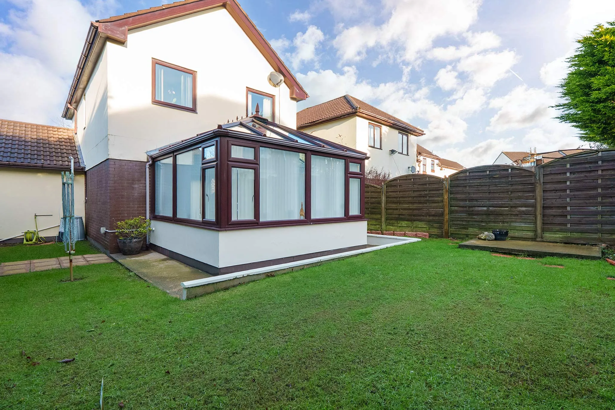 Externally, the home benefits from a driveway providing off-road parking and access to the attached garage. The garden is mainly laid to lawn with established shrubs, offering a pleasant and easily maintained outdoor space.