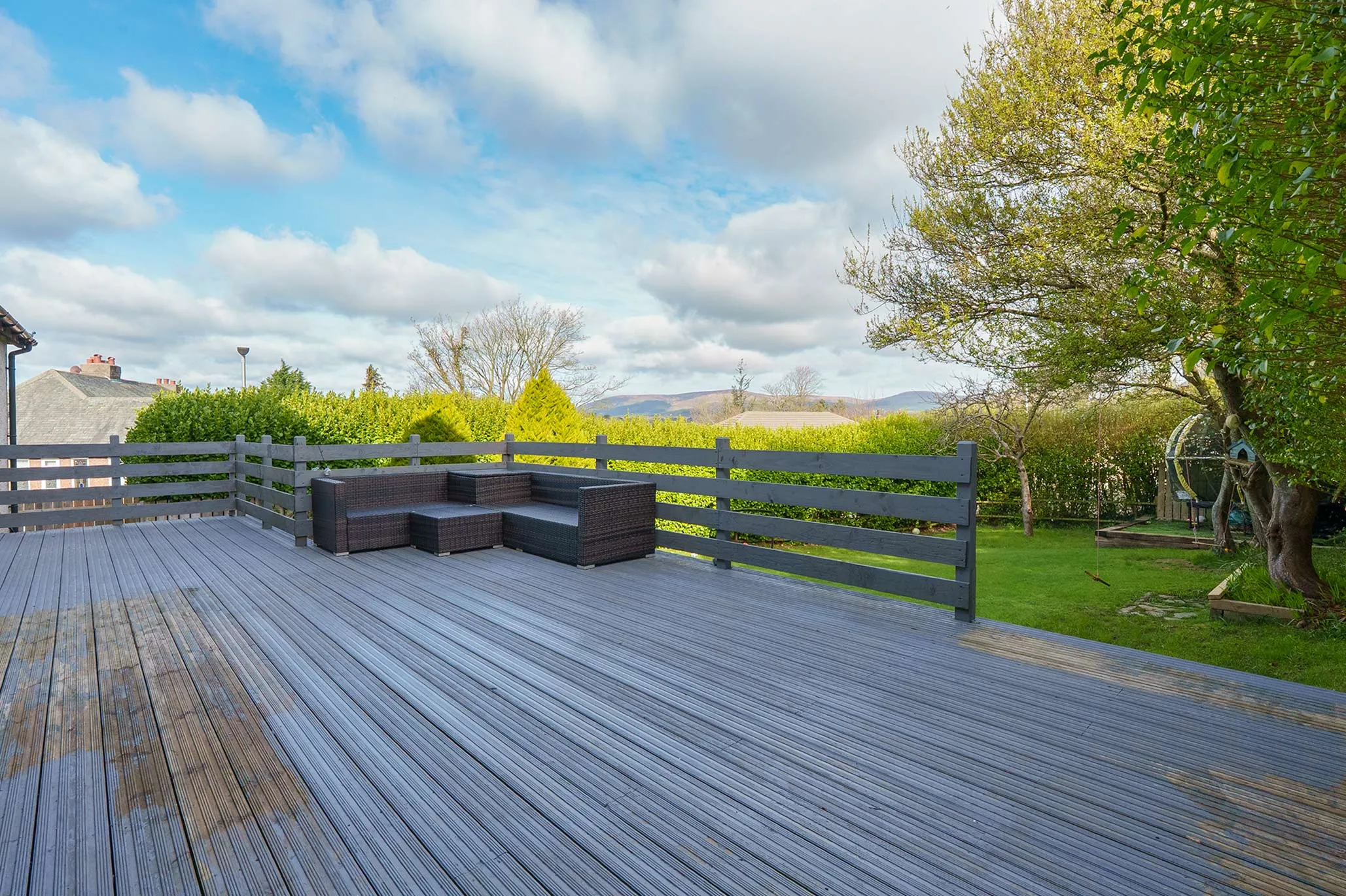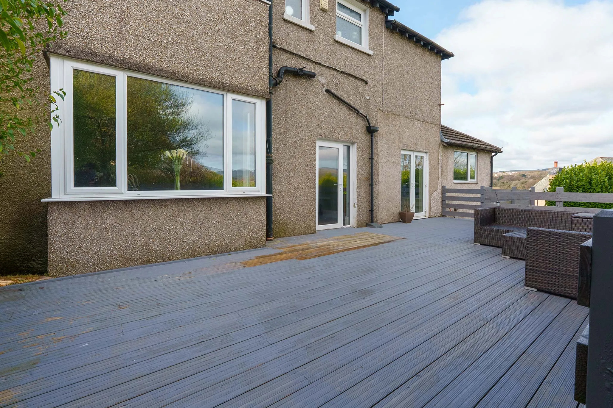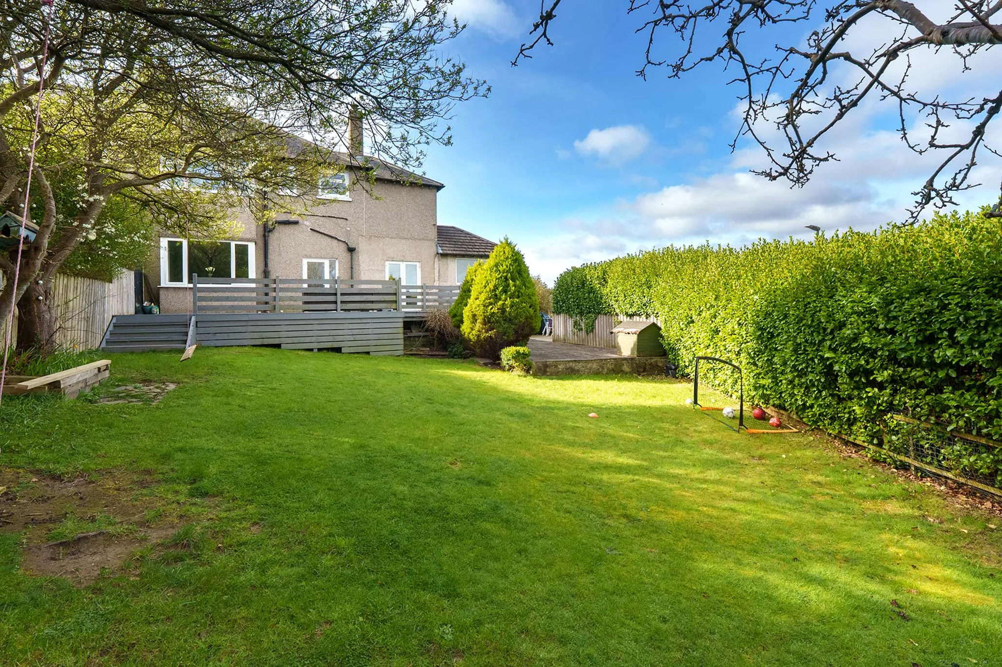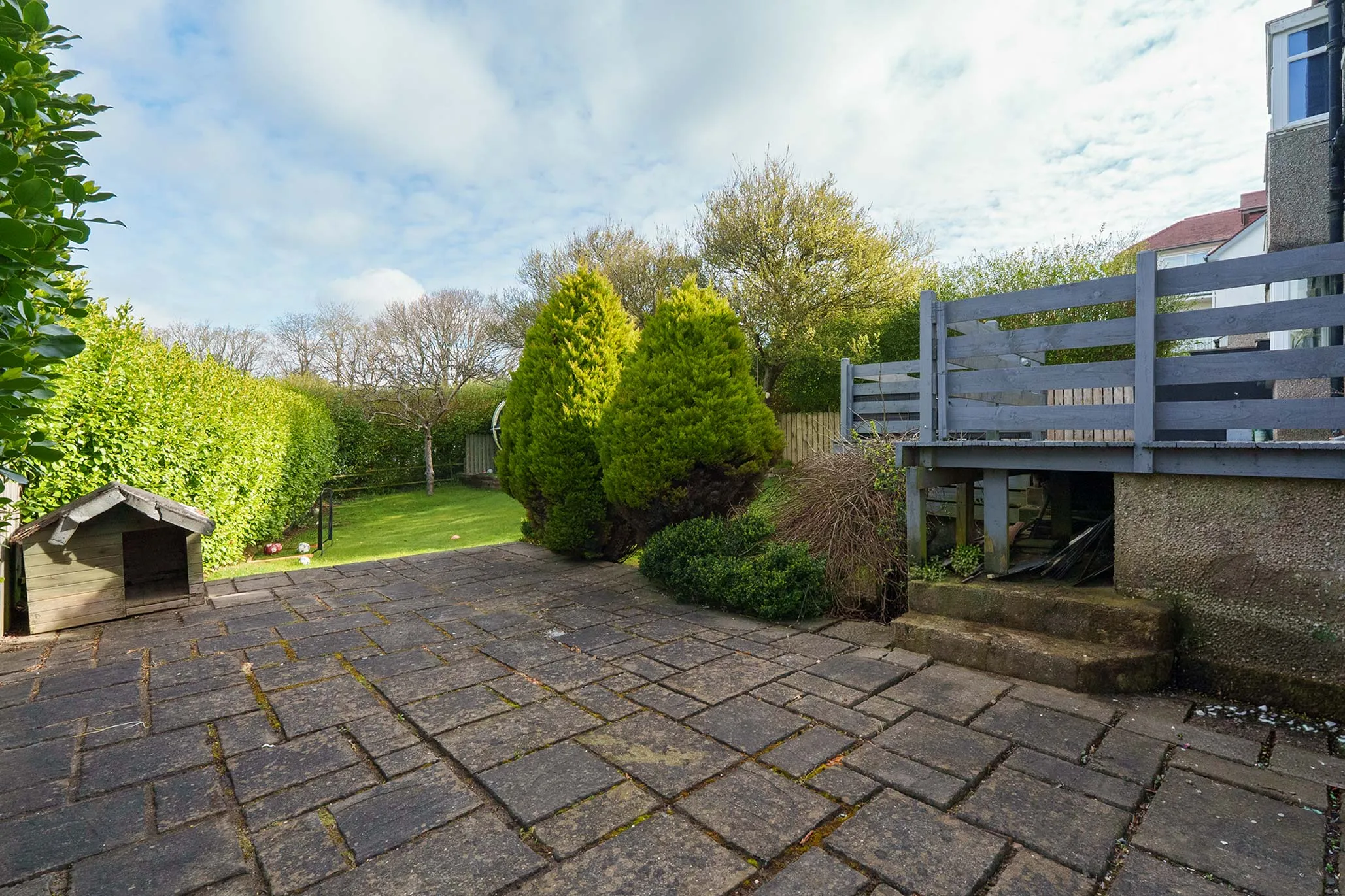 - Superb sized corner plot with 2 large decking areas, paved patio, lawned garden and mature hedging to the borders creating a high degree of privacy