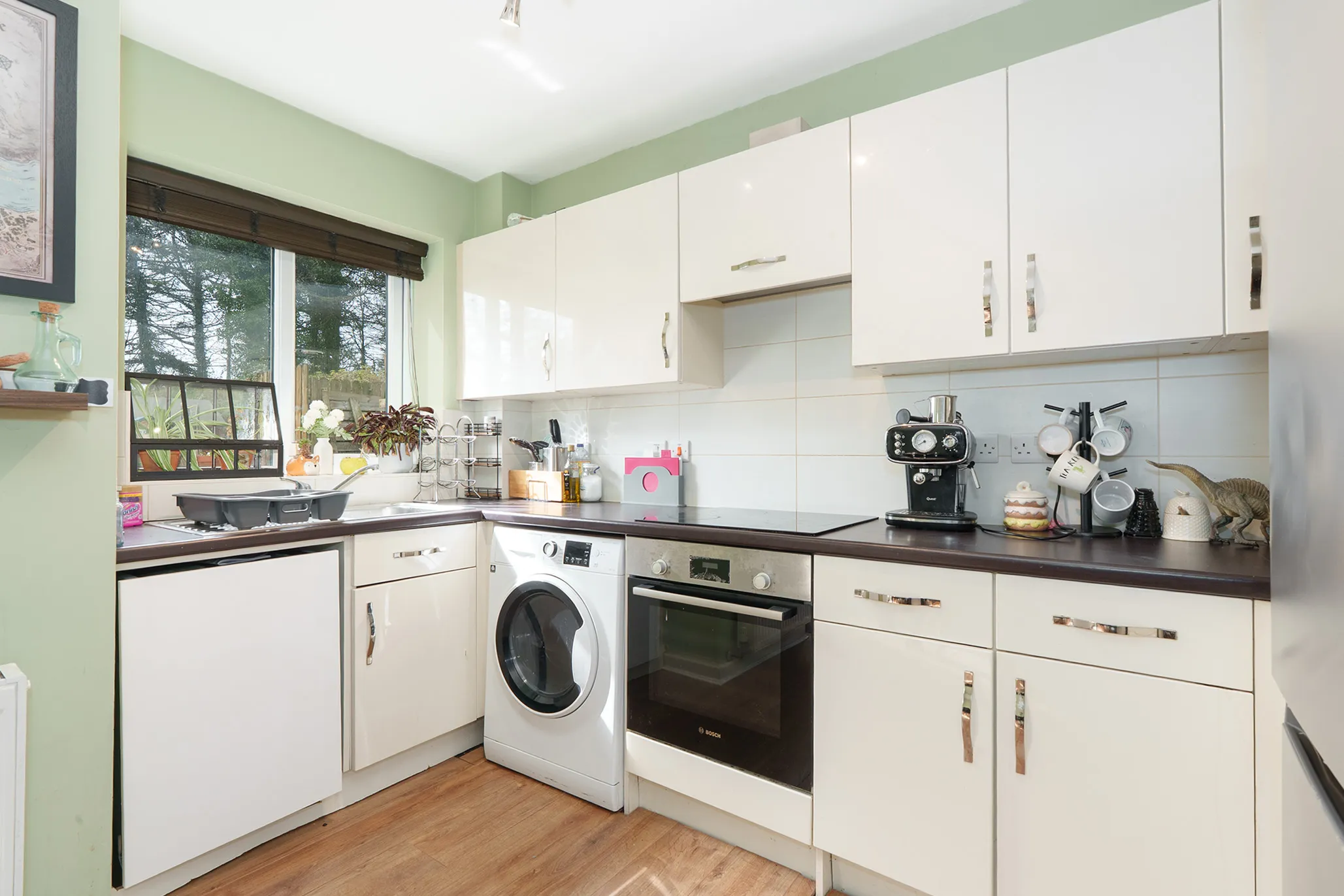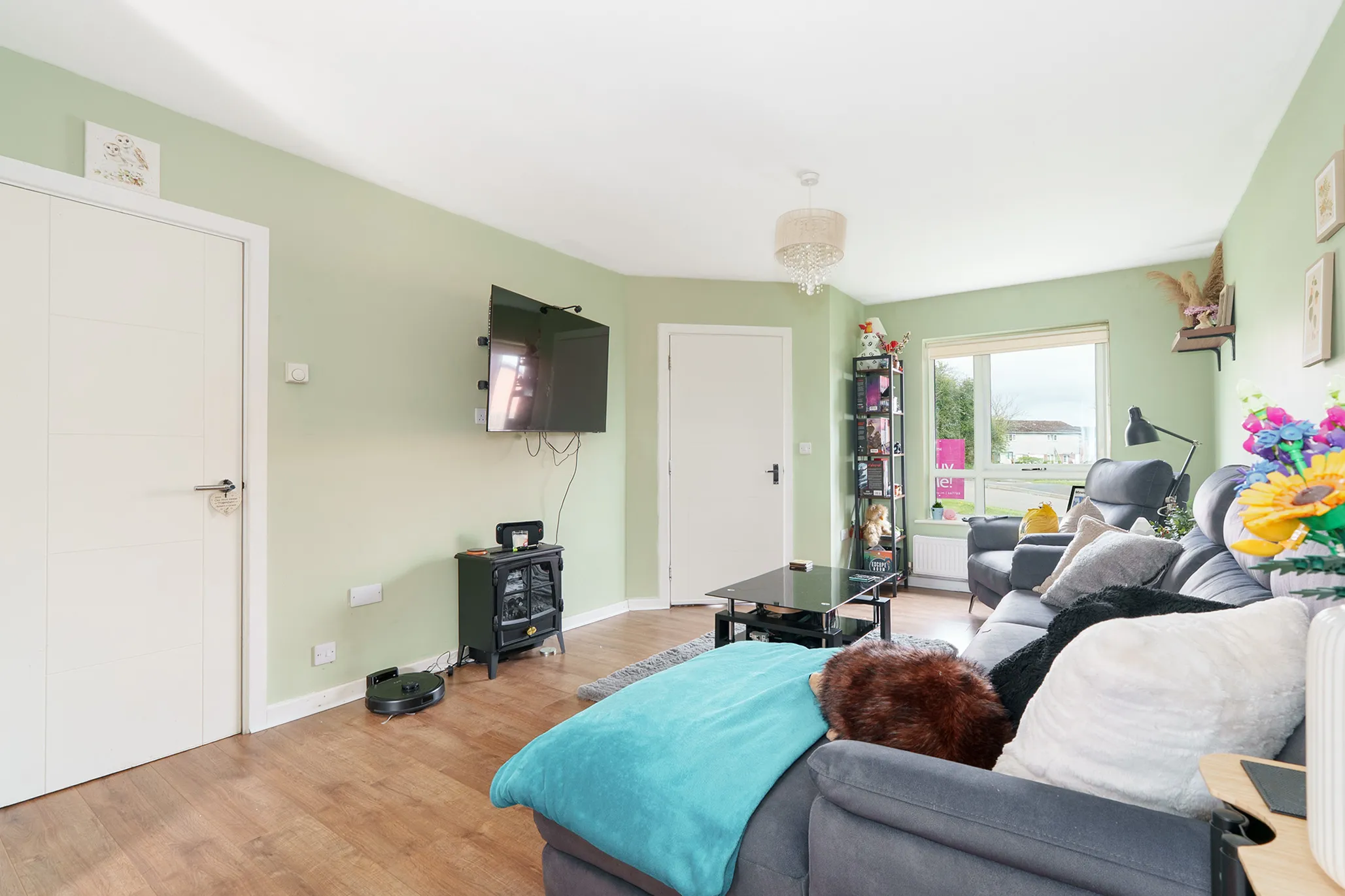 Deceptively spacious throughout, the accommodation features a large open-plan living and dining room which flows seamlessly into a modern kitchen, creating a bright and sociable living space. Double doors from the dining area open onto the south-facing rear garden, perfectly framing the outlook and providing an ideal space for both relaxing and entertaining.