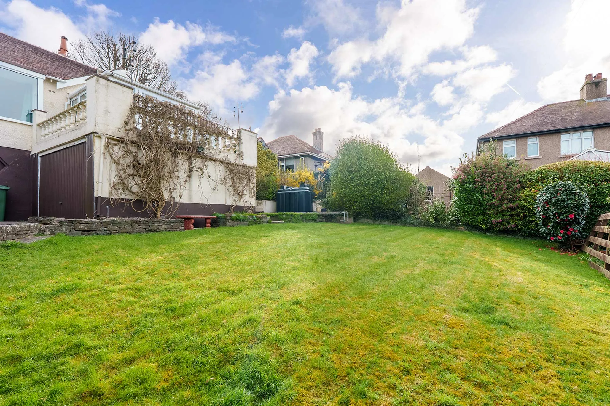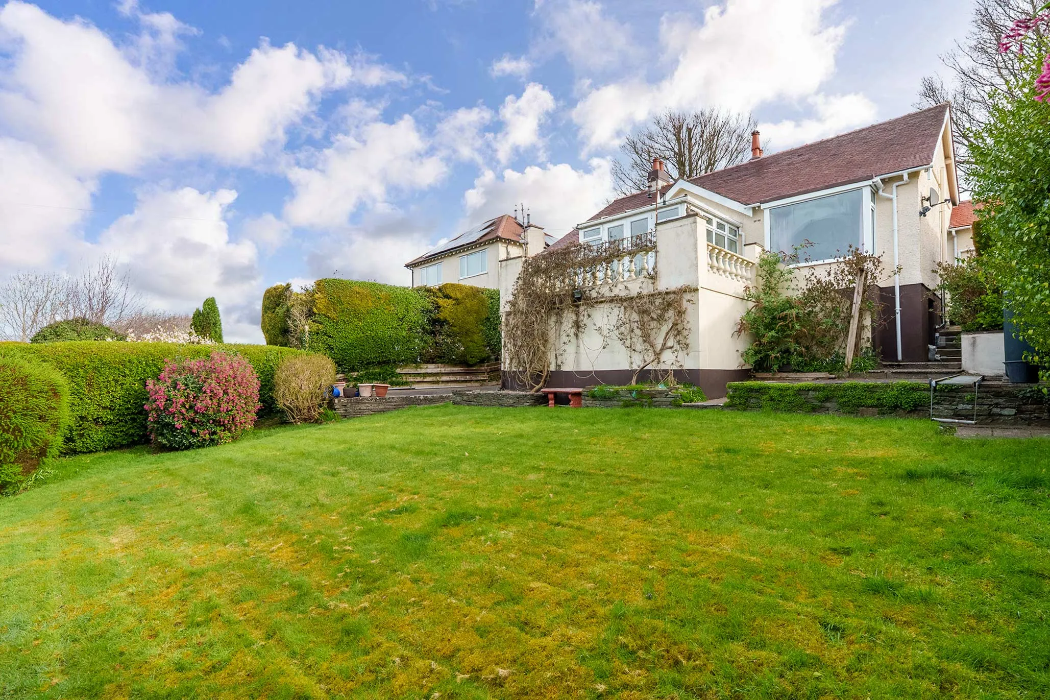 Externally, the home occupies a generous plot with a driveway running along the side of the property, leading down to a lower ground floor garage with a laundry/storage room off. The south-west facing rear garden is mainly laid to lawn and screened with established shrubs and planting, creating a private and peaceful outdoor space.