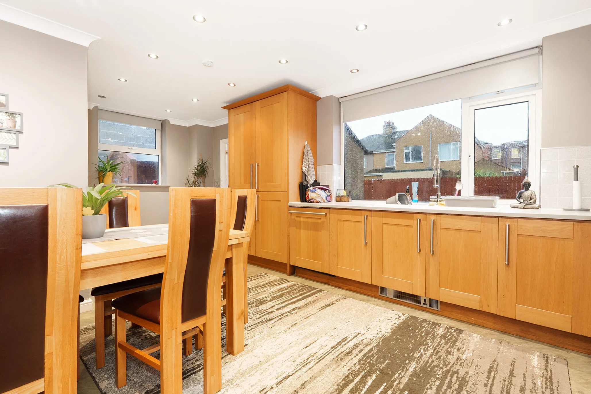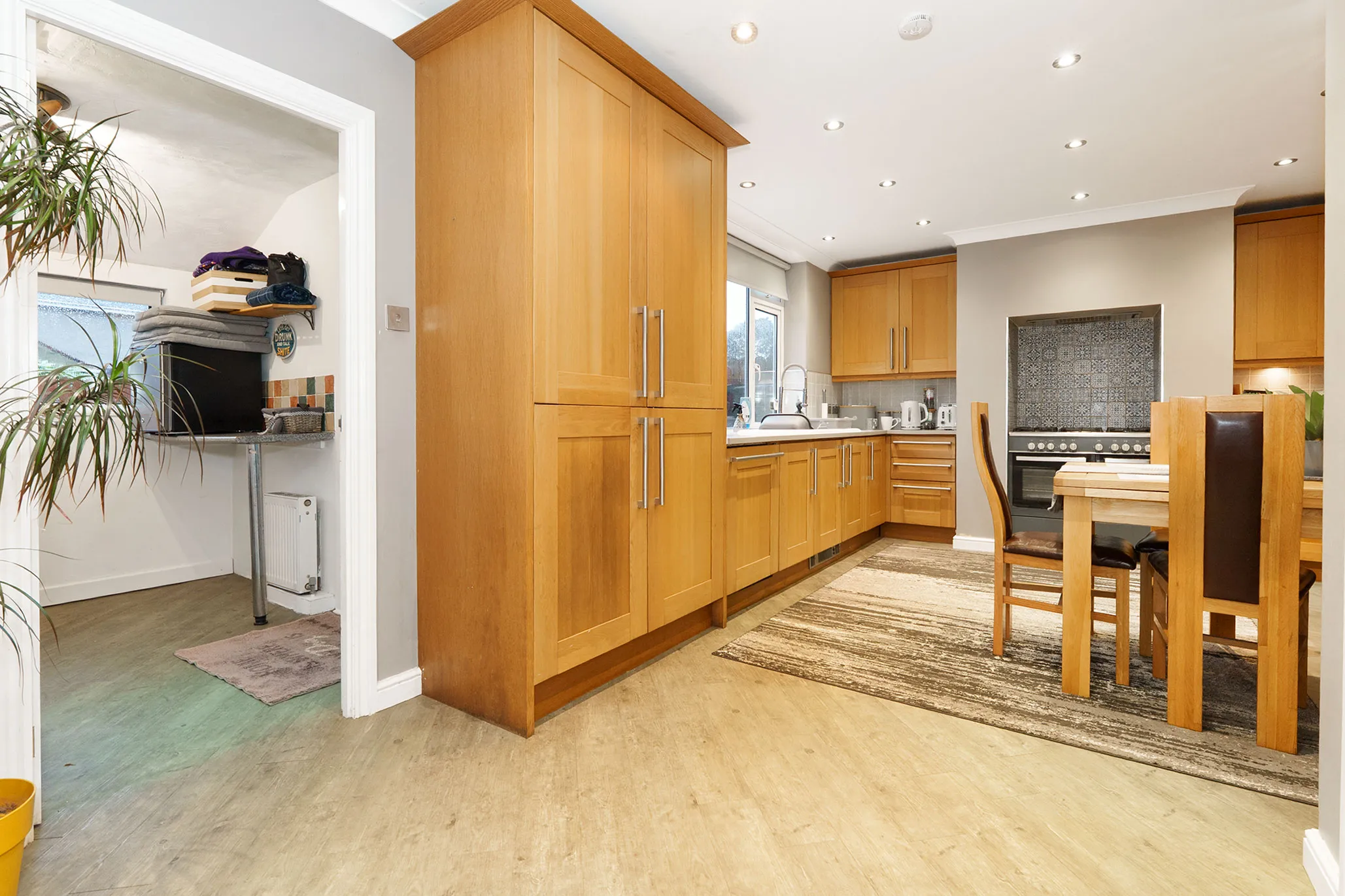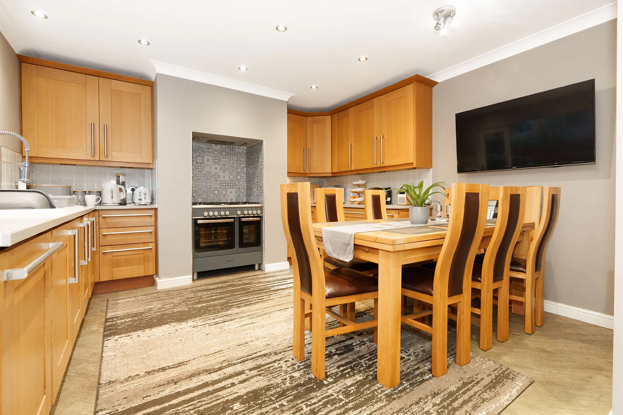 A welcoming reception hall provides access to a useful cloakroom (WC), leading through to the main living accommodation. The living room enjoys a feature curved bay window and is complemented by a stylish log burner, creating a warm and inviting space. To the rear, there is an impressive size modern dining kitchen, ideal for everyday family life as well as entertaining.