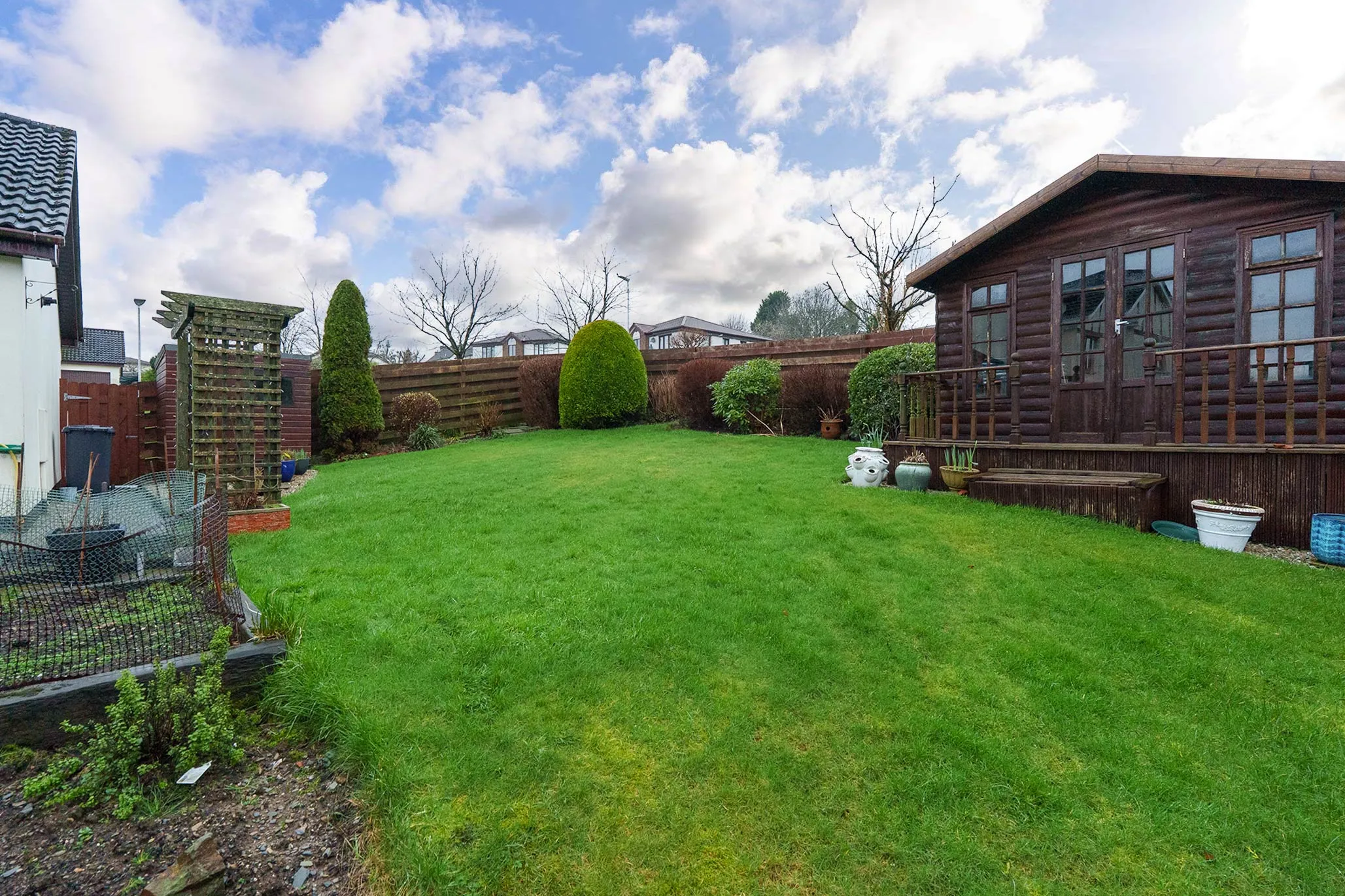 - Impressive rear garden mainly laid to lawn, with raised patio and summer house