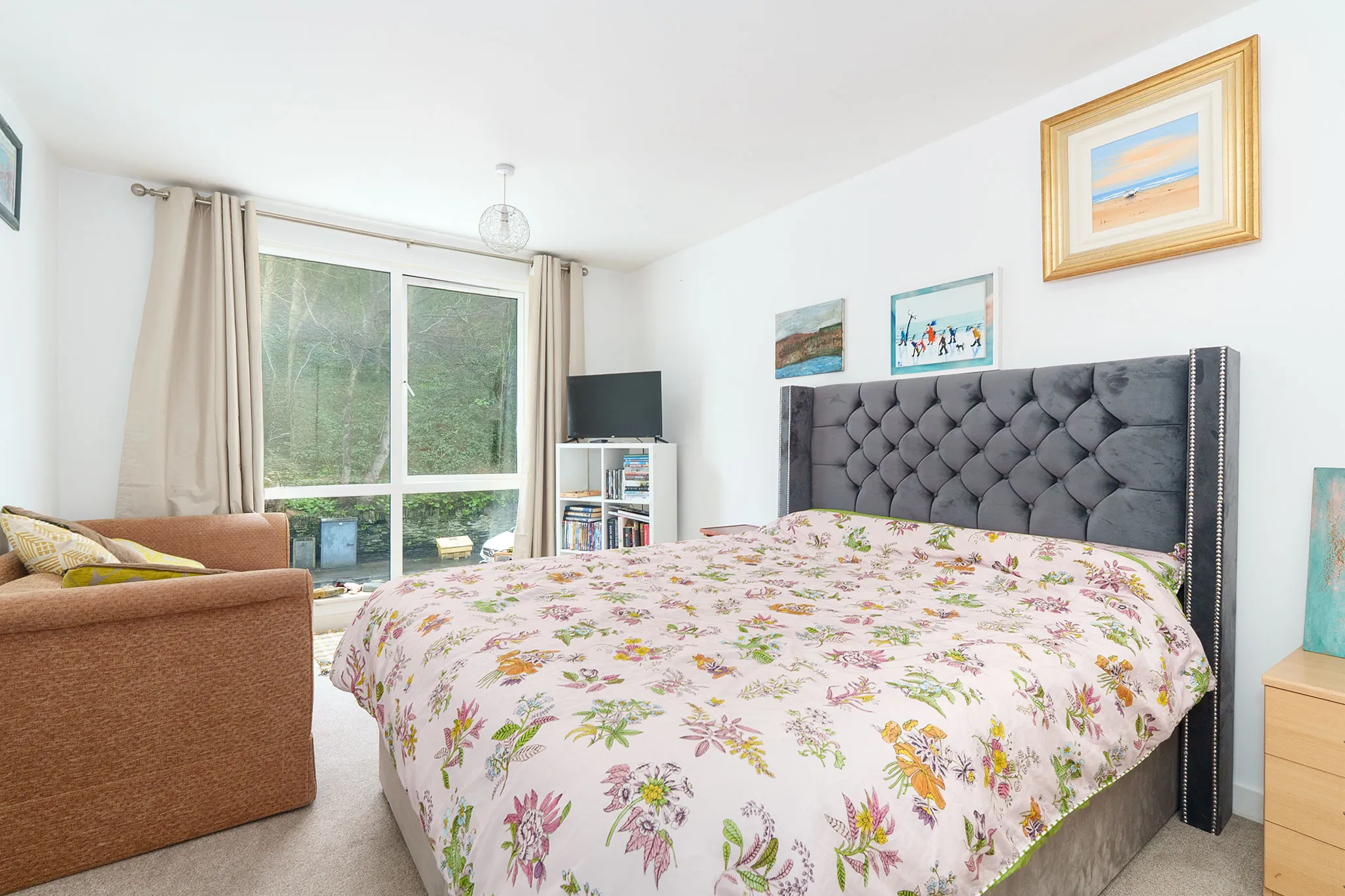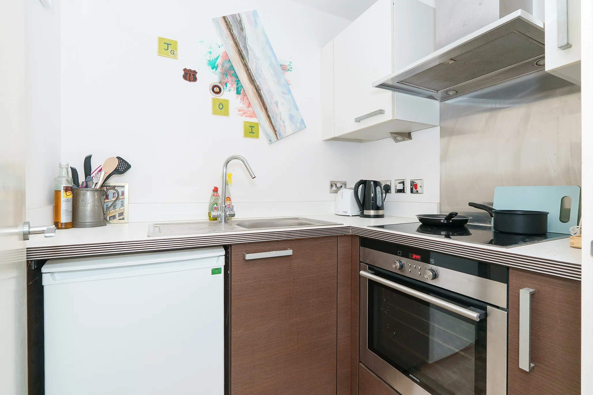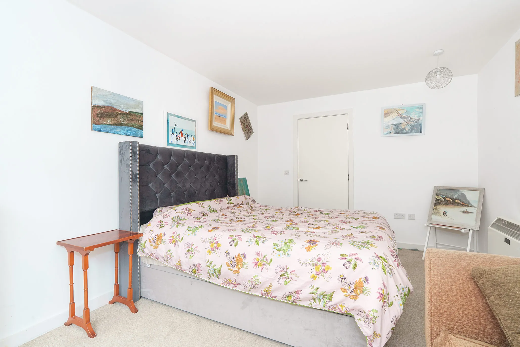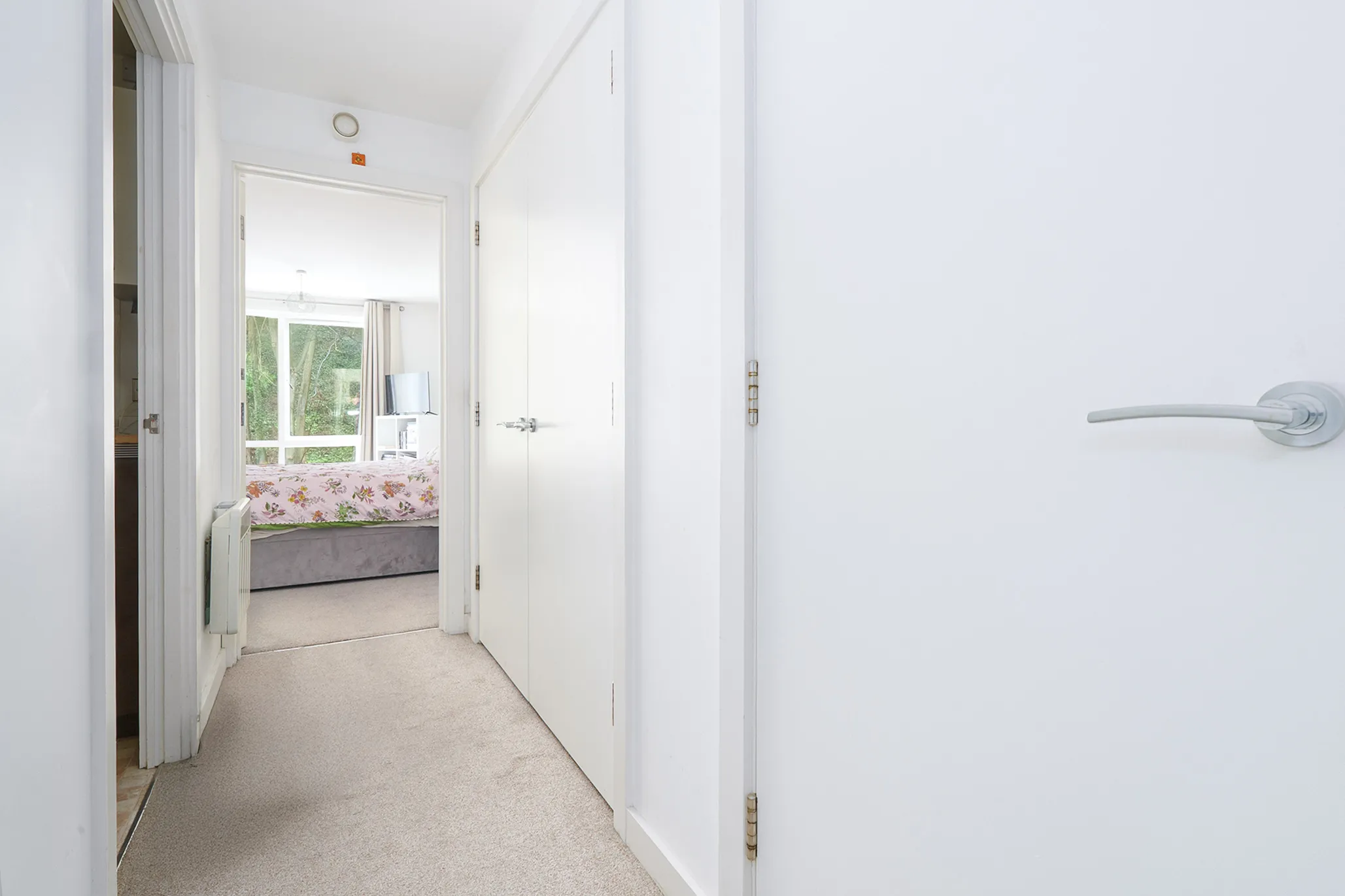 The apartment itself benefits from modern fixtures and fittings throughout. The accommodation comprises an entrance hallway with two large storage cupboards, an open-plan living/bedroom area, and a separate modern kitchen and bathroom.