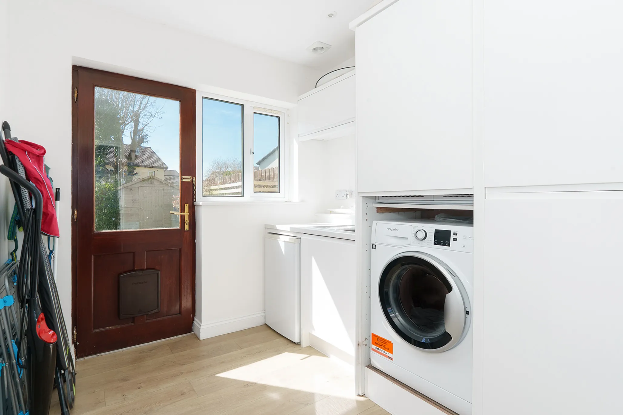 Beautifully presented throughout, the property offers spacious and versatile accommodation, ideal for a growing family. The ground floor features a comfortable living room which opens into a stunning dining kitchen, creating a superb open-plan space. French doors lead directly onto the landscaped south-facing rear garden, making it perfect for both everyday living and entertaining. A utility room adds practicality, while access is provided to the converted garage, now utilised as a family room or study.