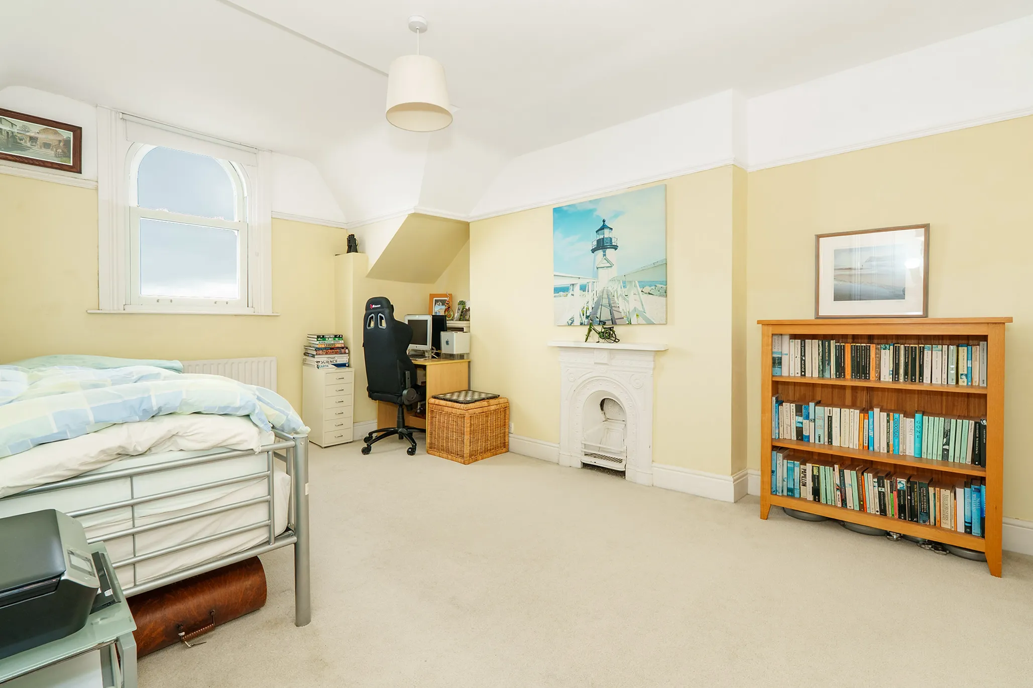 The upper floors provide excellent bedroom accommodation, including a principal bedroom suite complemented by an en-suite bathroom, along with four further double bedrooms and two additional bathrooms, ensuring comfort and flexibility for all family members. The upper levels also enjoy some distant sea and countryside views, enhancing the home’s sense of space and setting.