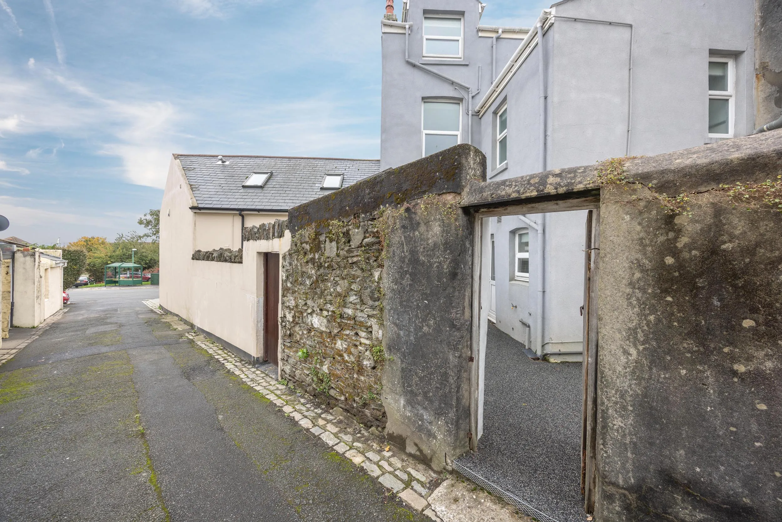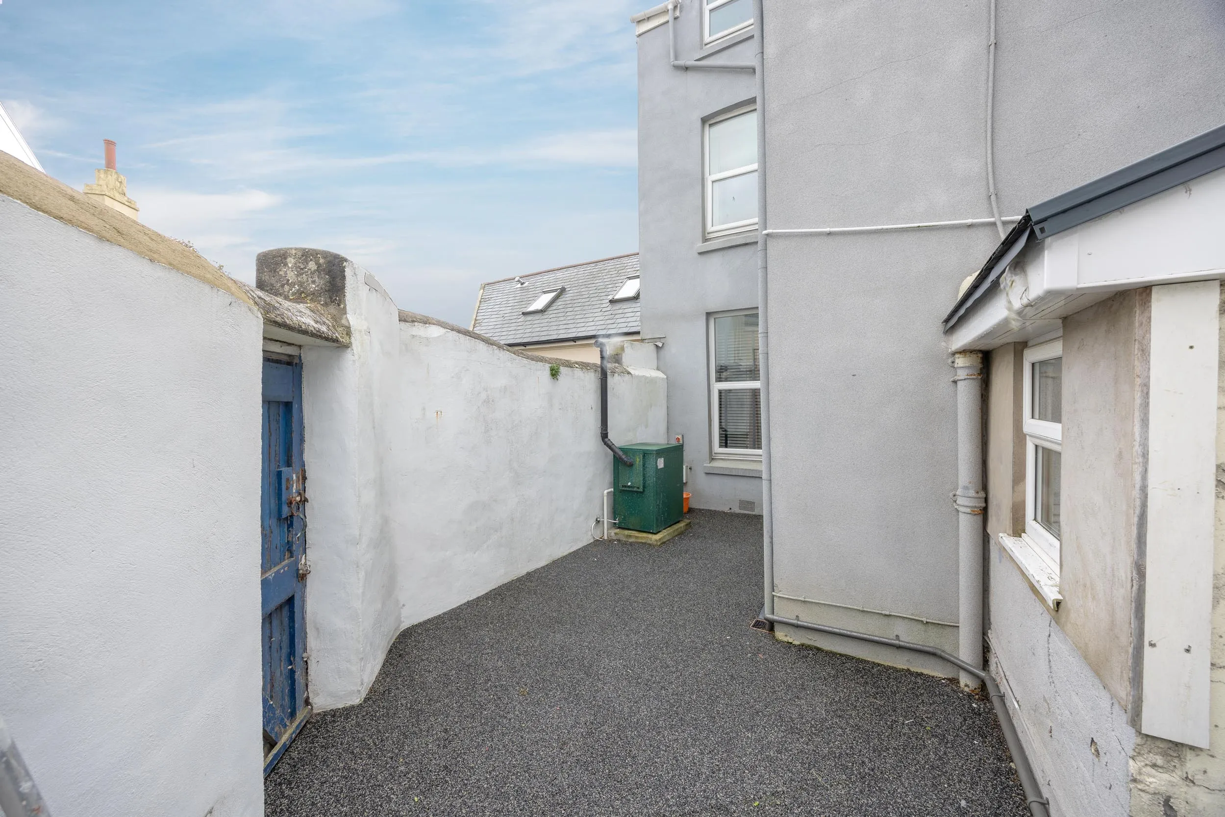 Outside, a courtyard-style rear garden offers a low-maintenance space with access to the service lane.