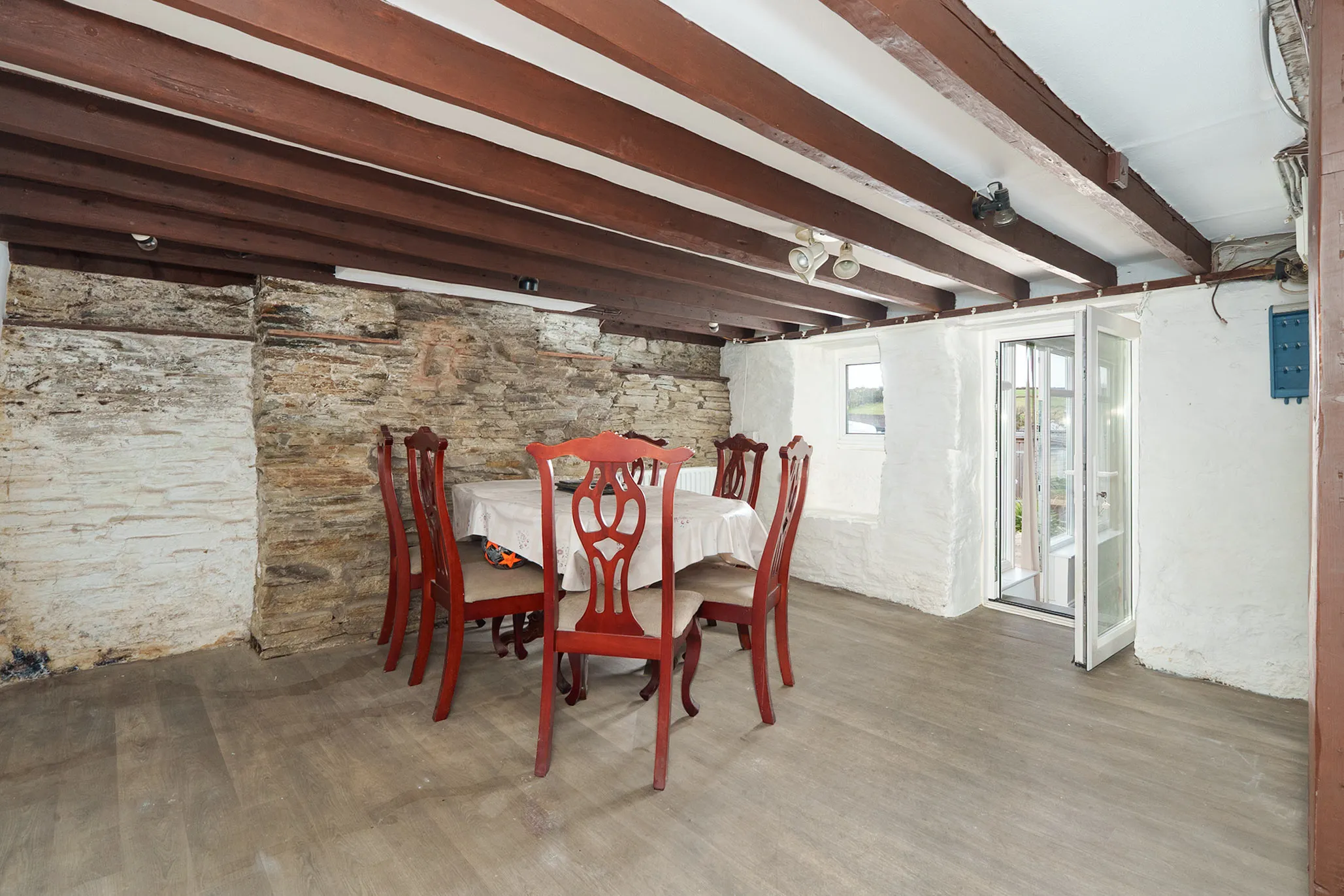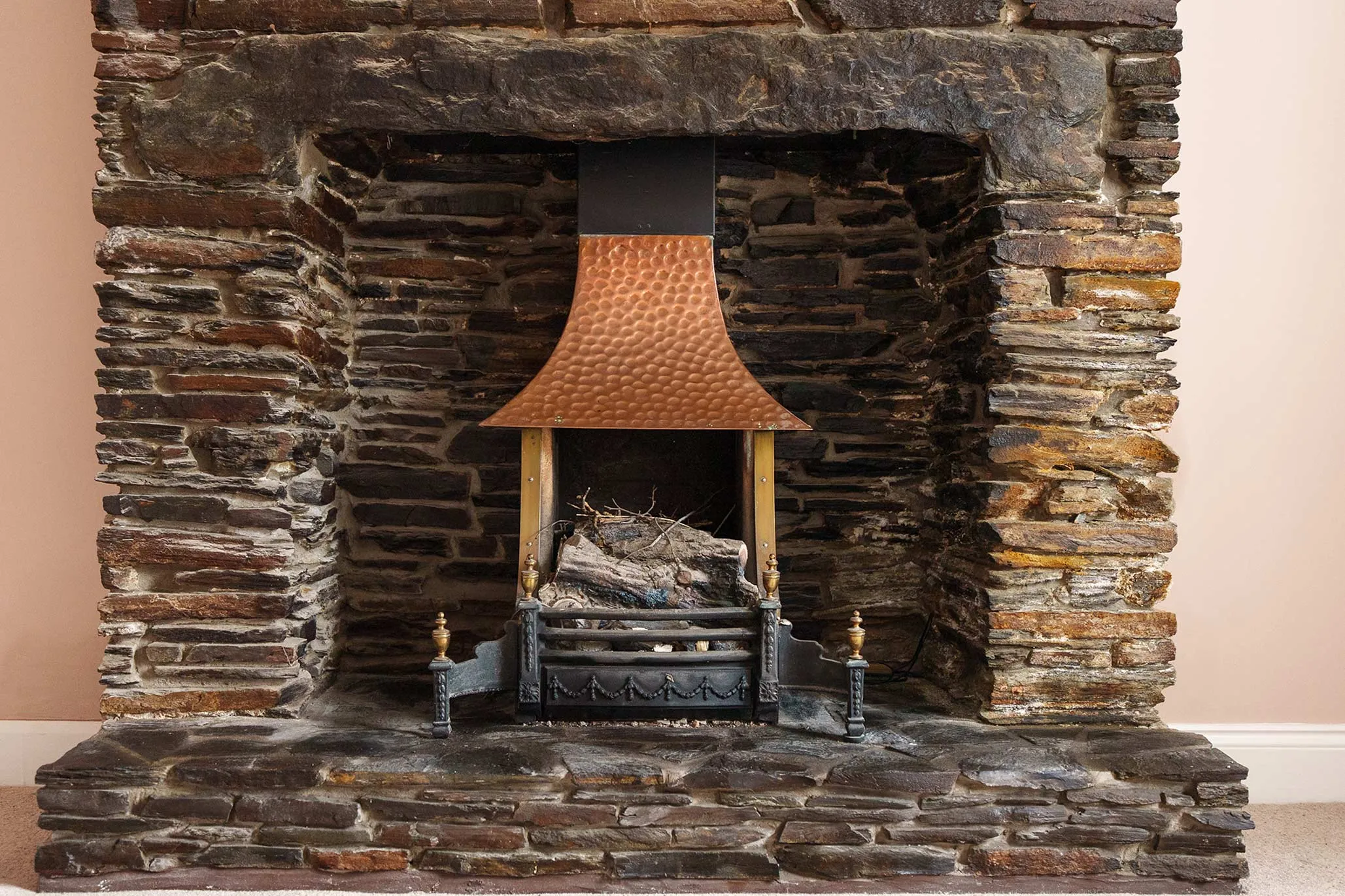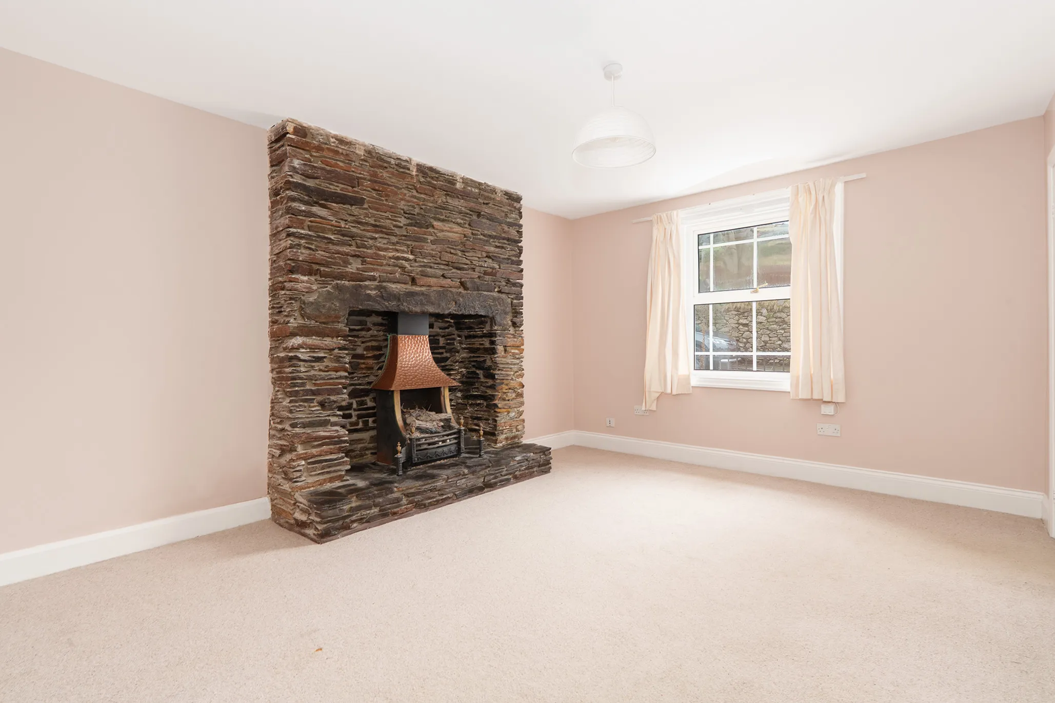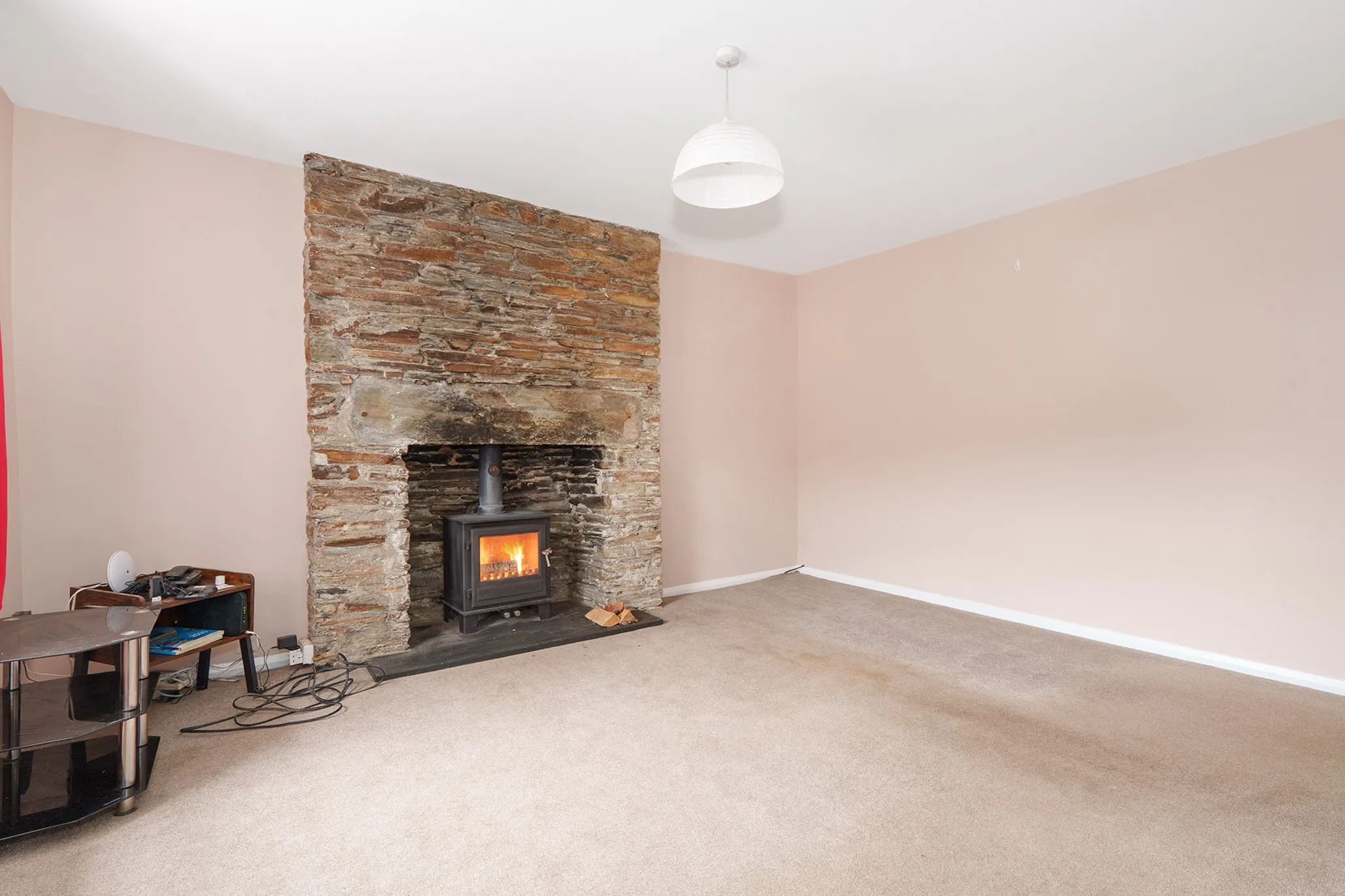 The main accommodation comprises an entrance porch leading into a hallway, a charming living room with a feature exposed stone fireplace, and a lower ground floor dining room with access to a breakfast kitchen. There are three bedrooms, a separate home office, an en-suite shower room, and a family bathroom, offering flexible and well-proportioned living space.