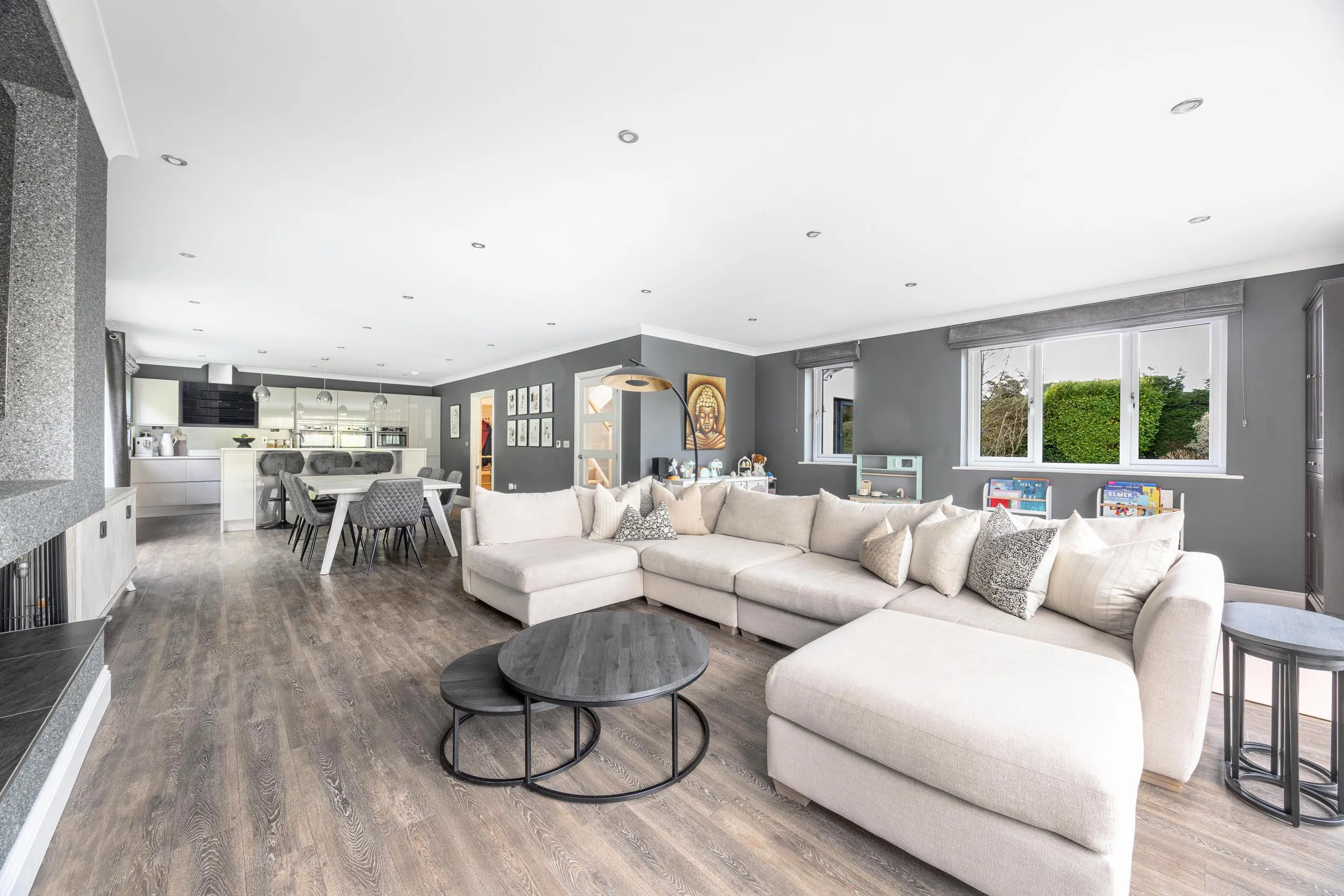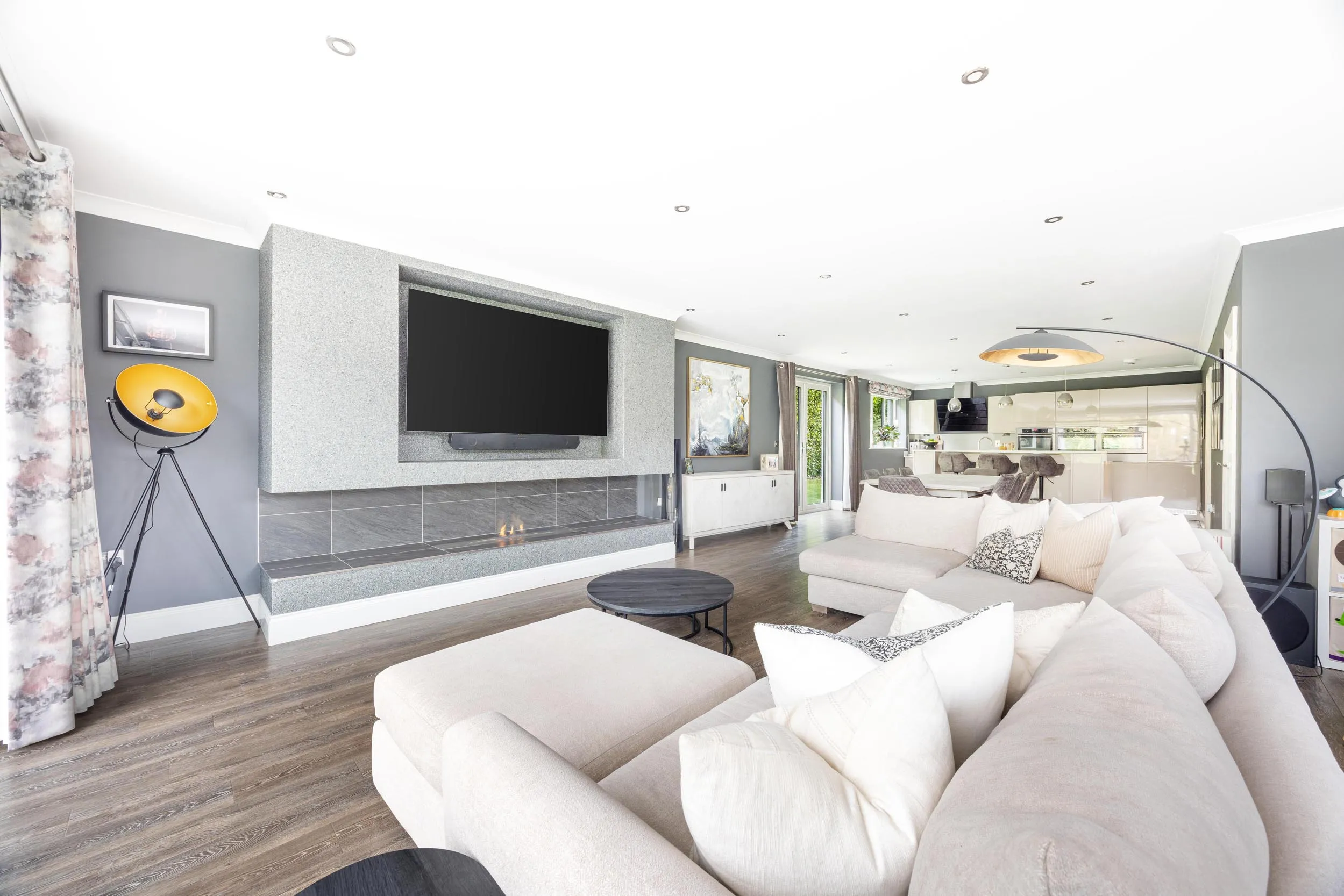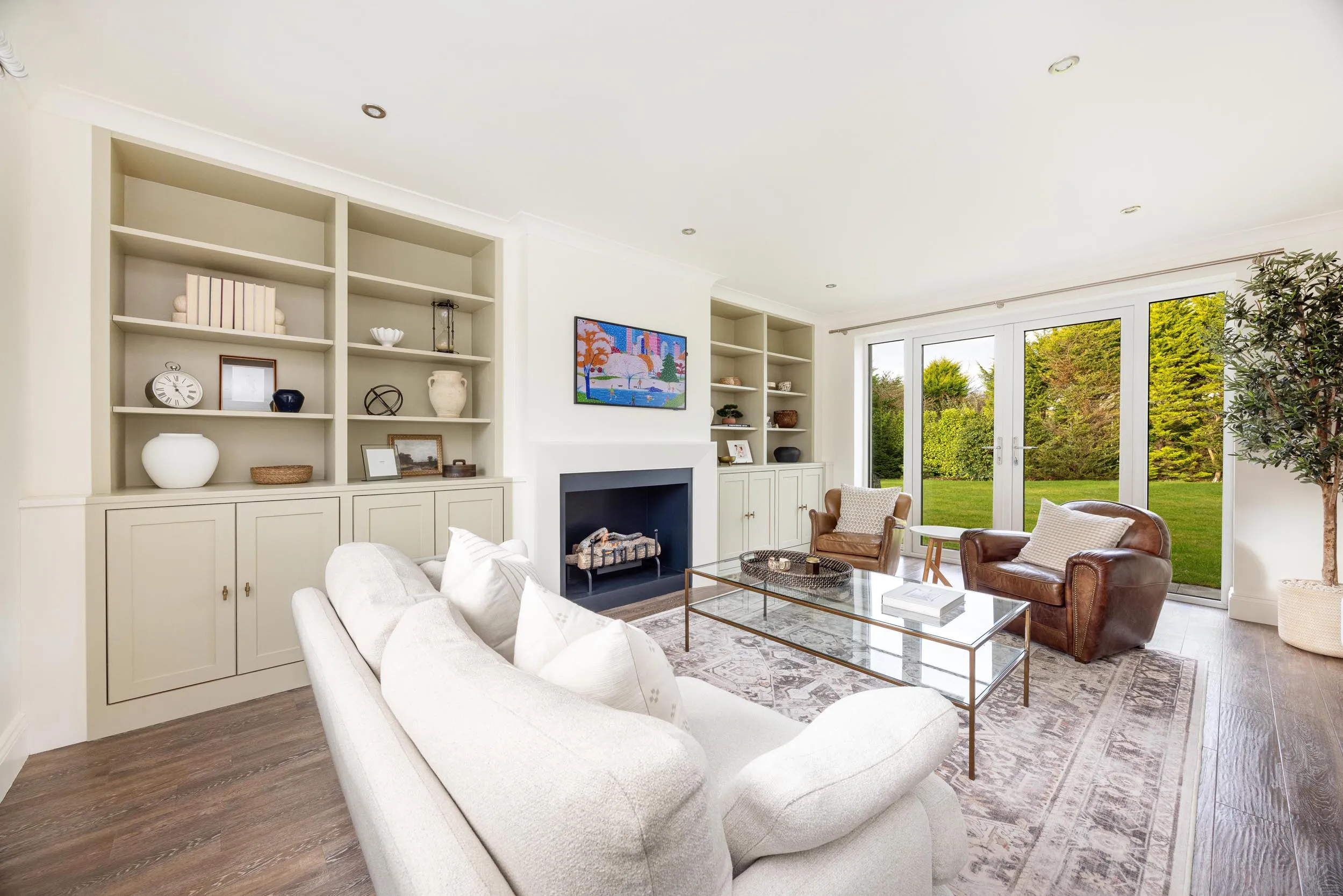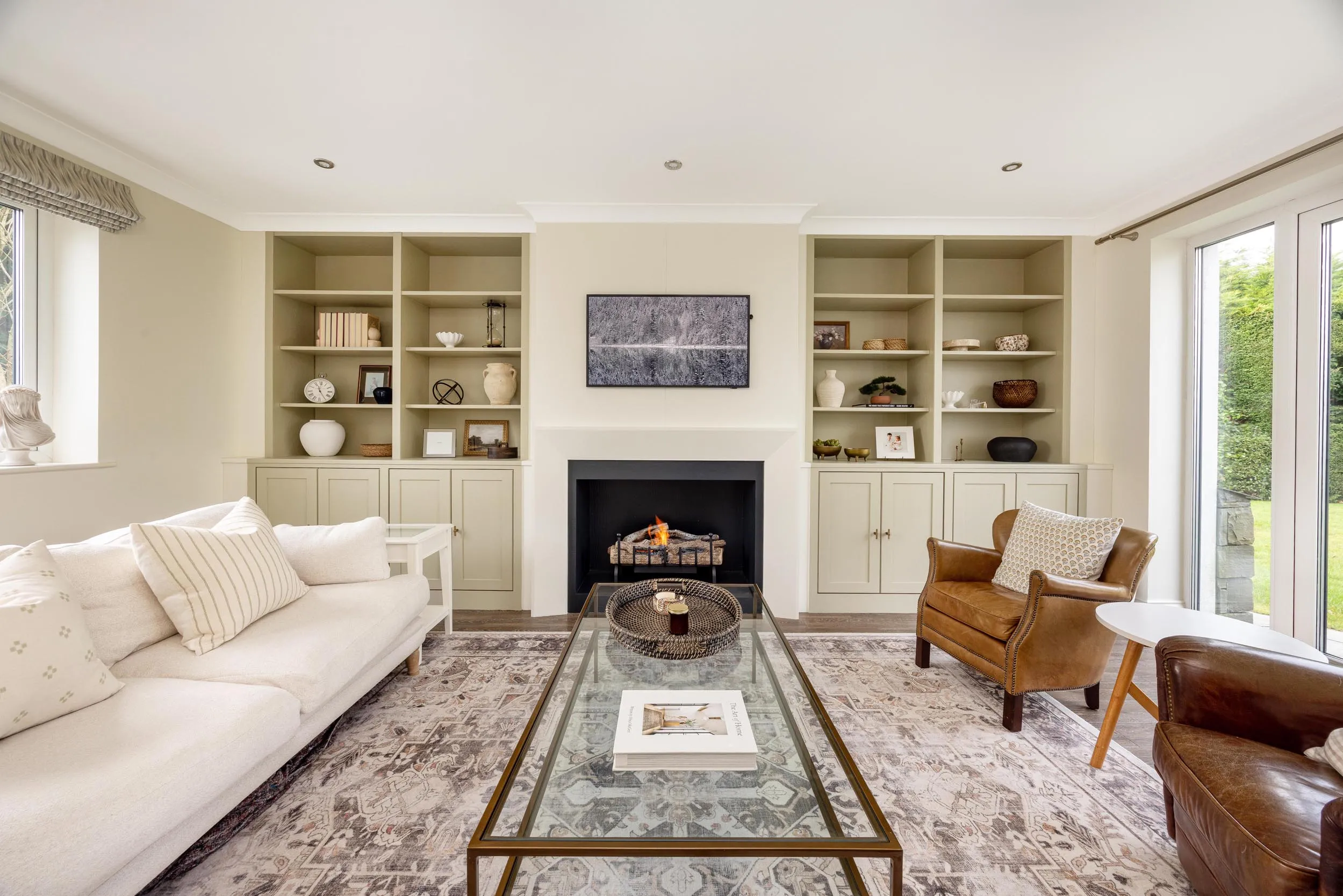 A grand entrance hall welcomes you into the home, leading to generously proportioned living spaces featuring high-quality fixtures and fittings throughout. The living room is a striking space, featuring custom bespoke display cabinetry and a sophisticated bioethanol feature fire, with floor-to-ceiling glazed doors opening directly onto the gardens, effortlessly blending indoor and outdoor living. A dedicated ground floor study provides a calm and practical workspace.