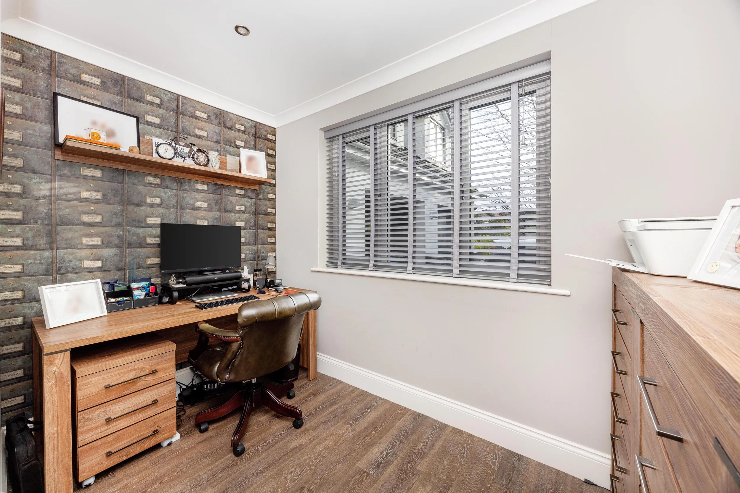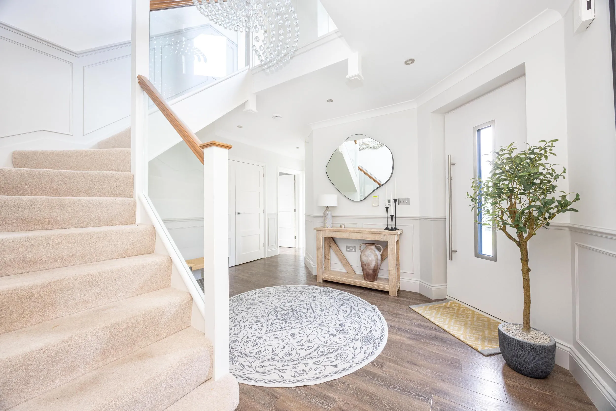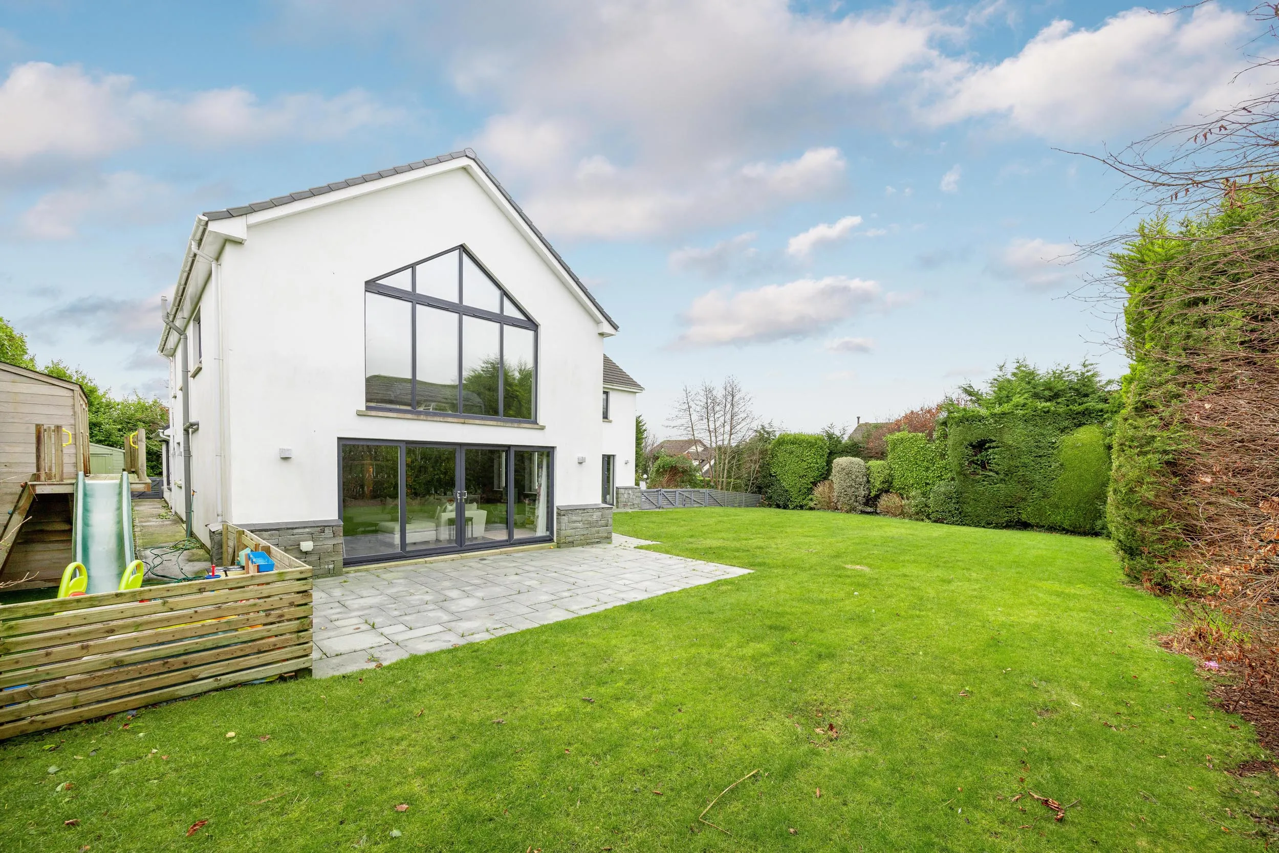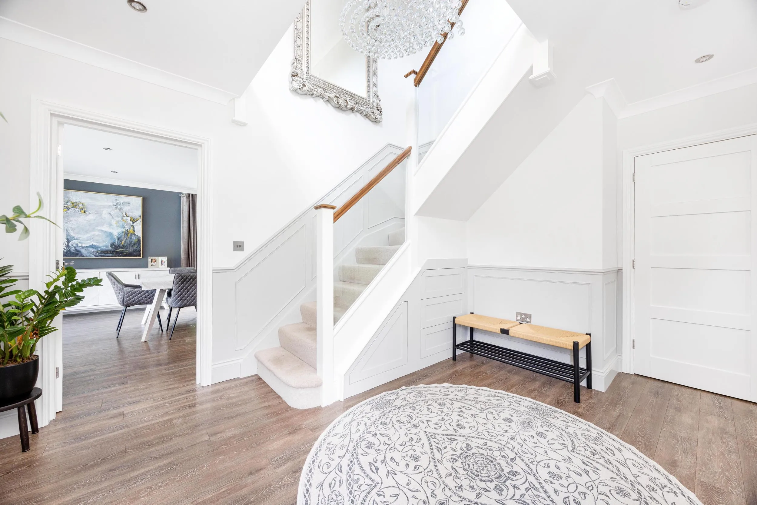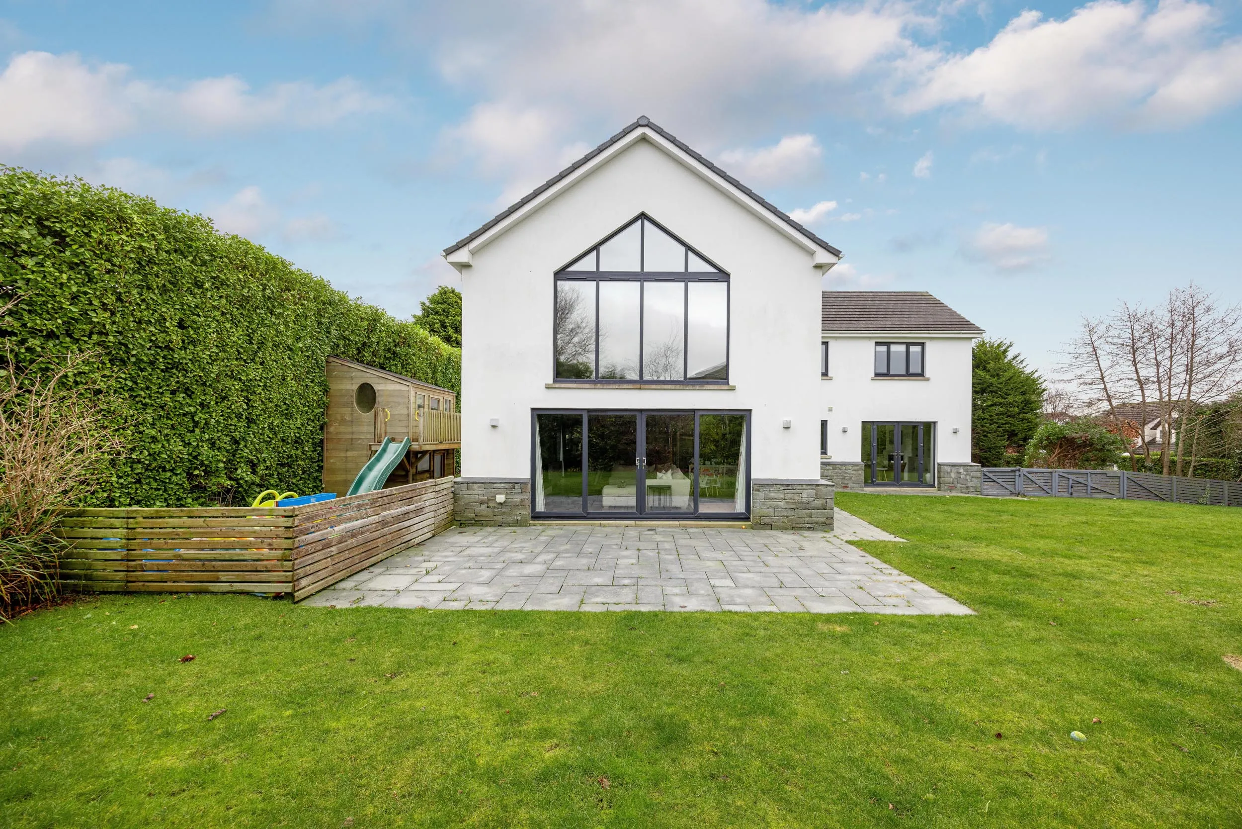 A grand entrance hall welcomes you into the home, leading to generously proportioned living spaces featuring high-quality fixtures and fittings throughout. The living room is a striking space, featuring custom bespoke display cabinetry and a sophisticated bioethanol feature fire, with floor-to-ceiling glazed doors opening directly onto the gardens, effortlessly blending indoor and outdoor living. A dedicated ground floor study provides a calm and practical workspace.