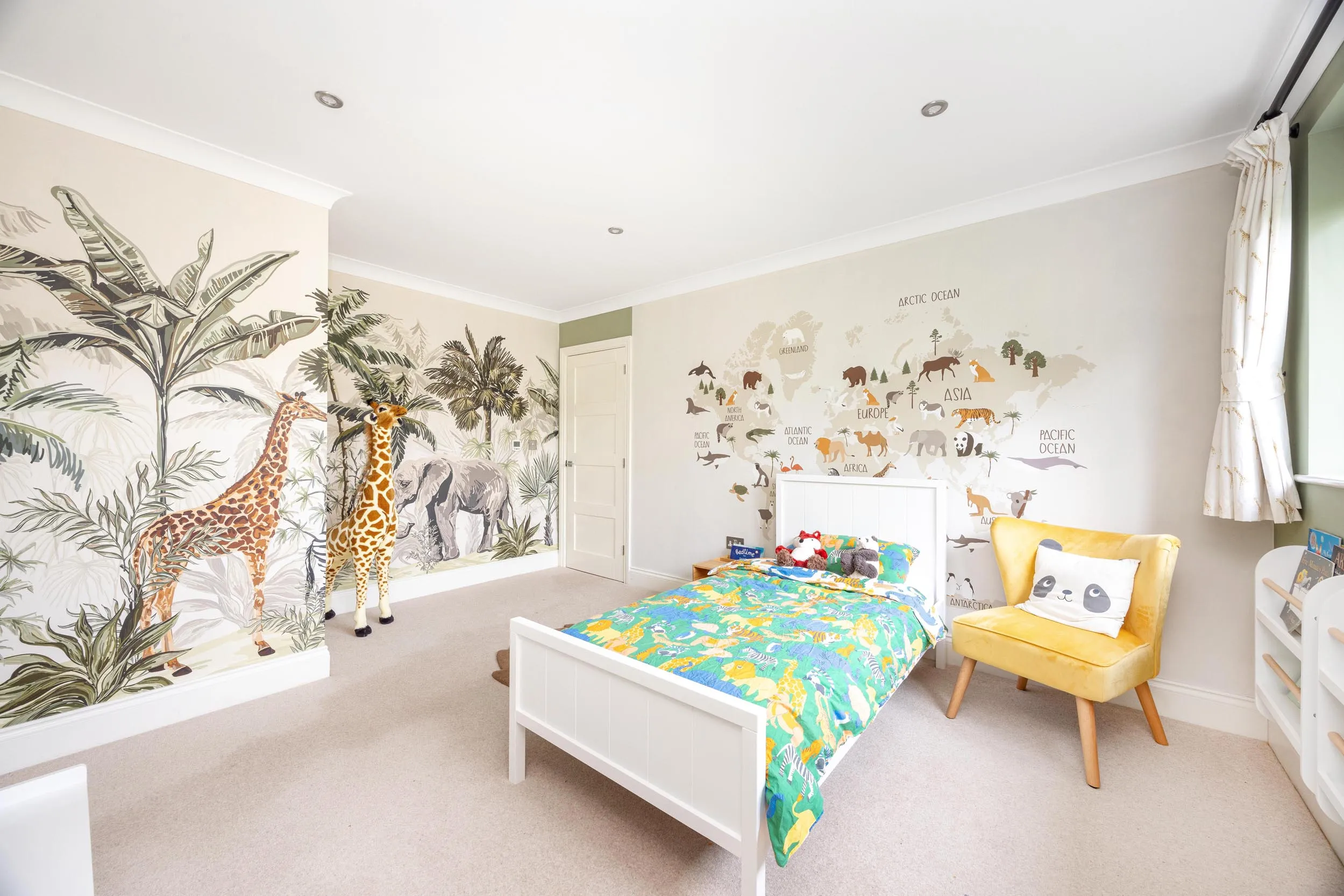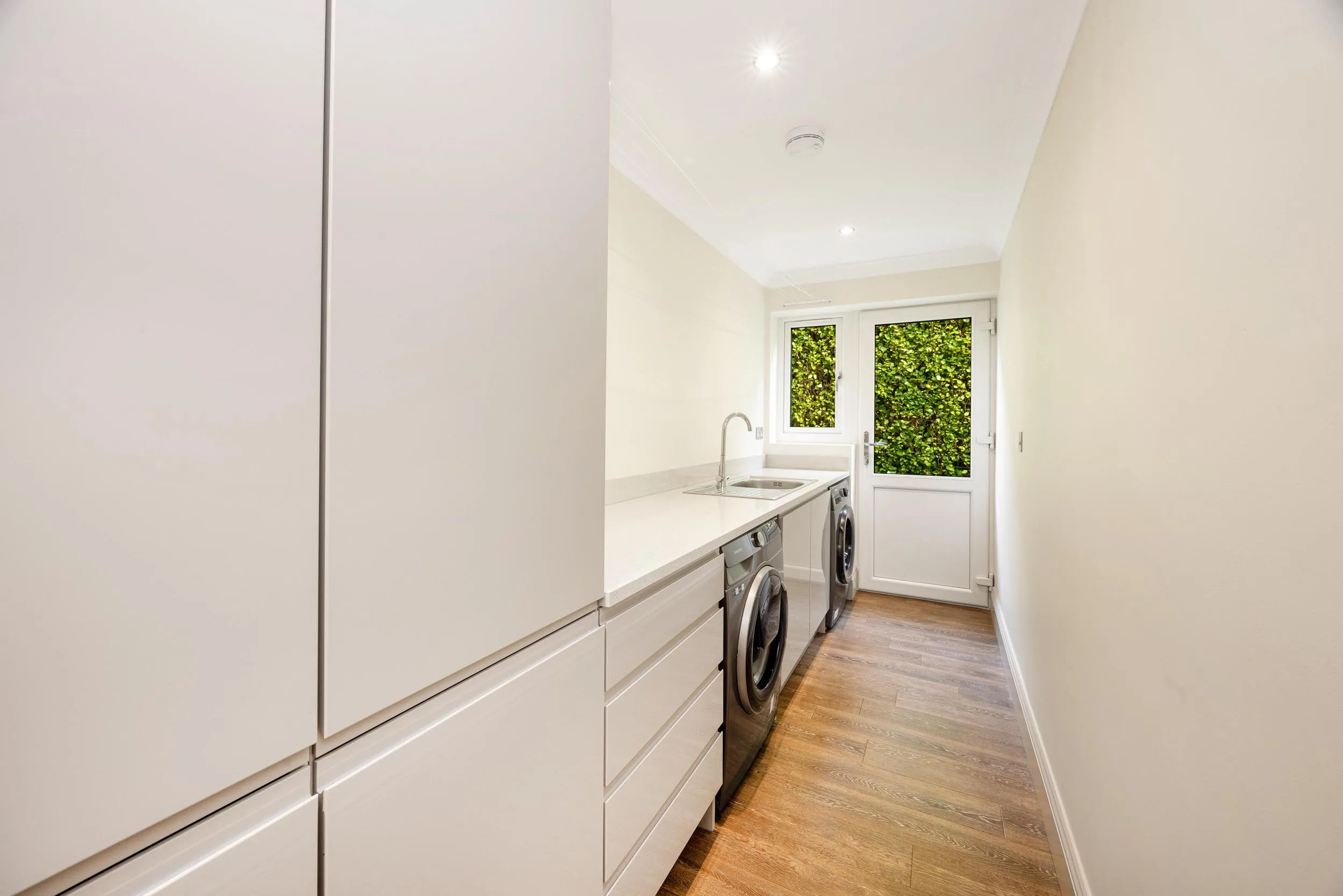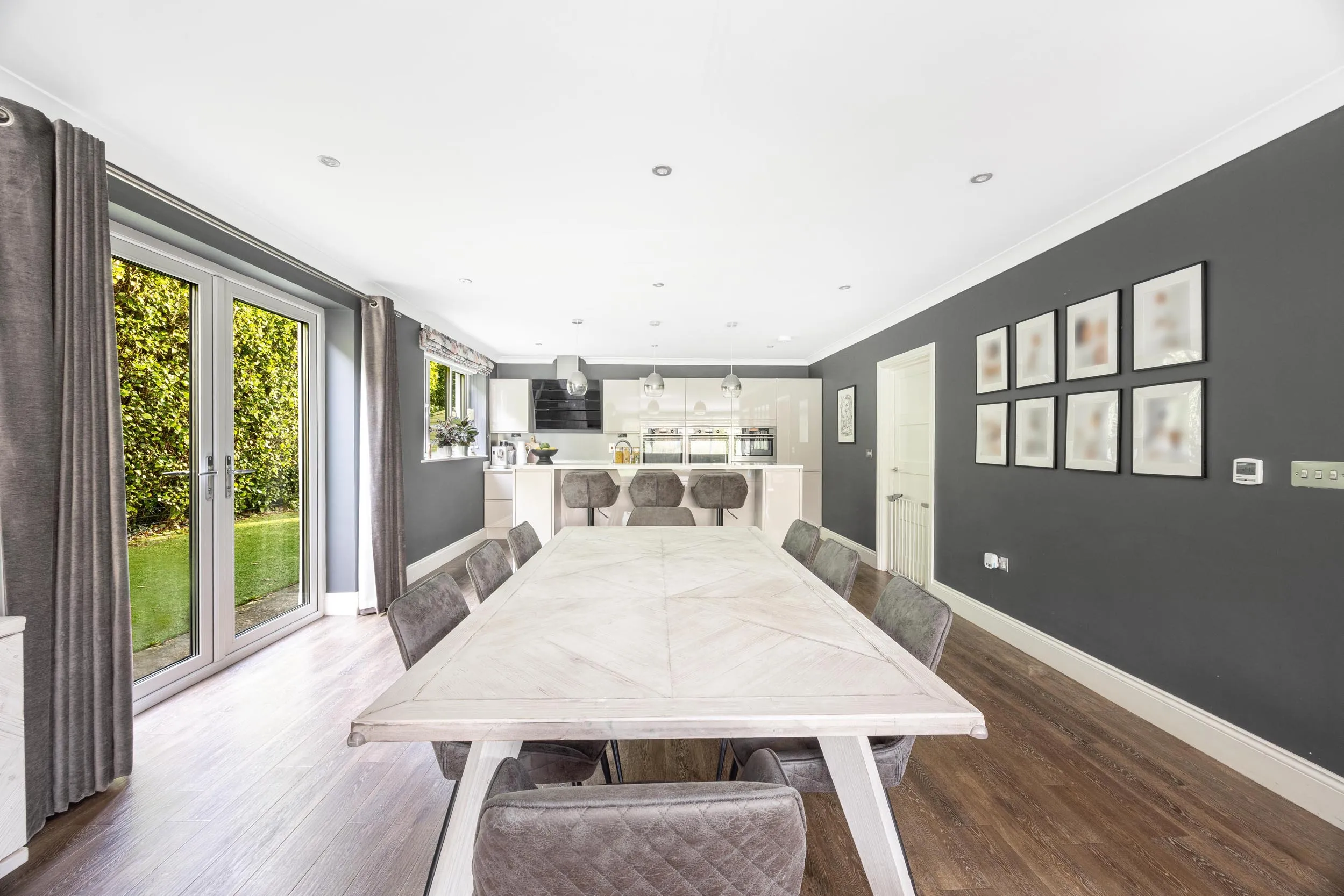The “super room” forms the heart of the home - a spectacular contemporary dining kitchen flowing seamlessly into a spacious family area. Enhanced by a feature fire and bespoke media wall, the space is designed for both entertaining and relaxed family life, with full-height glazed doors connecting to the gardens and filling the room with natural light. Additional practical spaces include a generous utility/boot room and a ground floor cloakroom (WC).