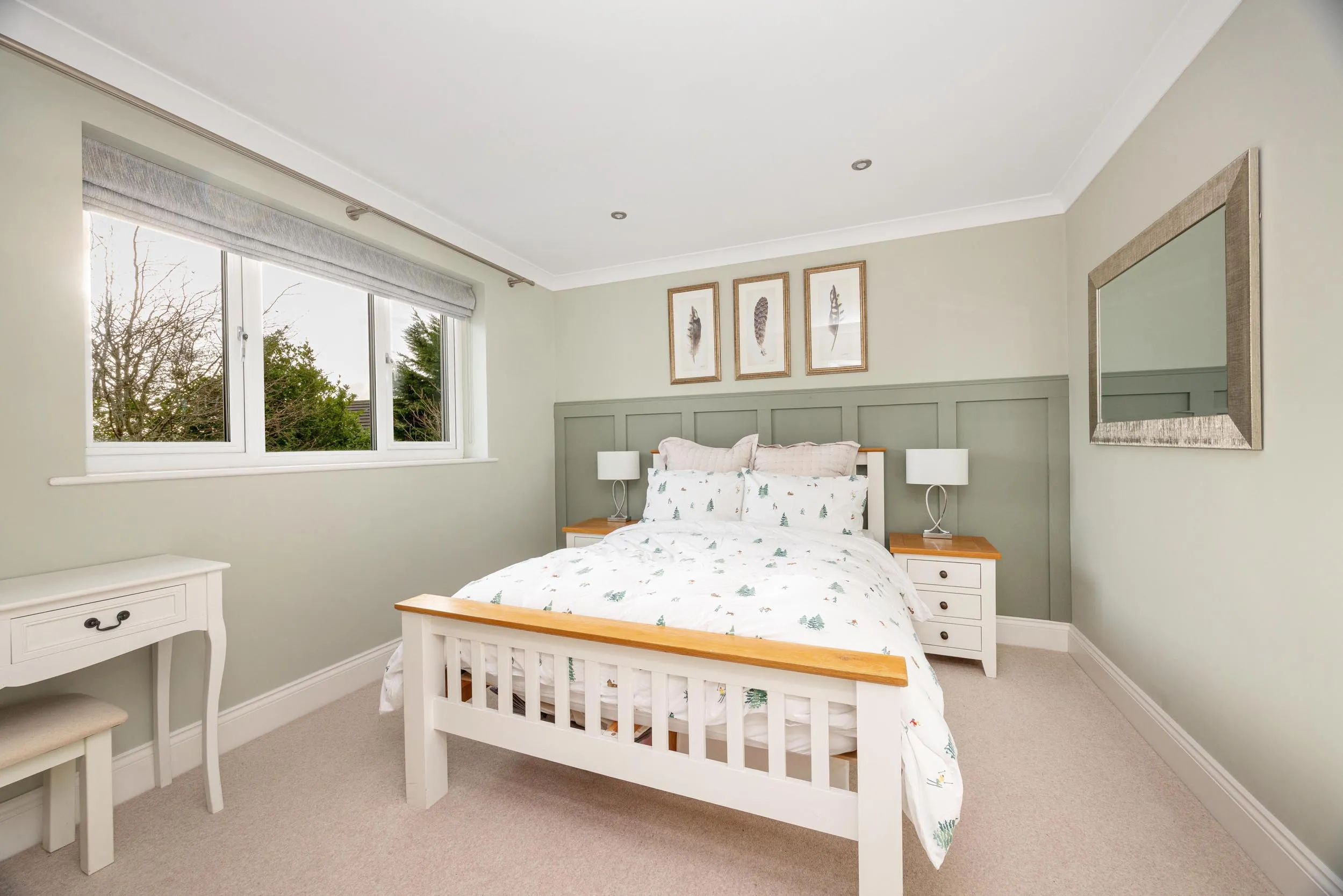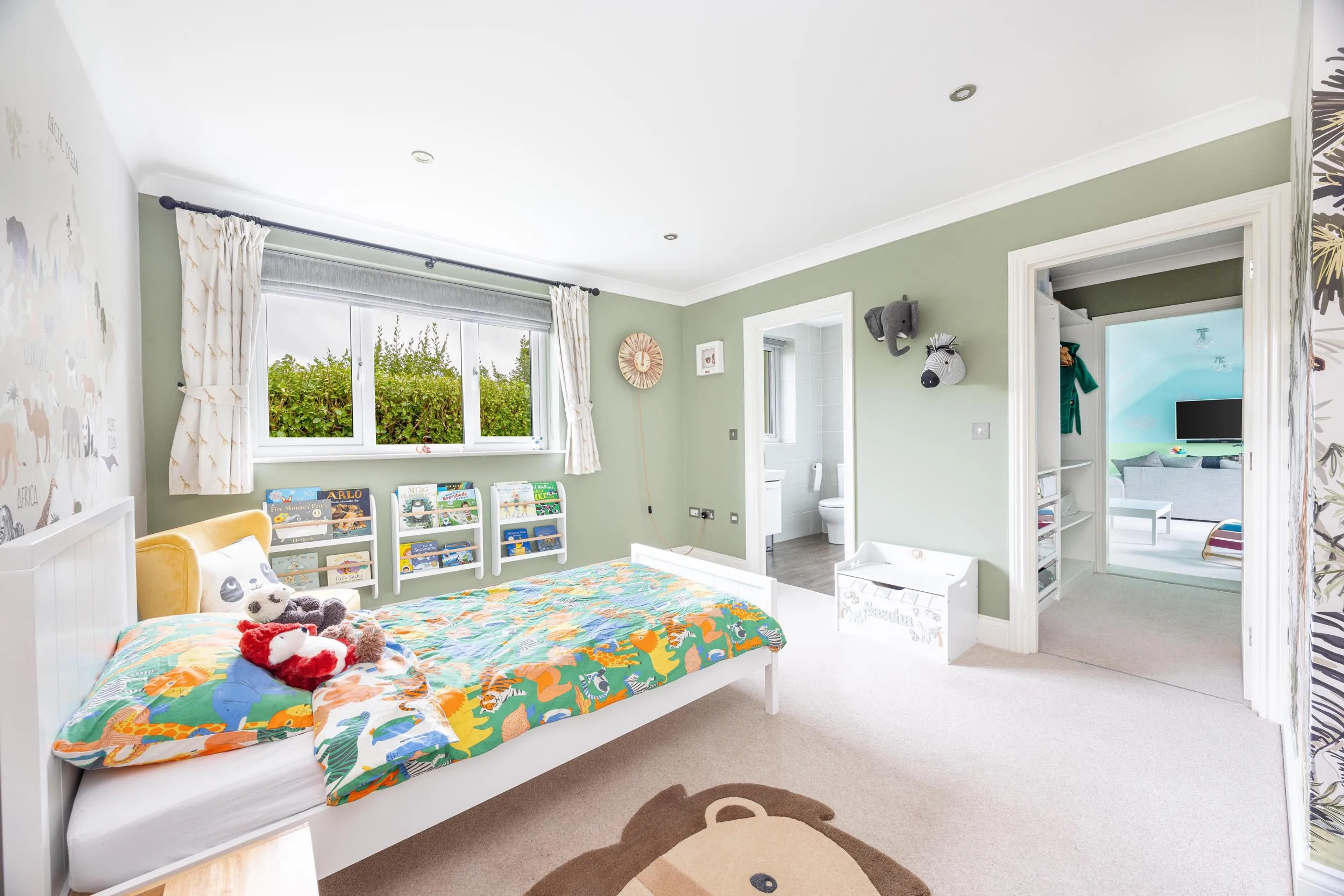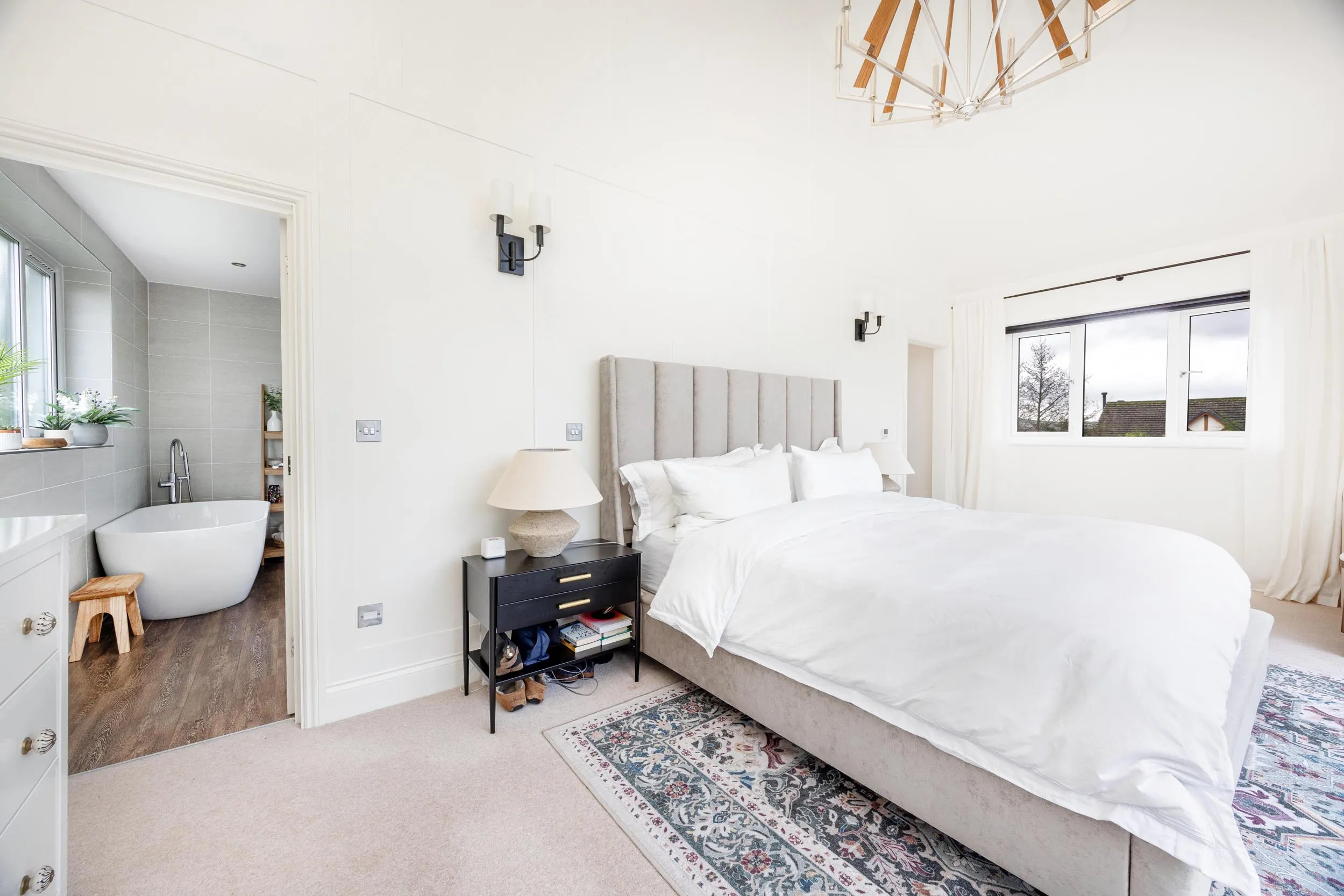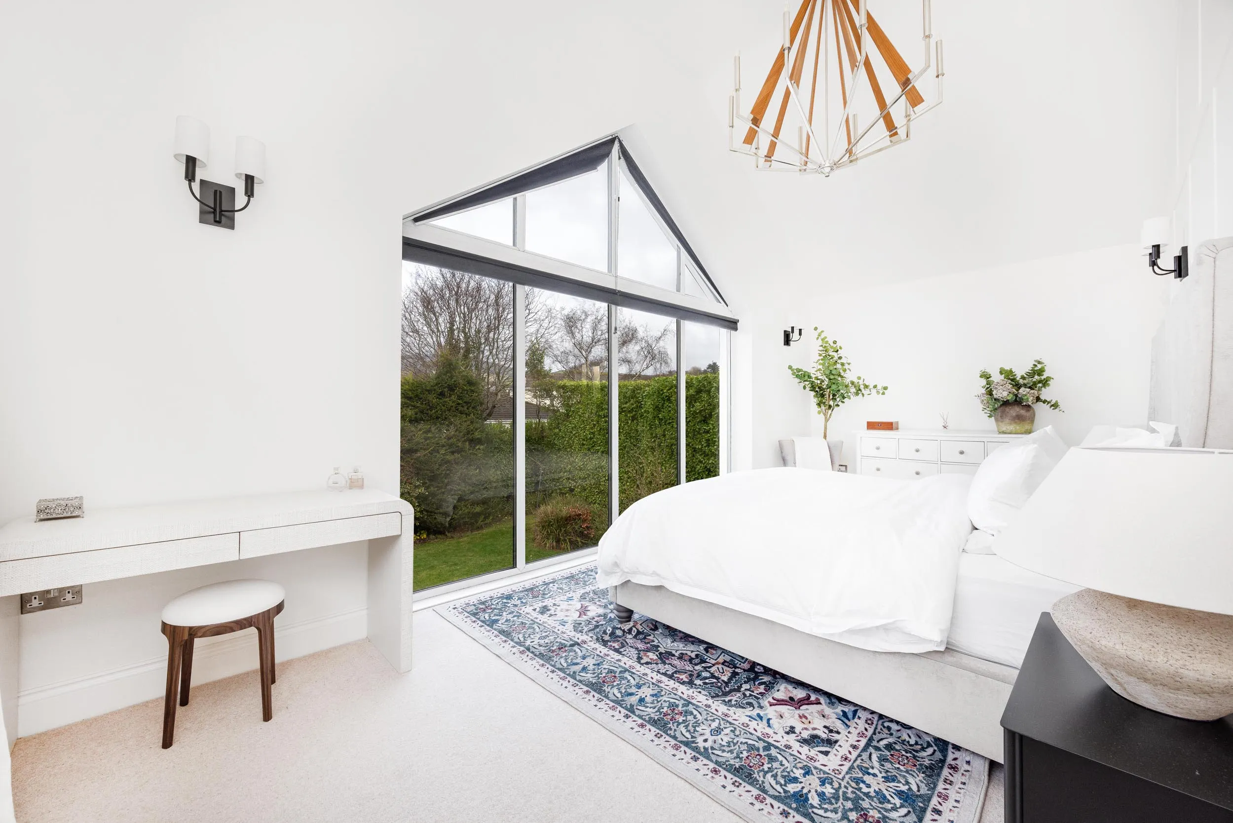 The bedroom accommodation is equally impressive, comprising four luxurious double bedroom suites, each complemented by walk-in dressing rooms and beautifully appointed en-suite bathrooms. The principal suite is a true highlight, featuring a vaulted open feature ceiling and a stunning glazed elevation that frames the beautifully landscaped wrap-around gardens, creating a serene and indulgent sanctuary.