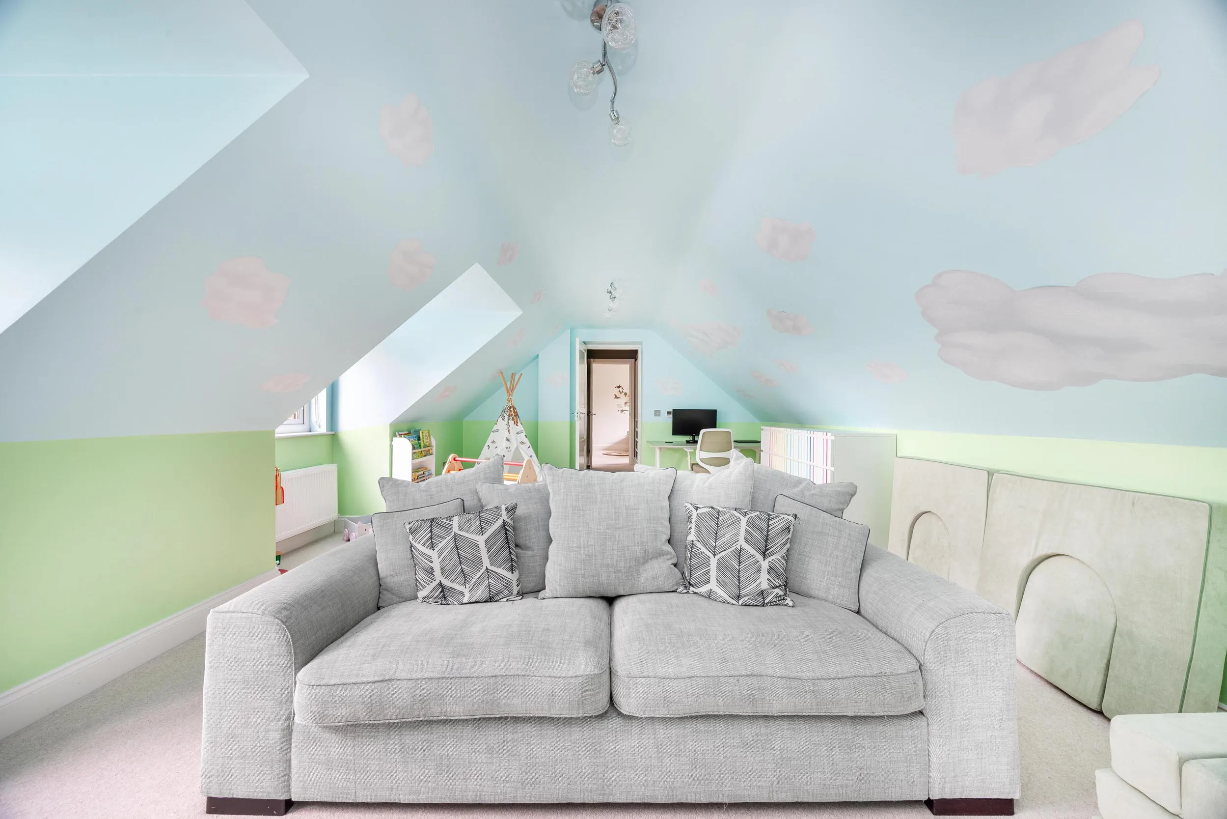 Upstairs, the first floor offers exceptional versatility, with a family/play room accessed via the second bedroom, providing a private retreat for children, hobbies, or informal living.