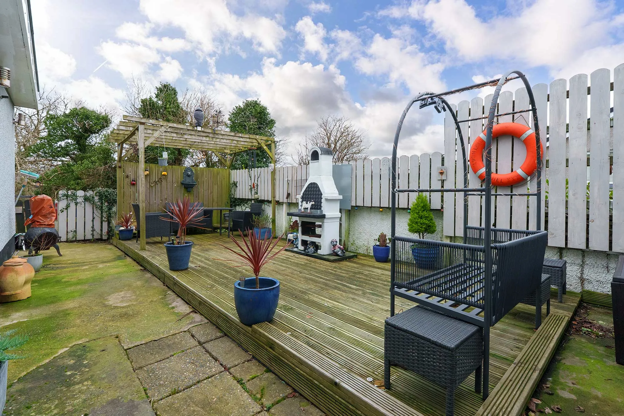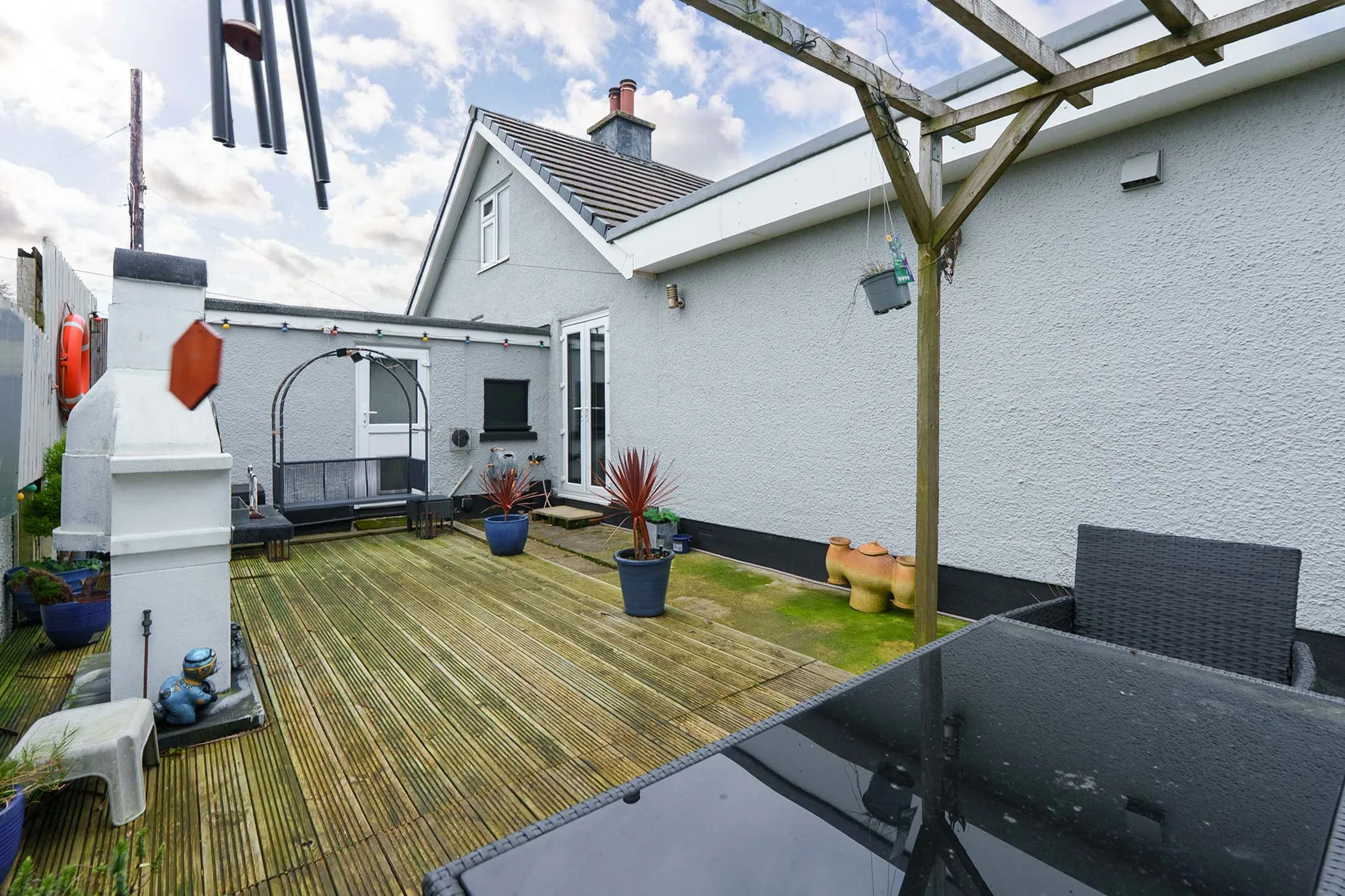 - Externally there is a decking area to the side of the property with pergola and a south facing lawned garden to the rear which borders a feild