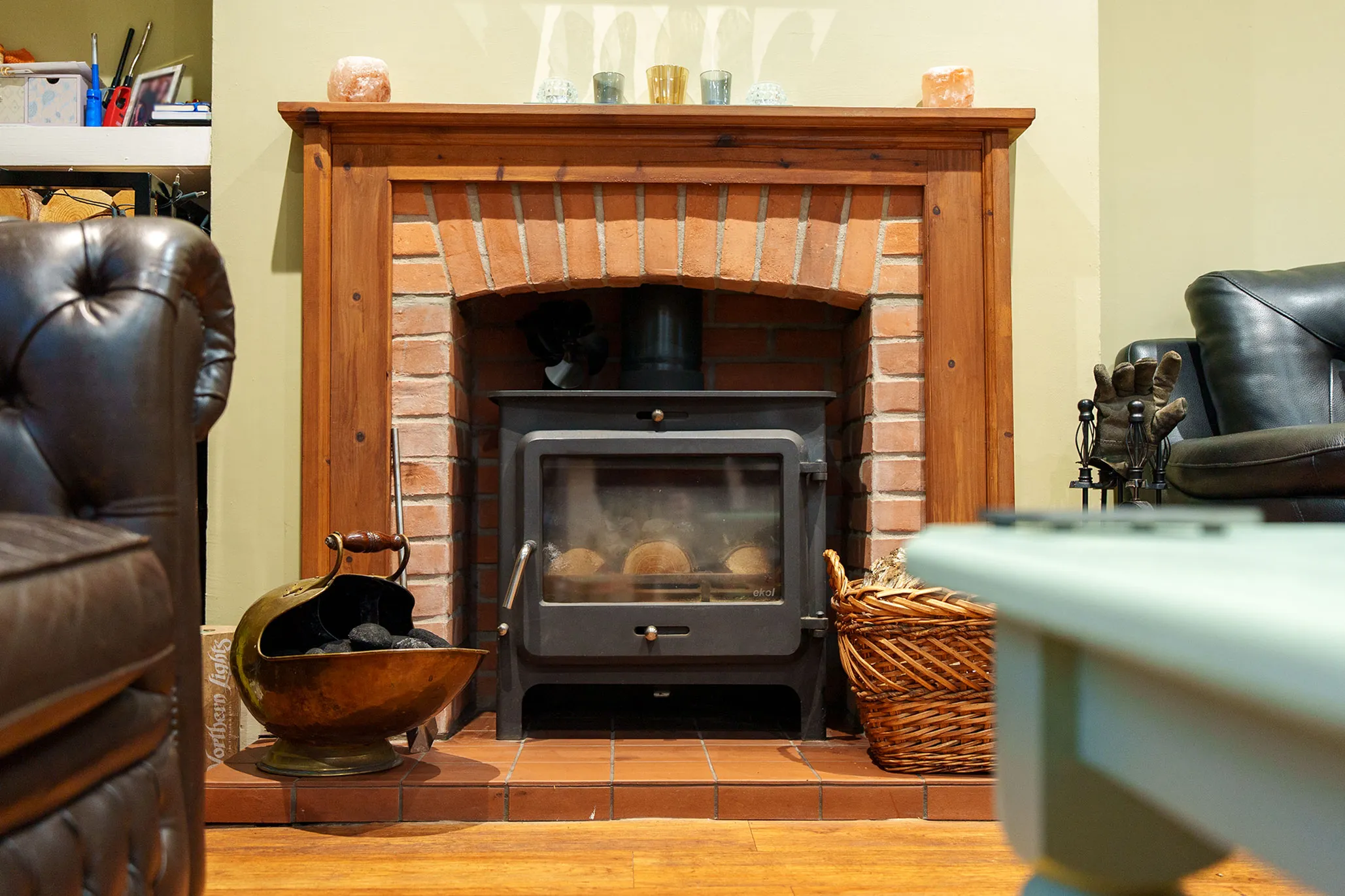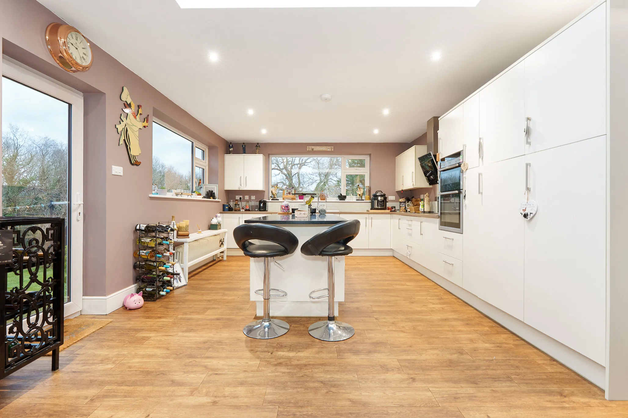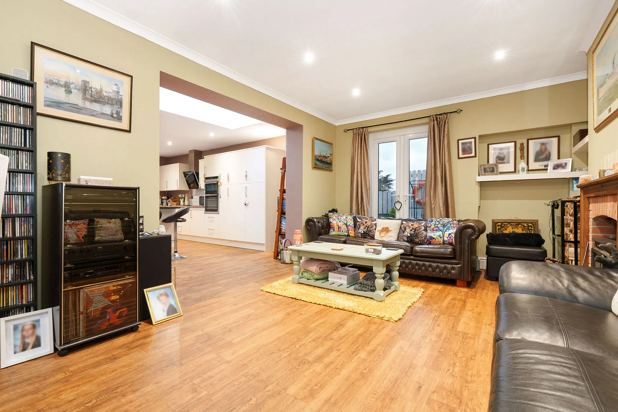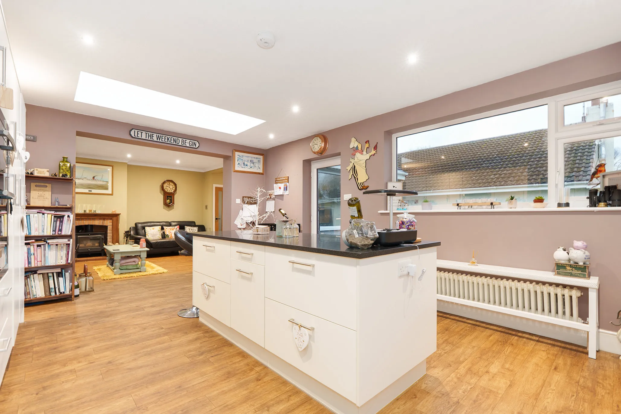 - Impressive 30ft open plan living dining room with log burner and a square opening through to a modern stylish kitchen extension with island and breakfast bar
