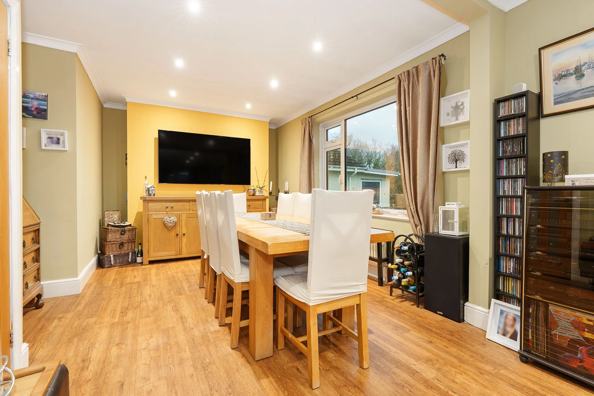 The accommodation is well presented throughout and offers a flexible layout ideal for modern family living. A standout feature is the impressive 30ft open-plan living and dining room, complete with a log burner and a square opening leading through to a stylish modern kitchen extension featuring an island and breakfast bar. An additional family room, currently arranged as a home bar and hobbies room, further enhances the versatility of the living space.