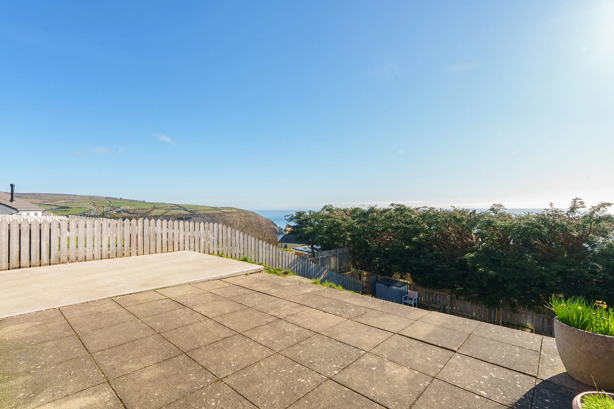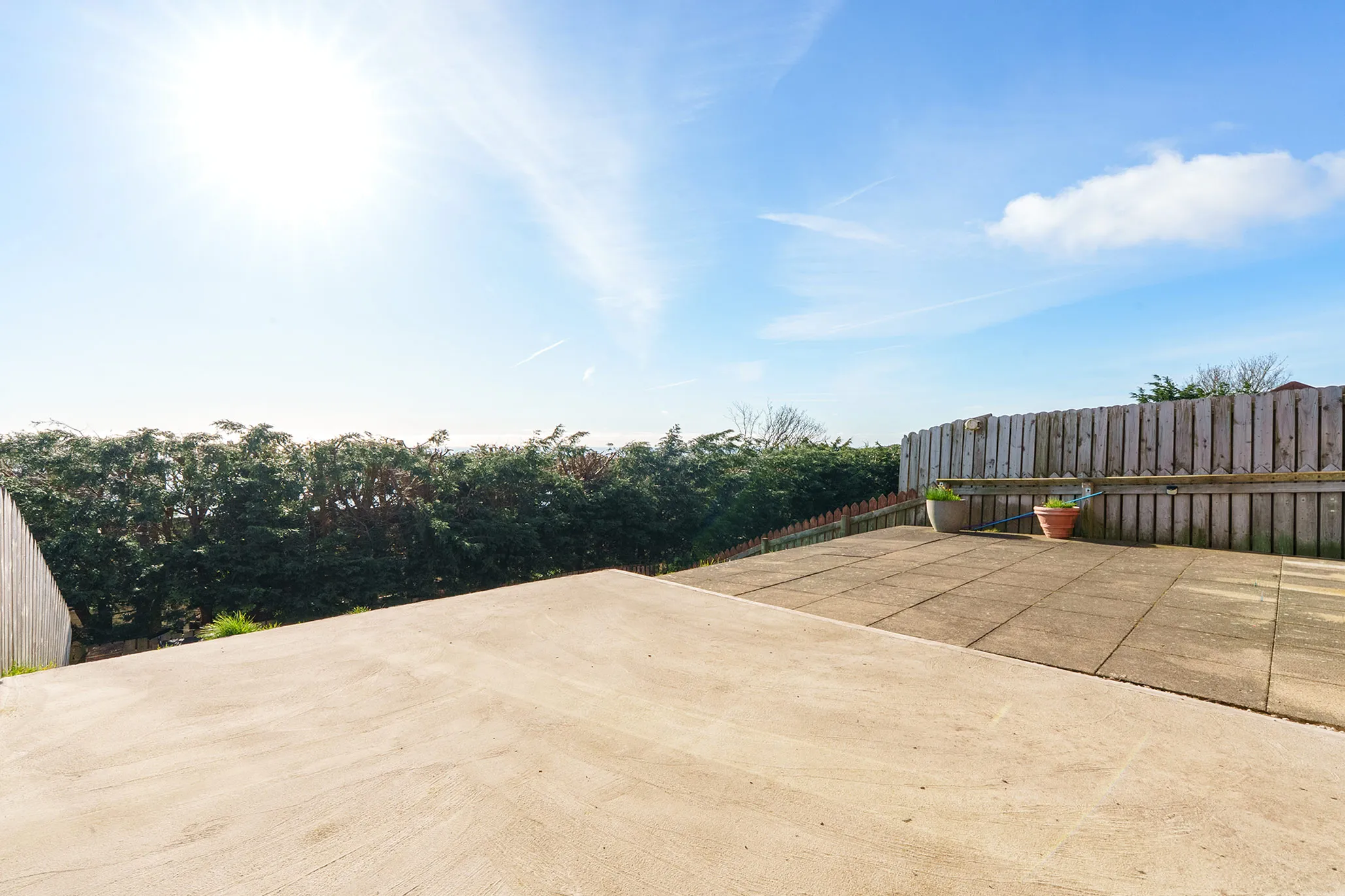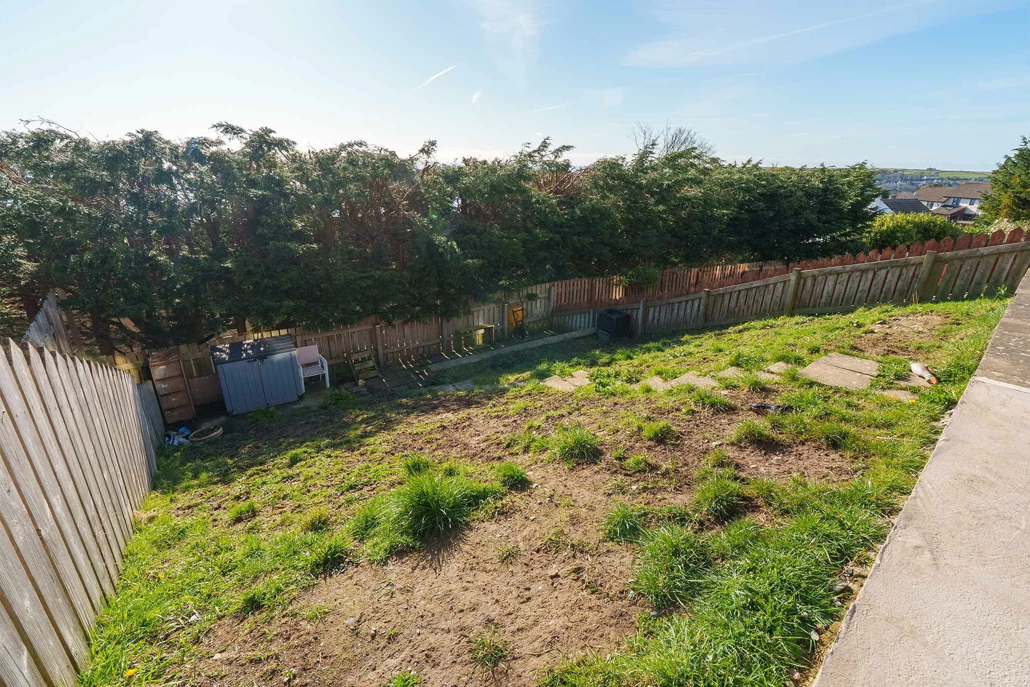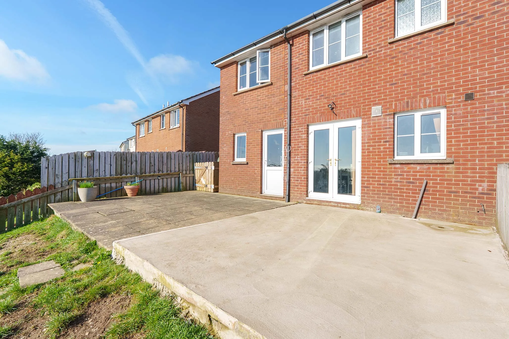 Externally, the property benefits from a driveway providing off-road parking for multiple vehicles. To the rear is a generous paved patio and hardstanding seating area—perfect for alfresco dining and entertaining—along with a hillside lawned garden, offering additional outdoor space.