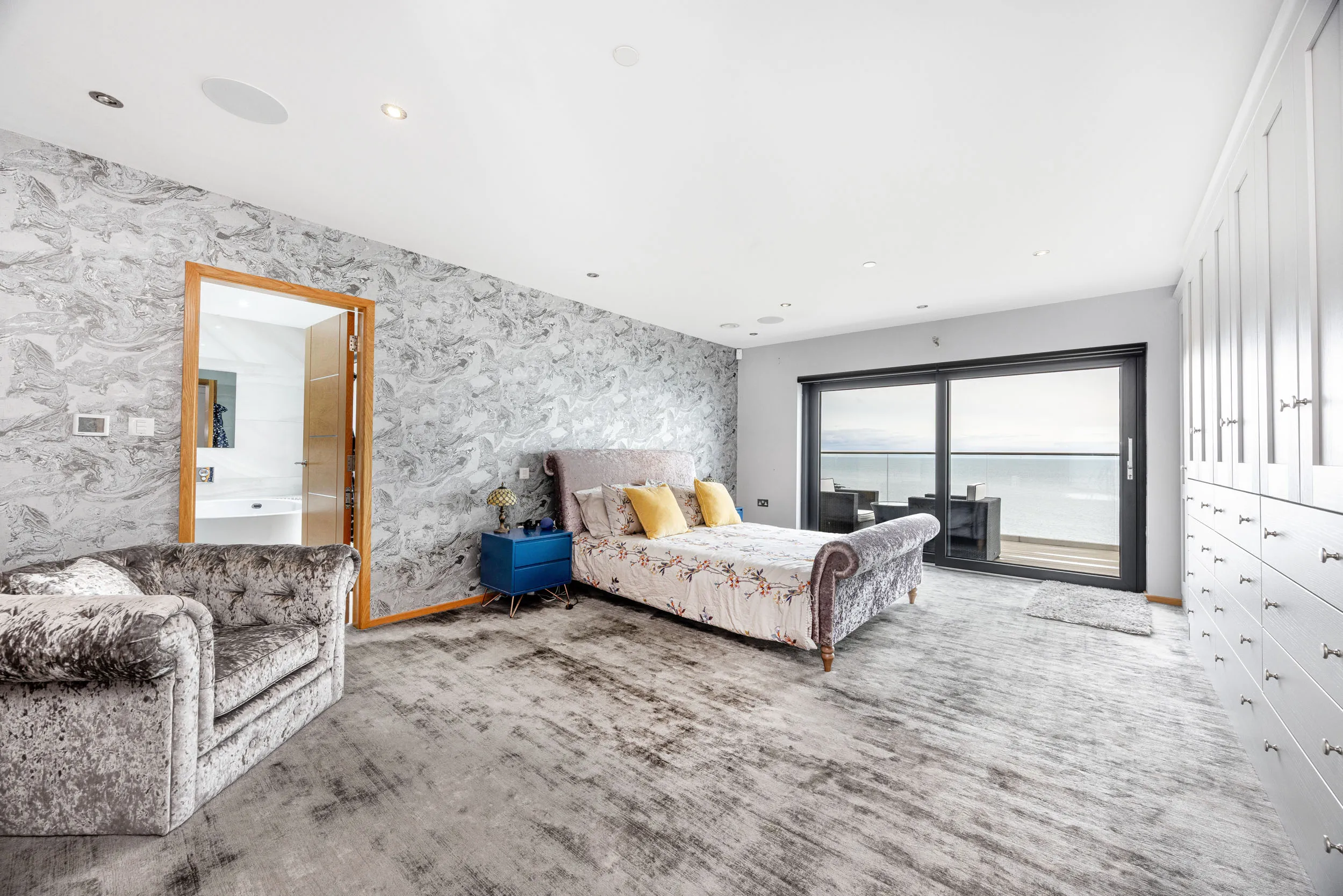 The second floor is dedicated to indulgence. The principal master suite is a sanctuary of calm, featuring a dressing room and a beautifully designed en-suite bathroom finished to an exacting standard. Its private balcony provides an elevated vantage point from which to enjoy the sweeping coastal panorama, creating a truly special setting at any time of day.