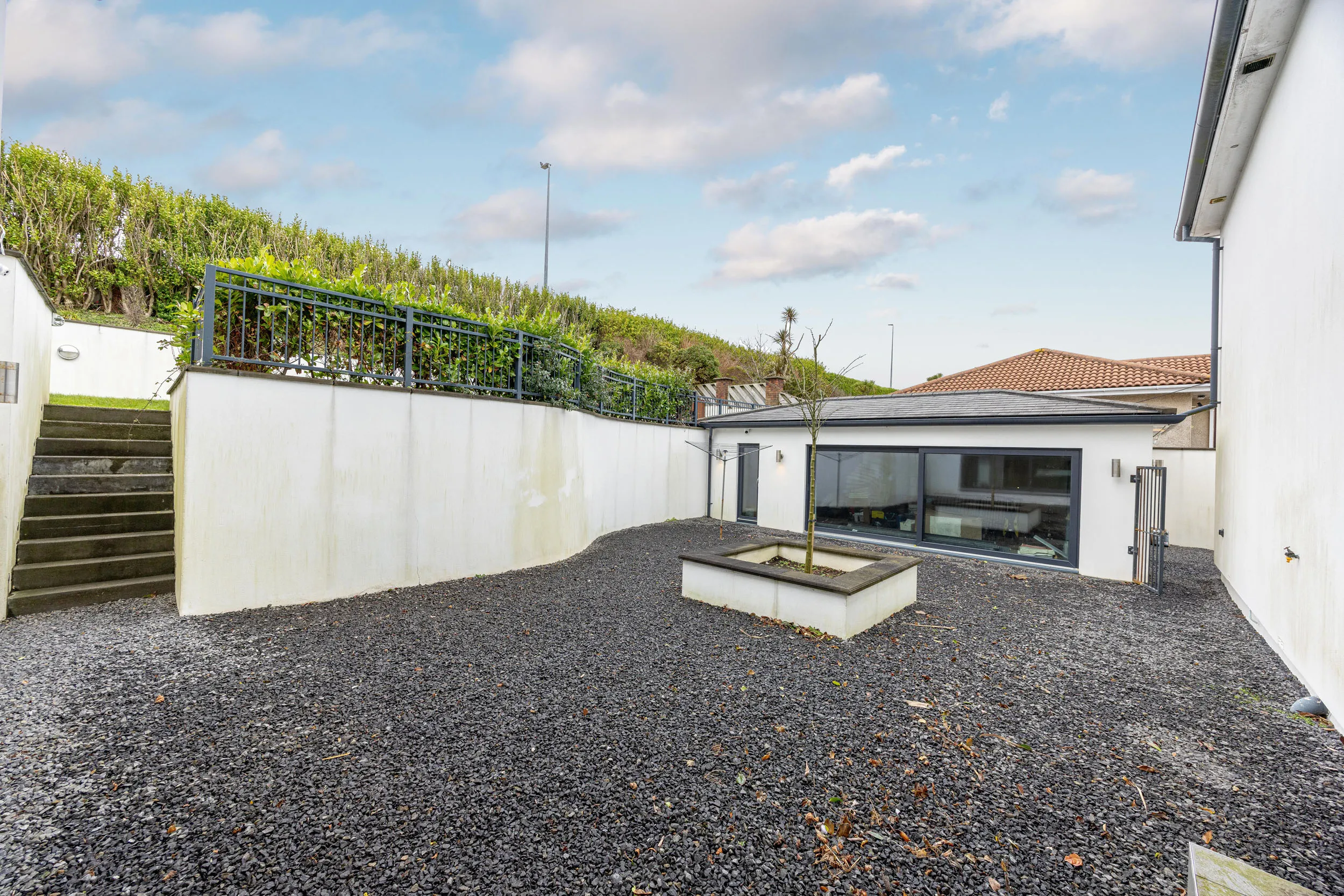 Externally, the property continues to deliver on lifestyle appeal. Lawned and beautifully landscaped gardens to the front and rear, paved terraces, balconies and a courtyard create a series of outdoor spaces designed for both relaxation and entertaining, all enhanced by the coastal setting. A gated driveway provides secure parking and leads to a detached garage, ensuring both practicality and privacy.