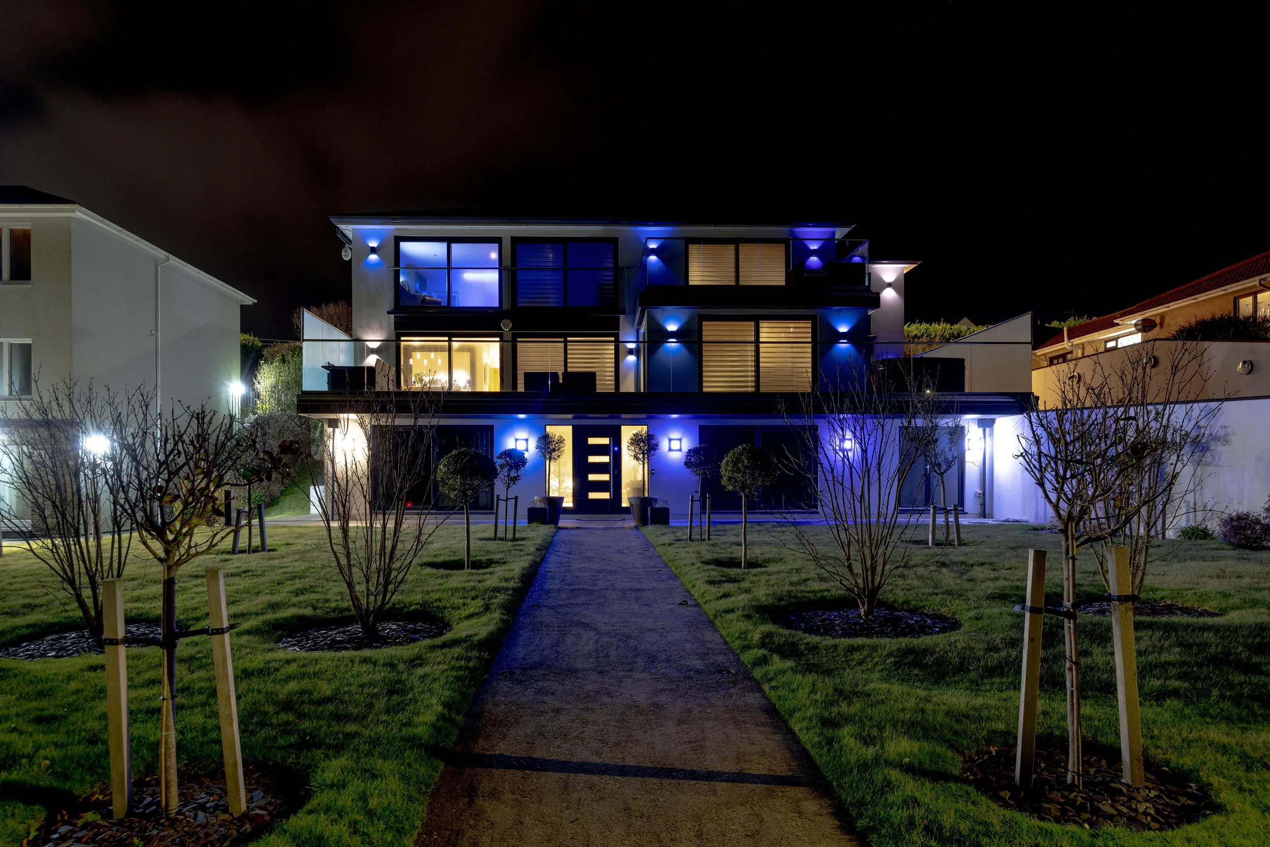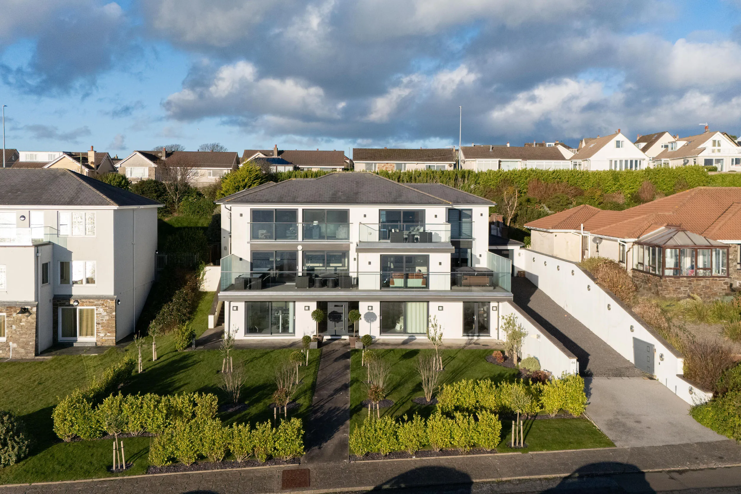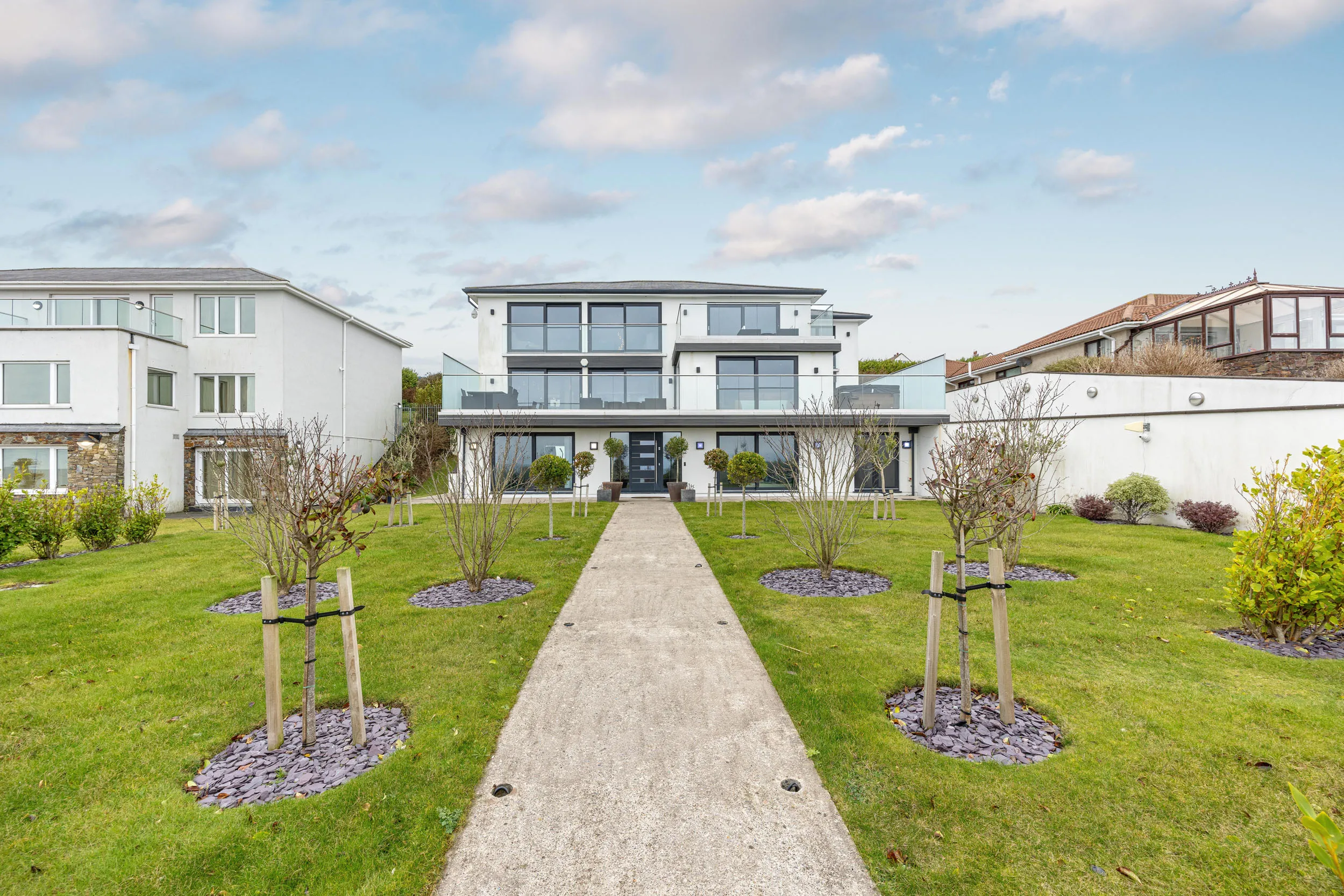 - Front and rear lawned gardens, paved terraces, balconies and courtyard