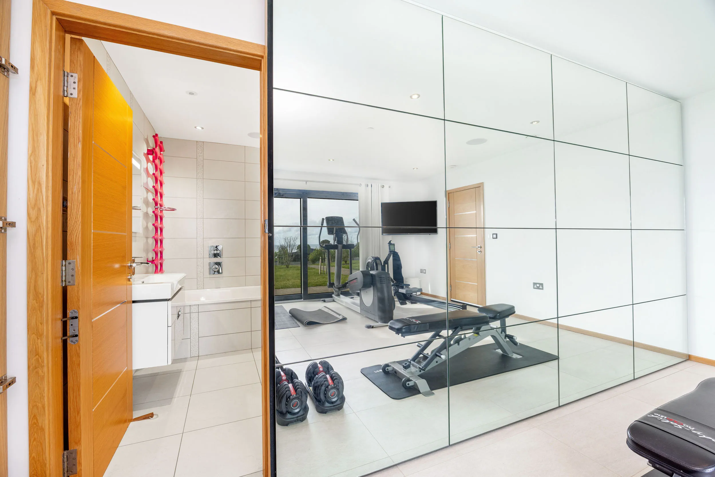 A striking and welcoming reception hall sets the tone on arrival, where a bespoke designed glazed staircase rises elegantly through the home, creating an immediate sense of architectural presence. The ground floor offers superb versatility, featuring two generous double bedrooms, one currently utilised as a gym, alongside a beautifully appointed office with its own private entrance - ideal for those seeking a seamless work-from-home arrangement without compromising the privacy of the main residence.