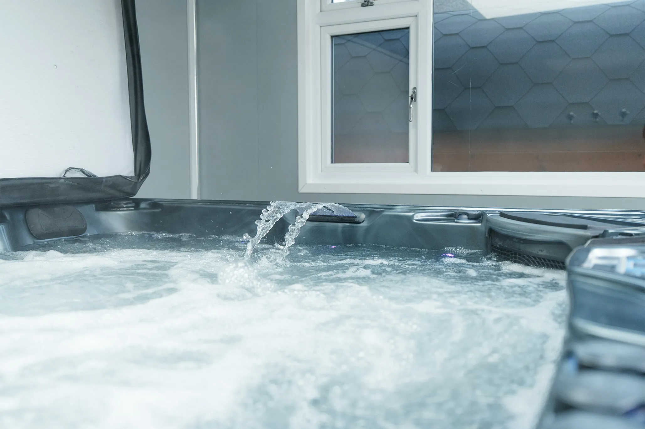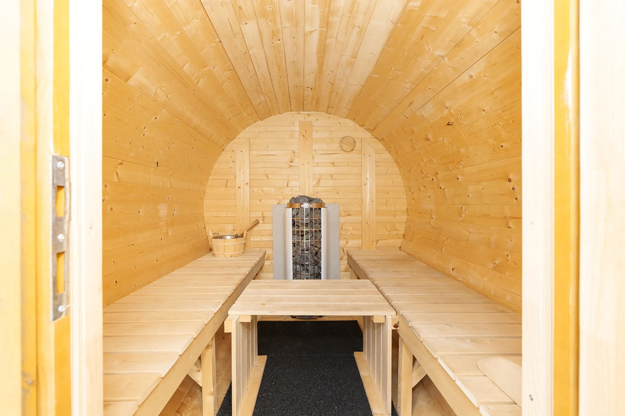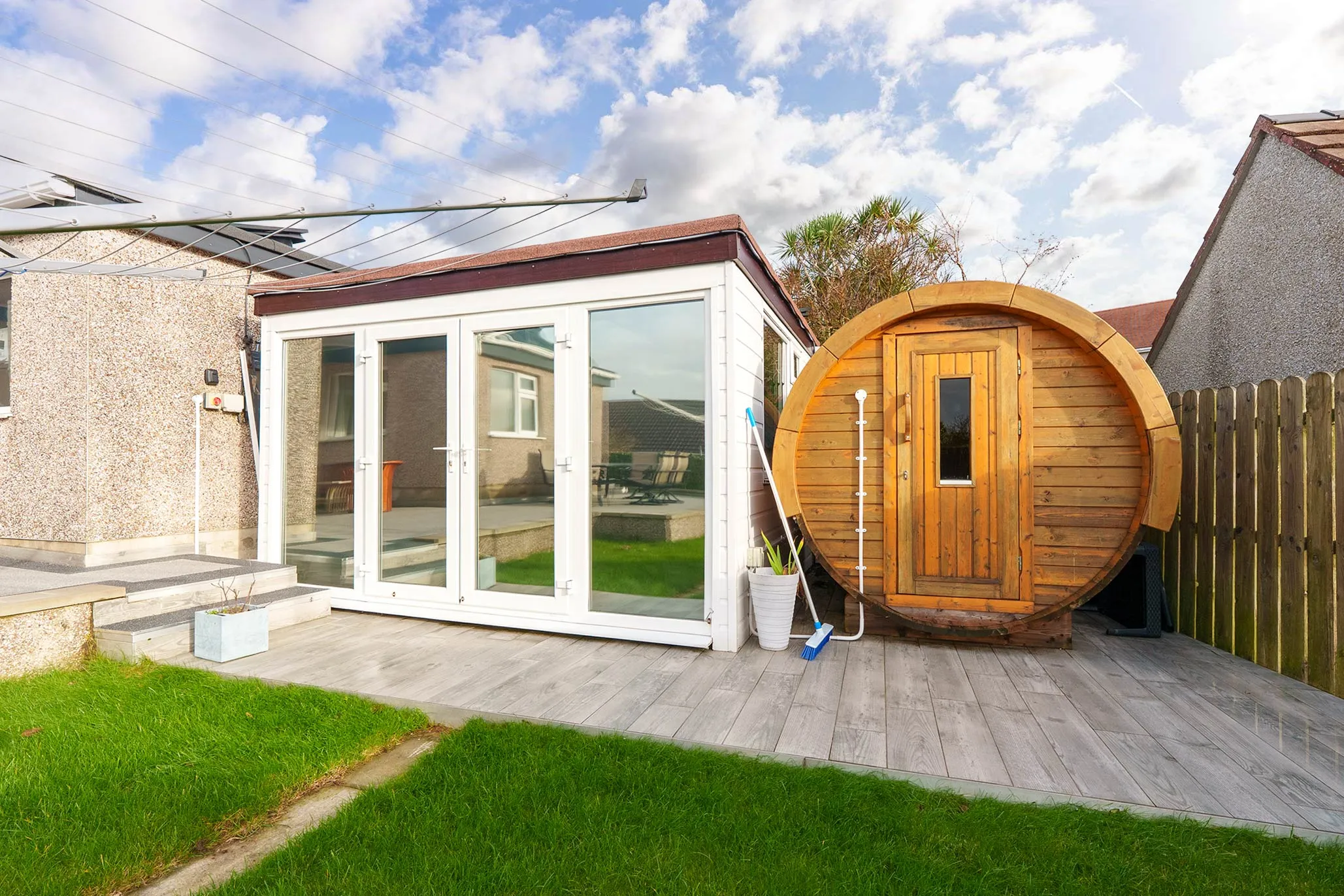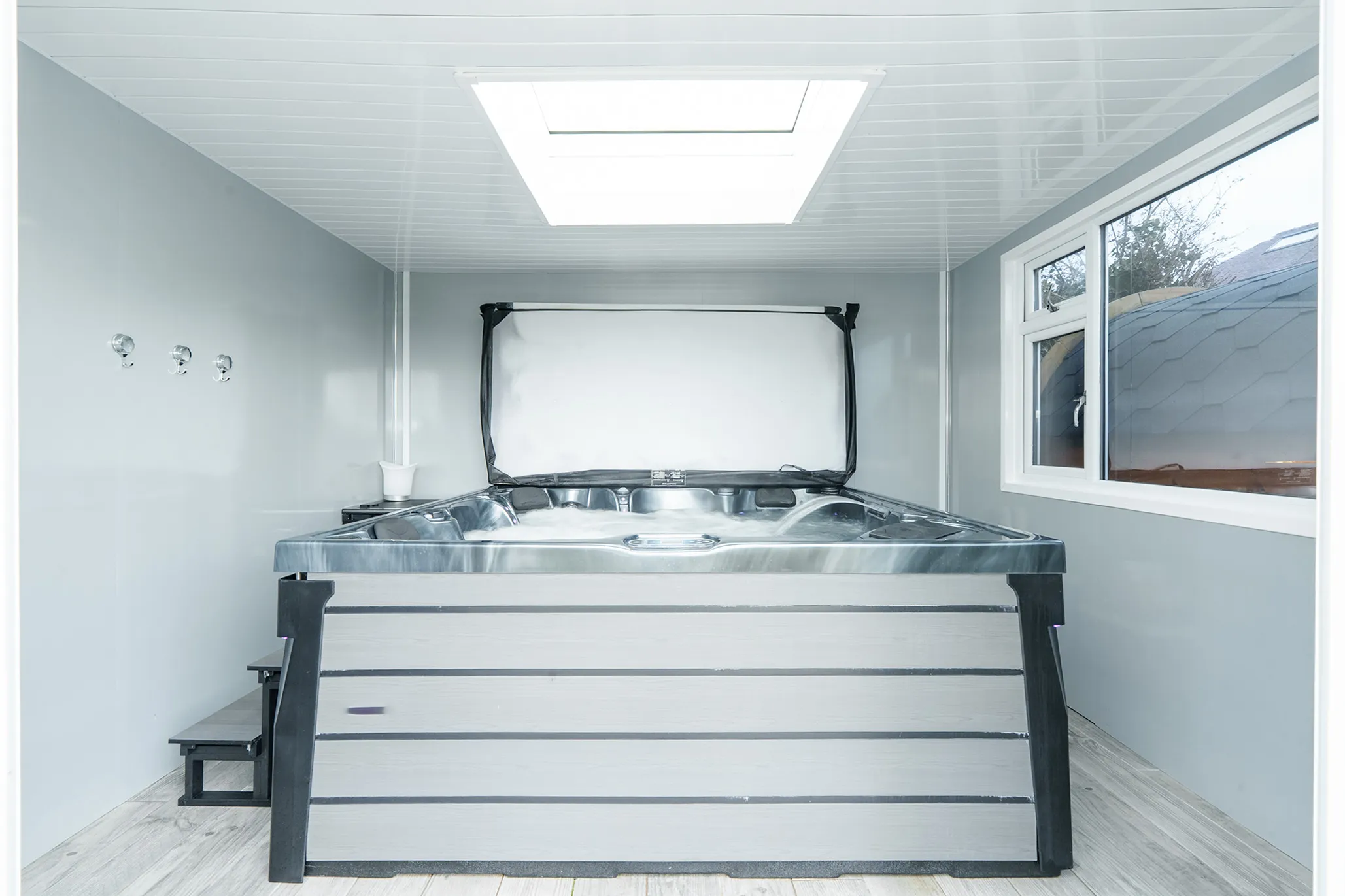 - Externally accessed hot tub room with hot tub and a separate sauna