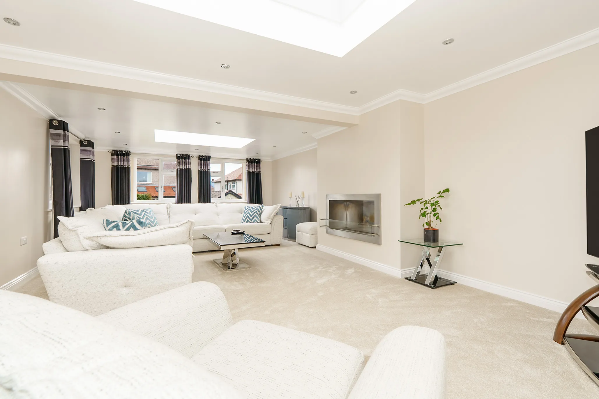 The heart of the home is the superb 27ft x 25ft (max L-shape) living/dining room, featuring a contemporary bioethanol fire and French doors leading to a south-facing sun terrace — perfect for entertaining and alfresco dining. A separate modern kitchen complements the living space beautifully.