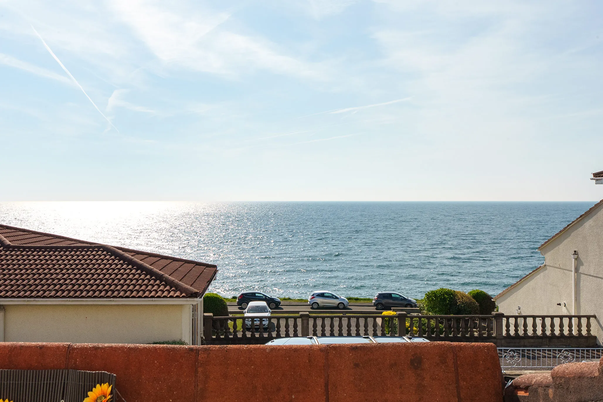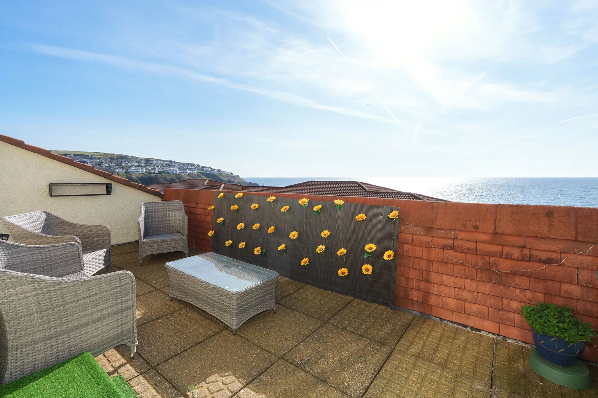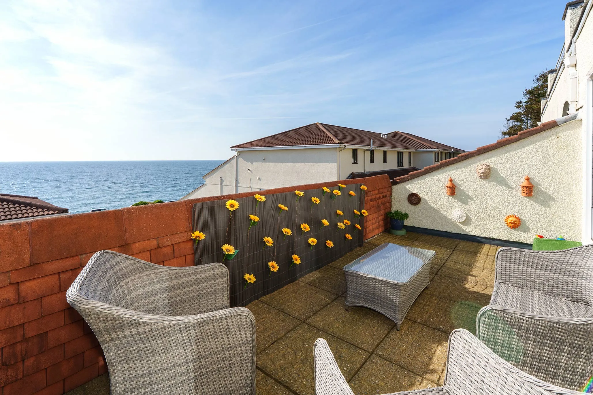 The large south-facing sun terrace provides ample space for outdoor furniture, making it ideal for alfresco dining or entertaining while enjoying the uninterrupted coastal outlook.