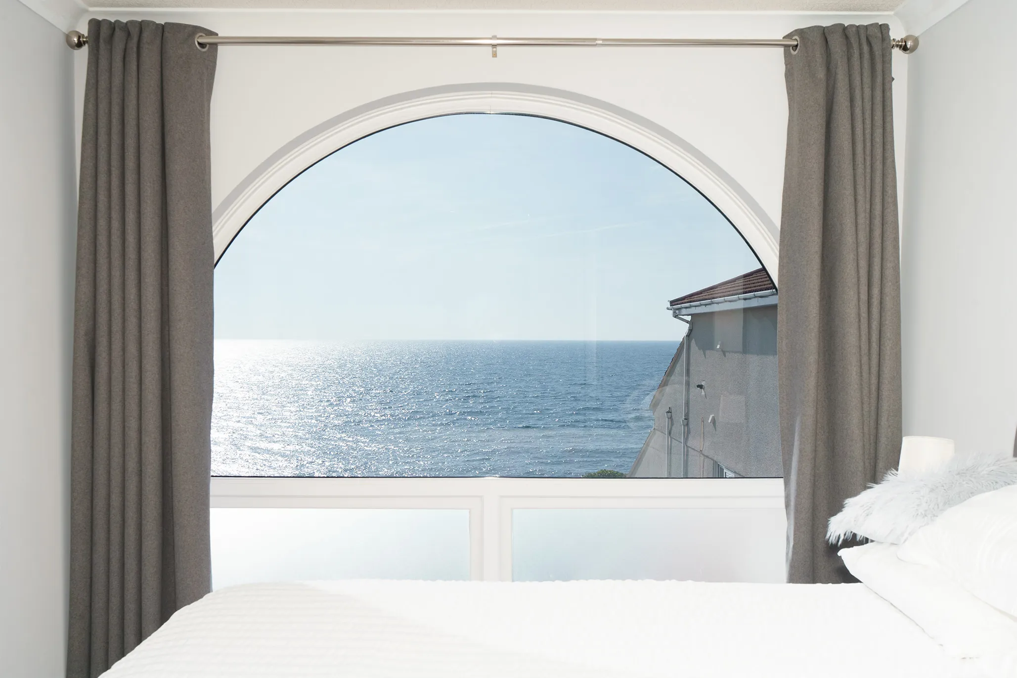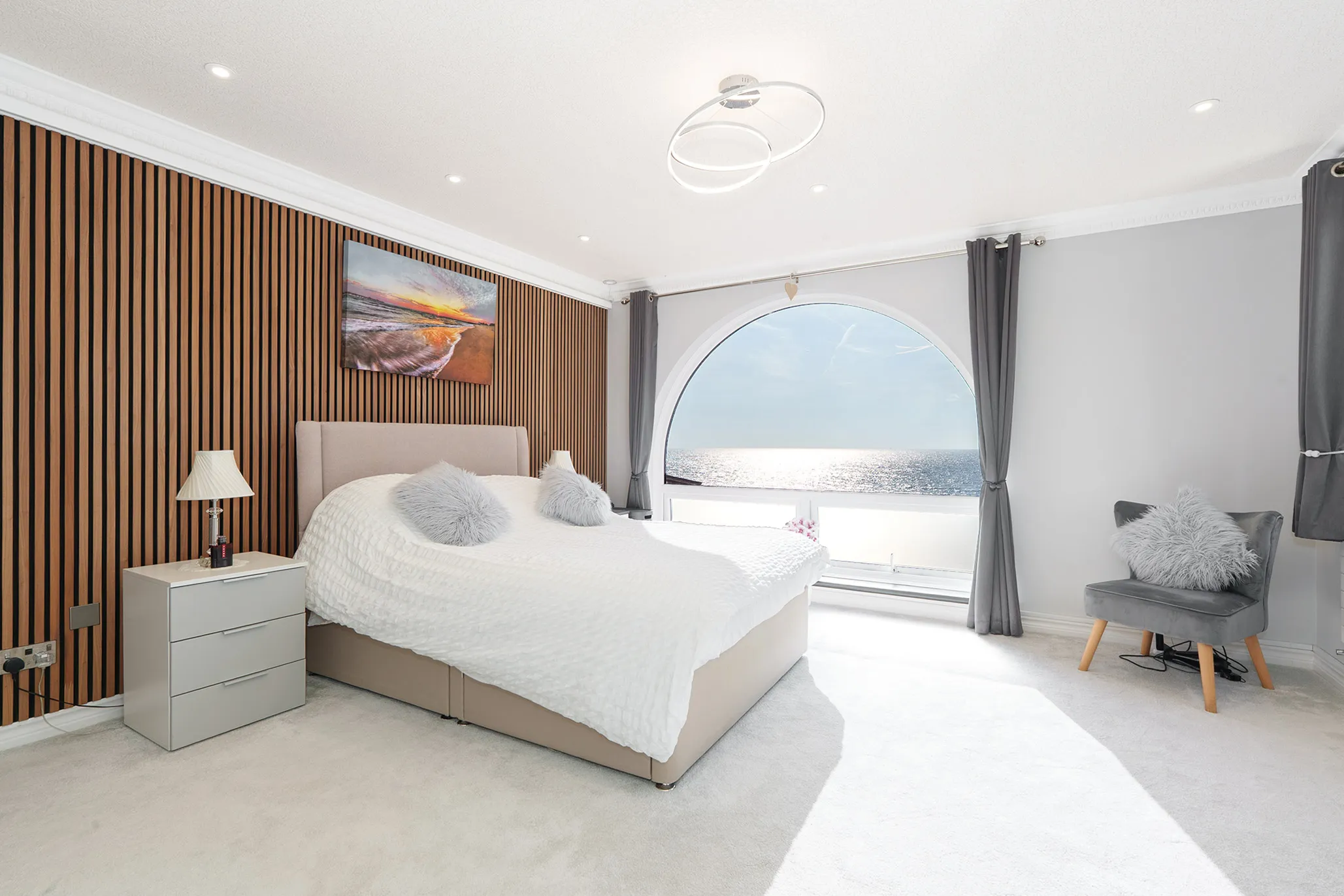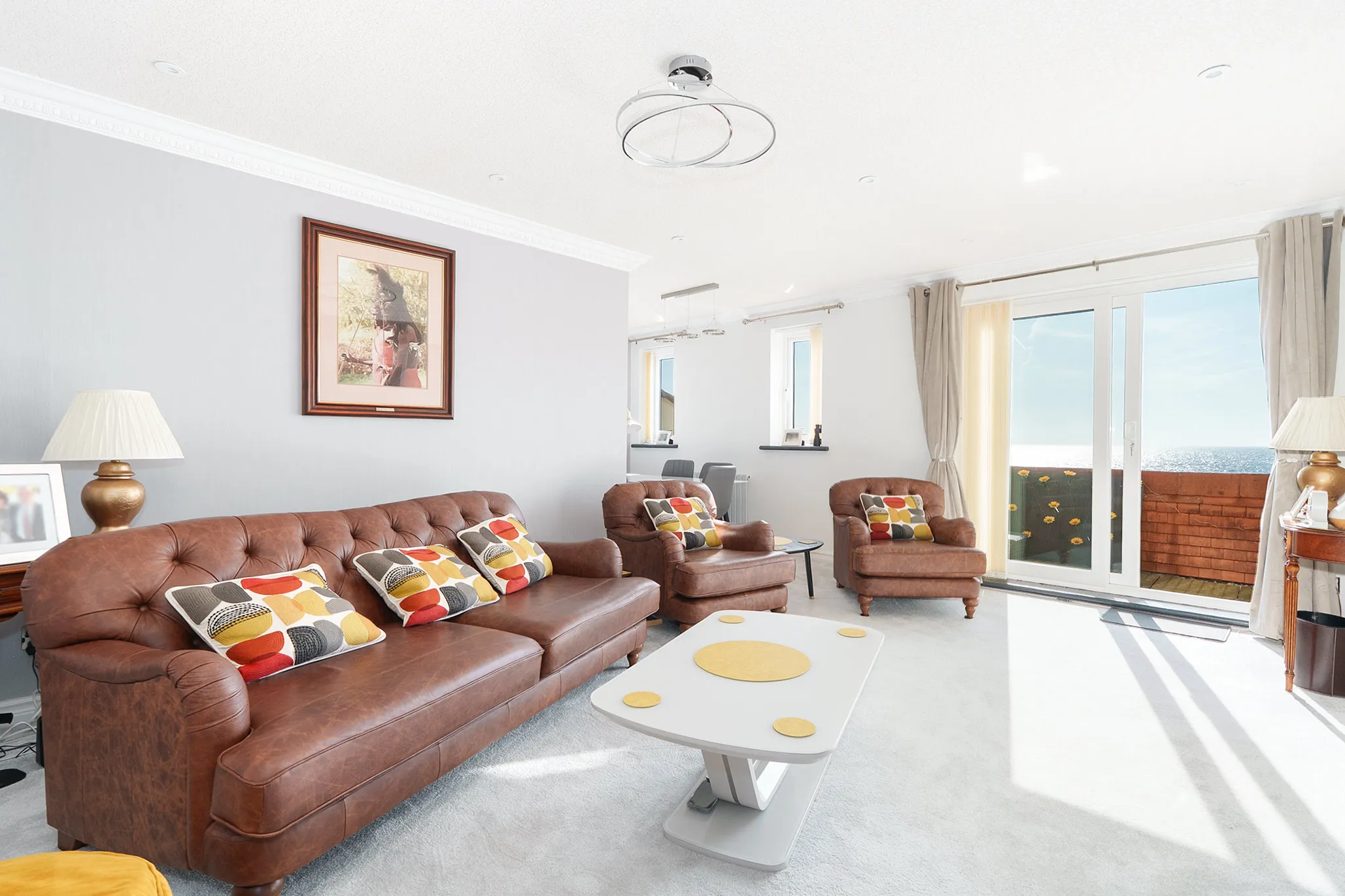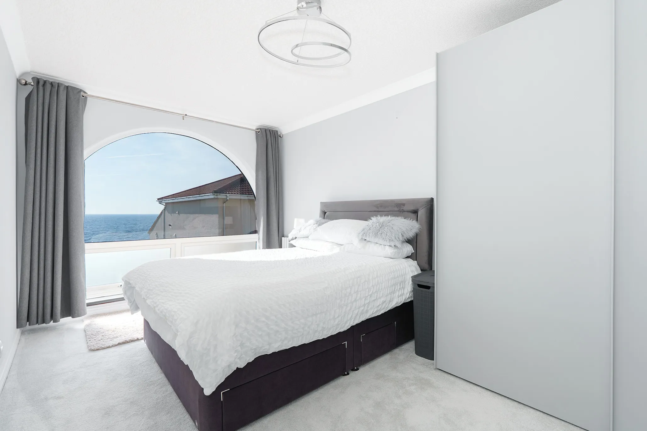 The large south-facing sun terrace provides ample space for outdoor furniture, making it ideal for alfresco dining or entertaining while enjoying the uninterrupted coastal outlook.