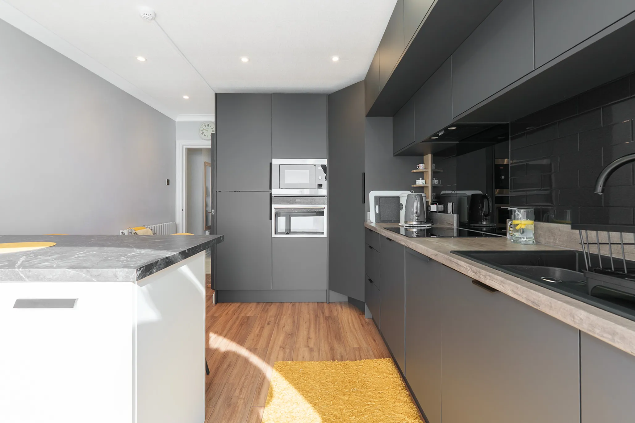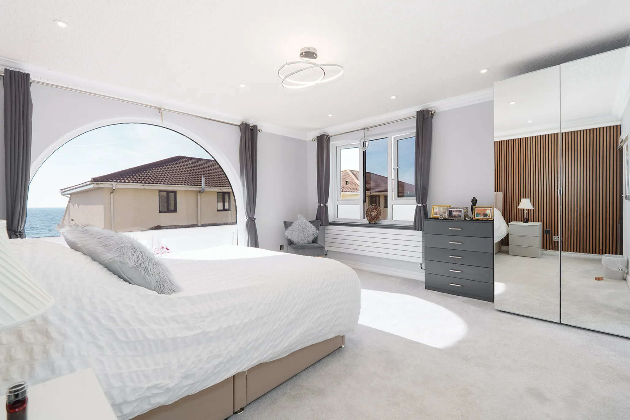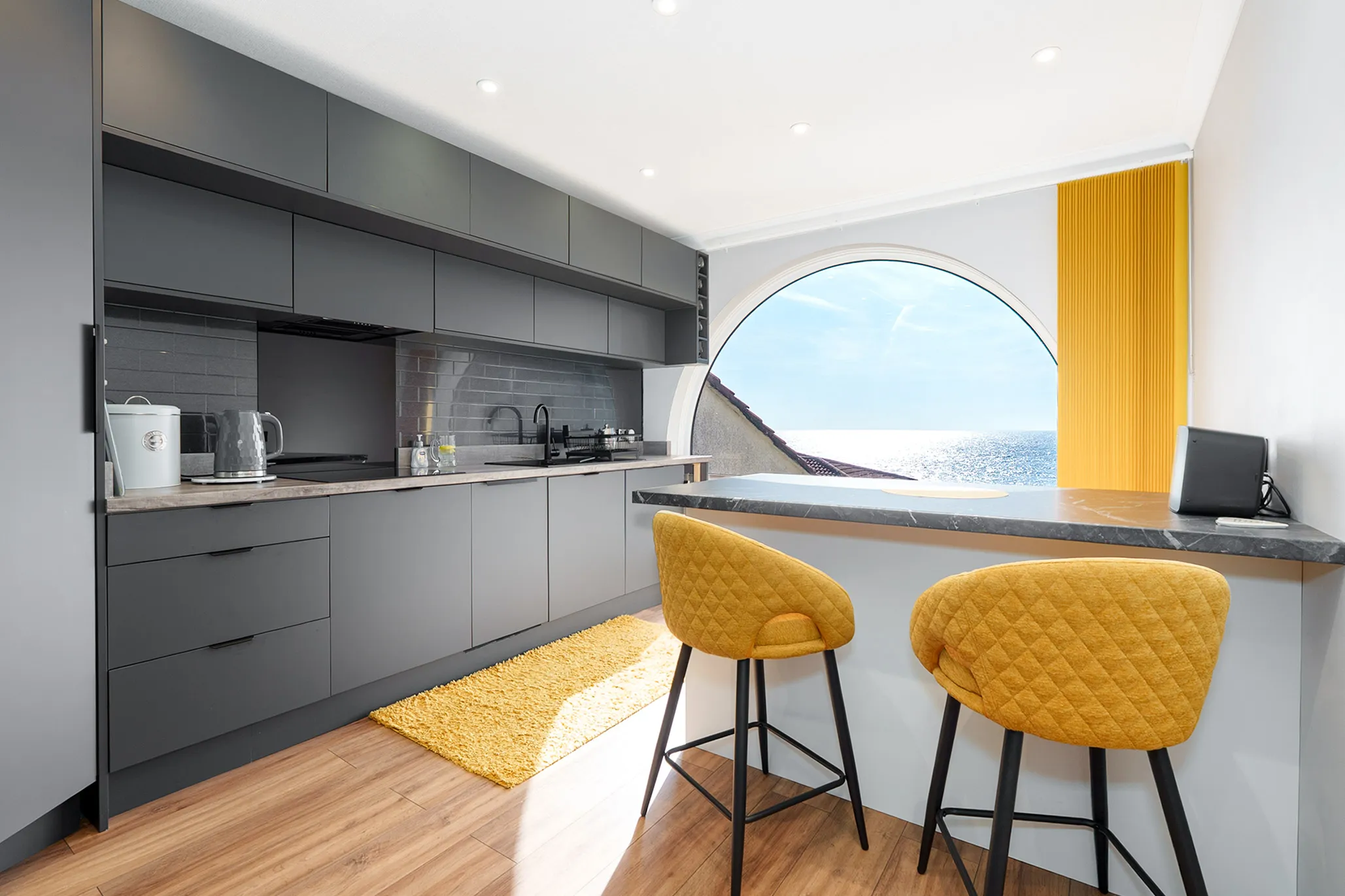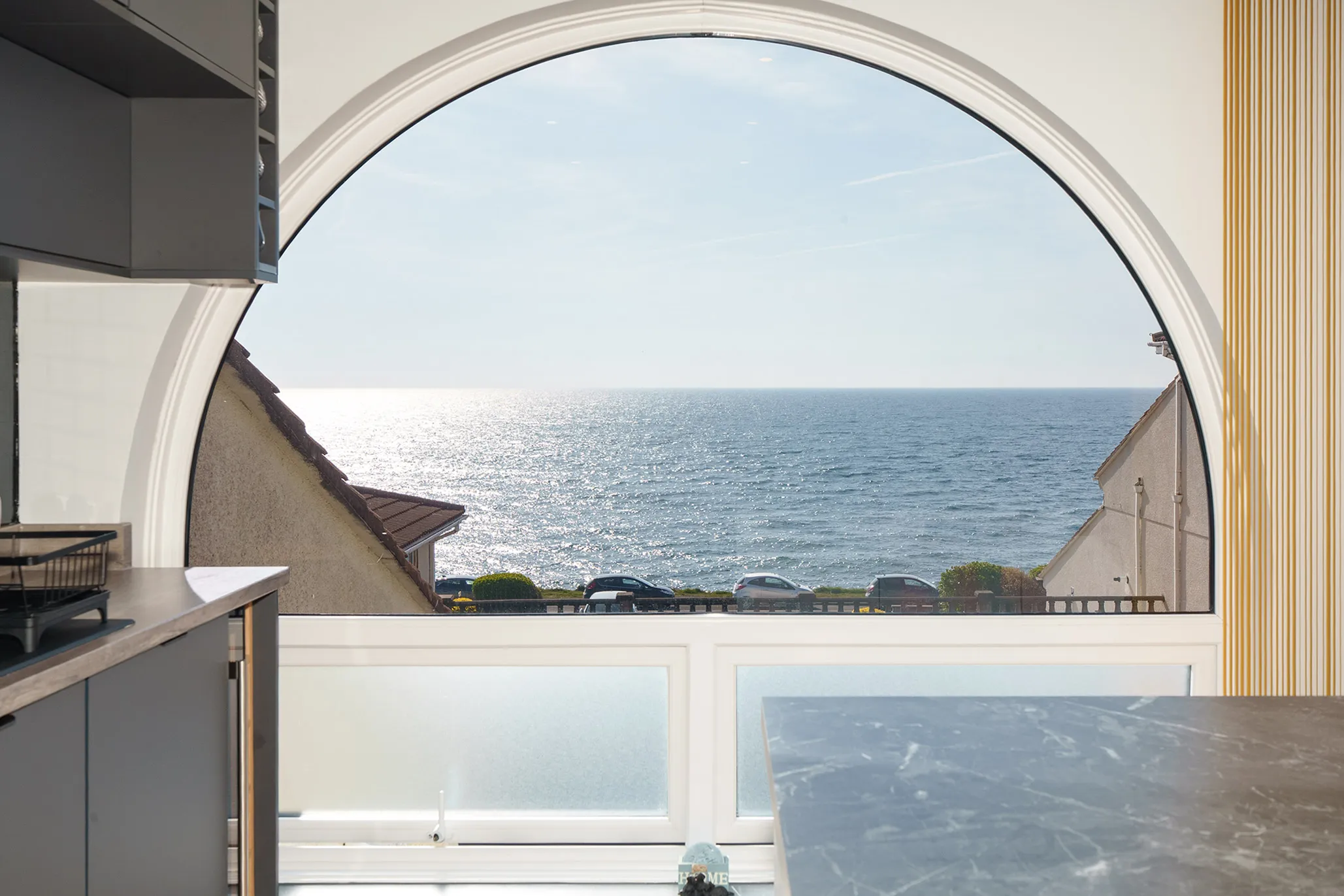 The contemporary German kitchen has been thoughtfully designed with a recently added breakfast bar and a feature curved window, offering both style and beautiful views.