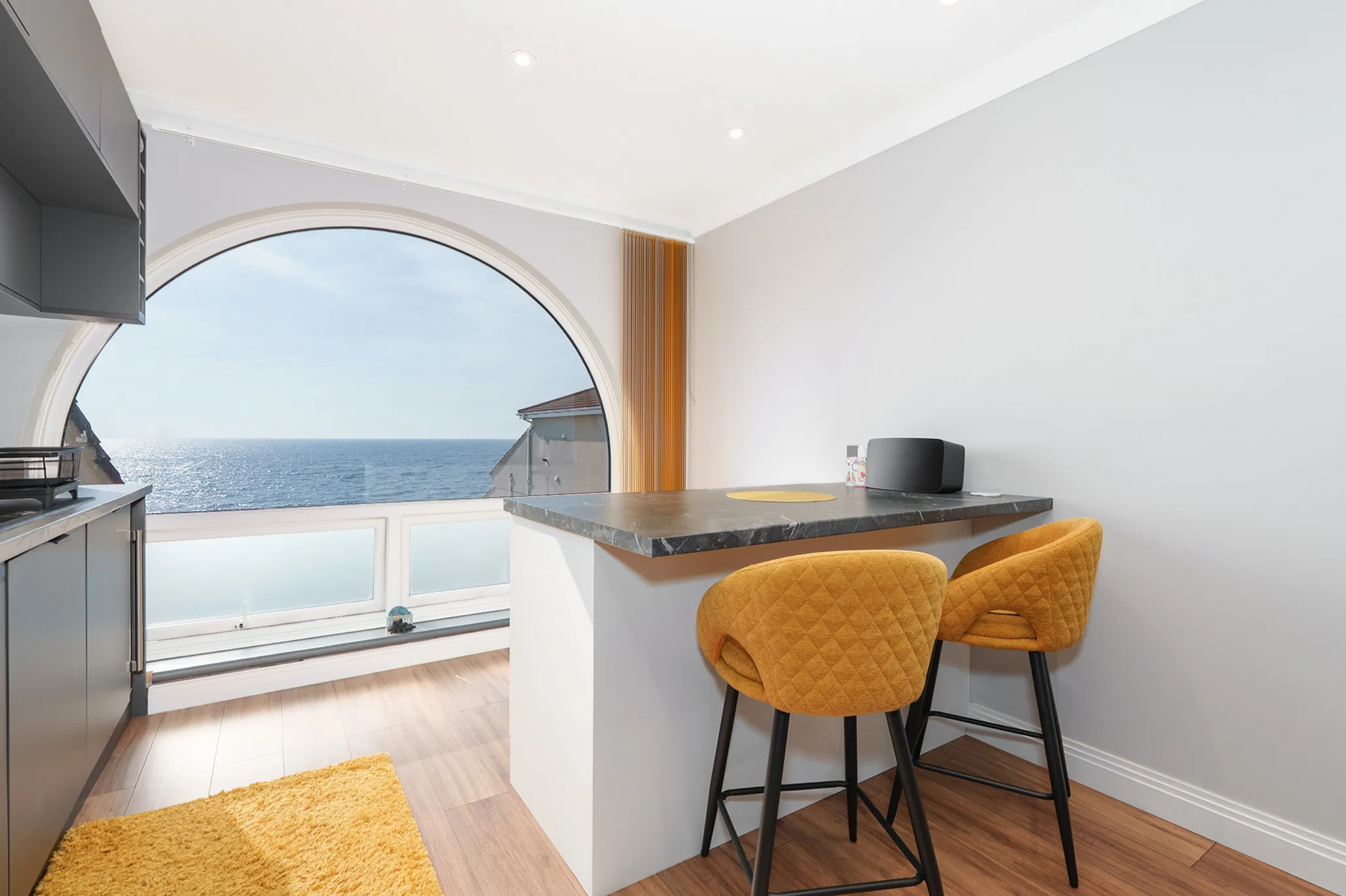 The property has been extensively modernised to an exceptional standard, featuring stylish, high-quality fixtures and fittings throughout. The principal accommodation—including the living room, kitchen and both bedrooms—is all sea-facing, perfectly positioned to take full advantage of the stunning vistas.