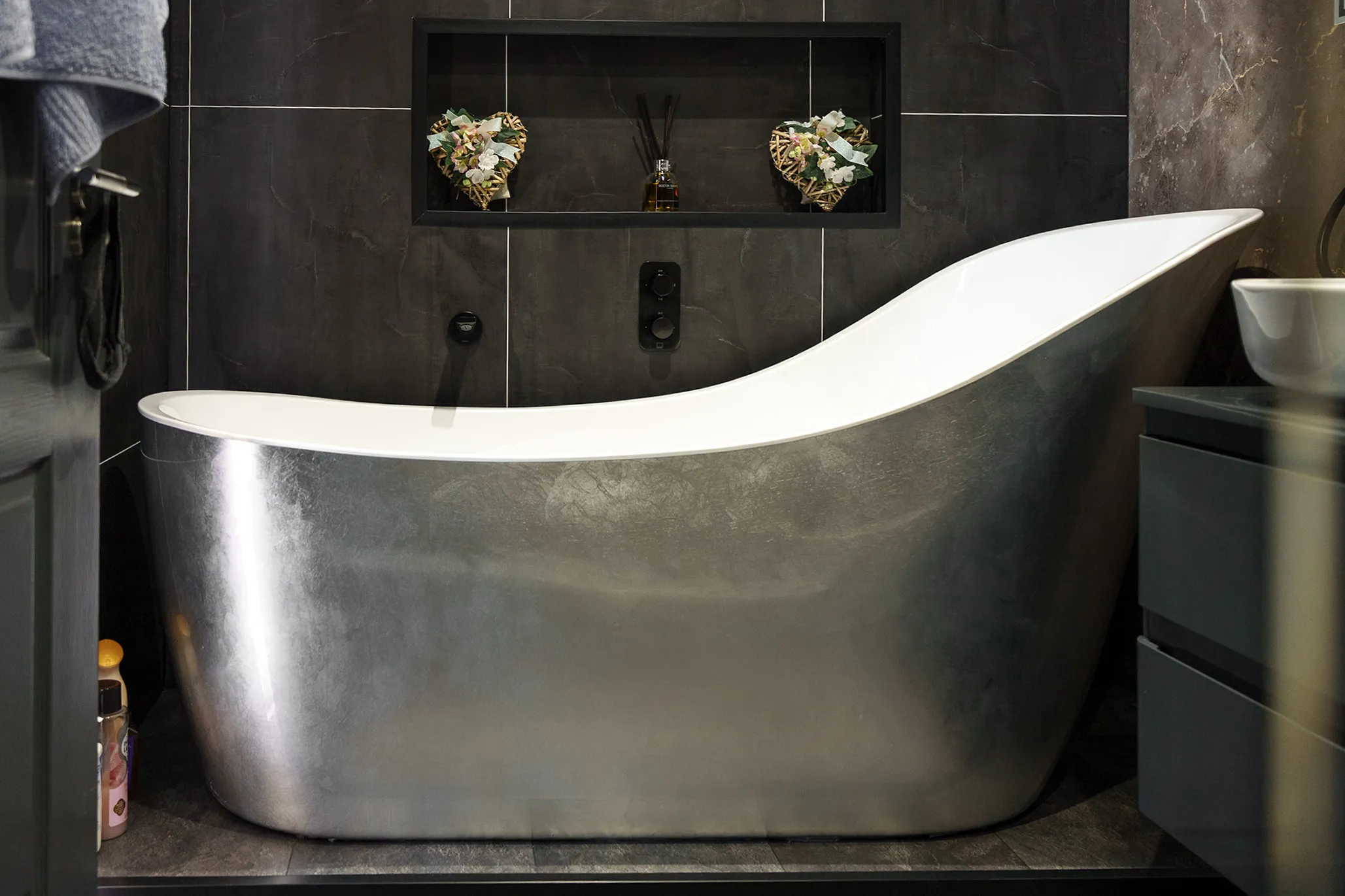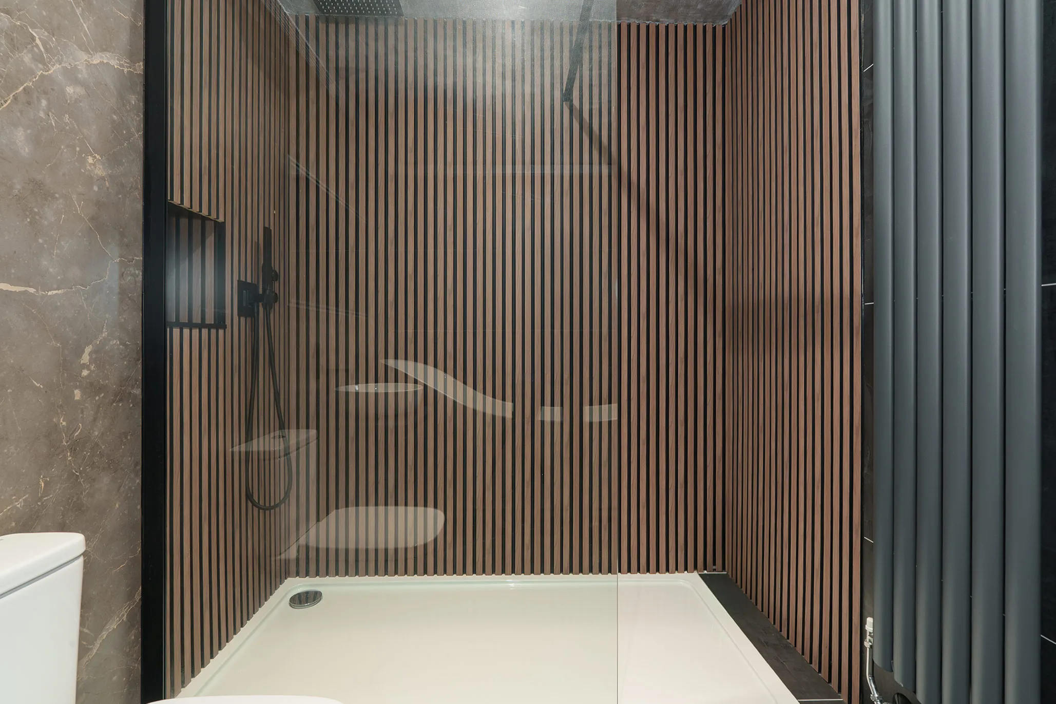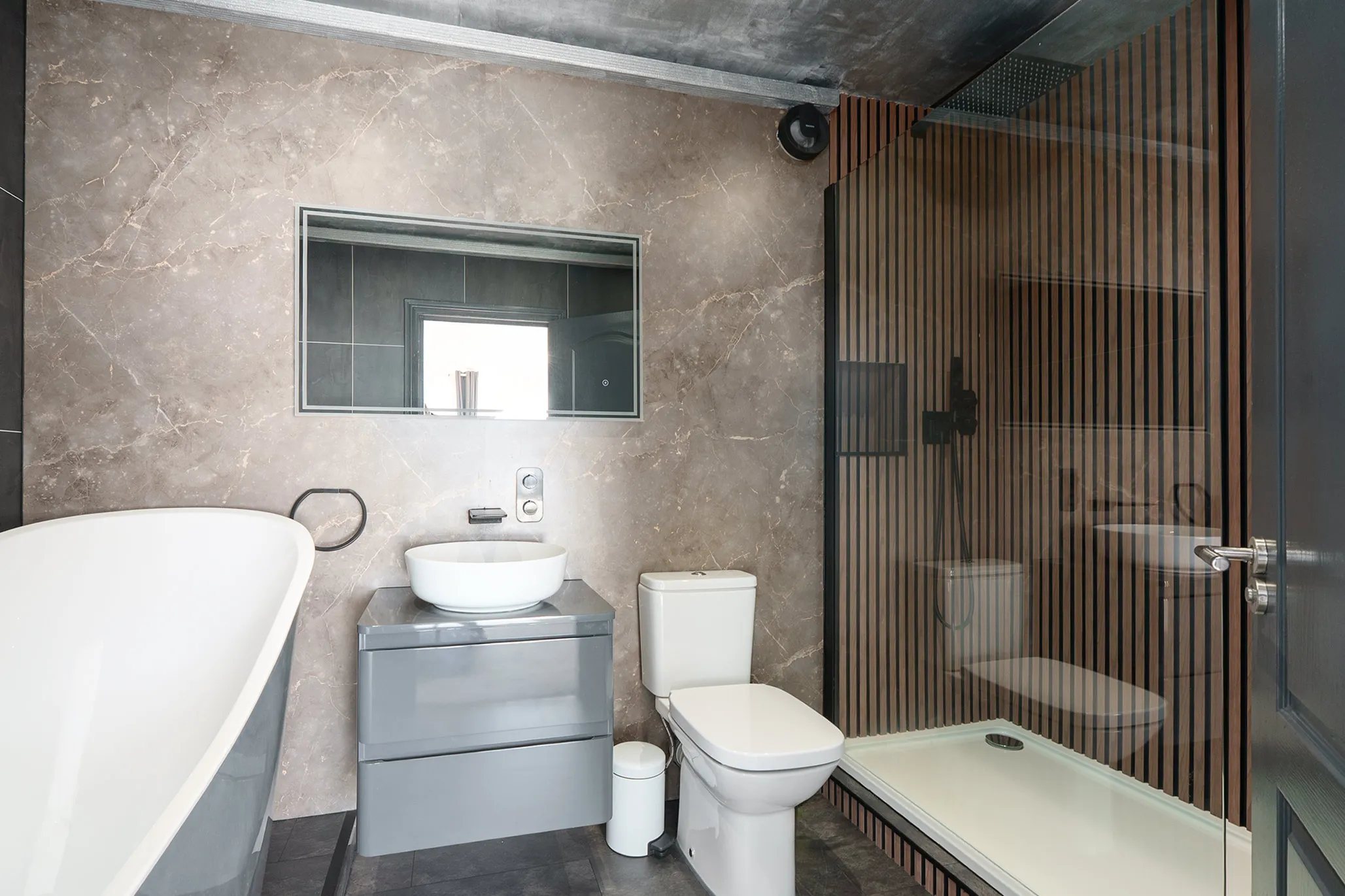 There are two generous double bedrooms, including a luxurious principal suite with a stunning en-suite bathroom featuring a freestanding bath and separate shower. A further modern shower room serves the second bedroom.