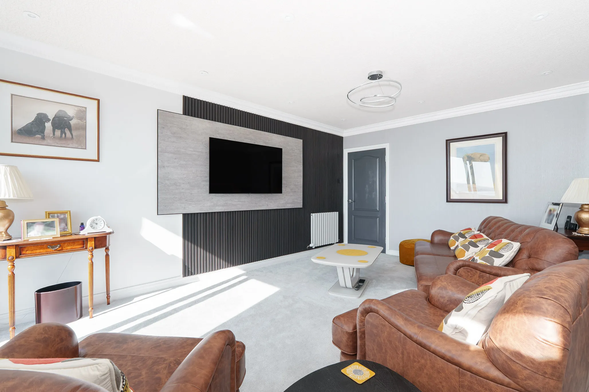 A welcoming entrance hallway offers excellent practicality with three useful storage cupboards. The impressive L-shaped living/dining room is a standout feature, complete with a contemporary clad media wall and sliding doors opening onto a superb sun terrace.