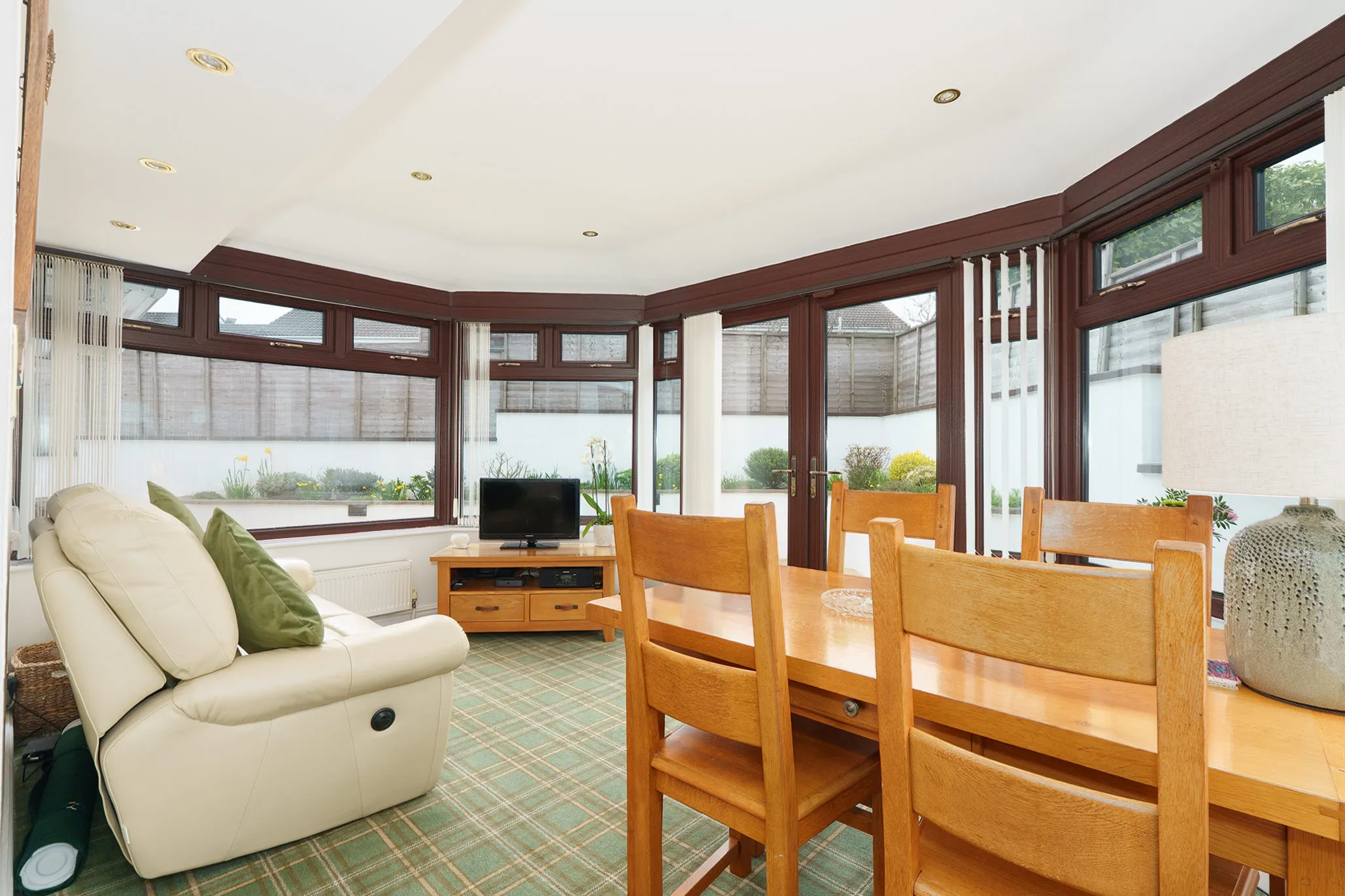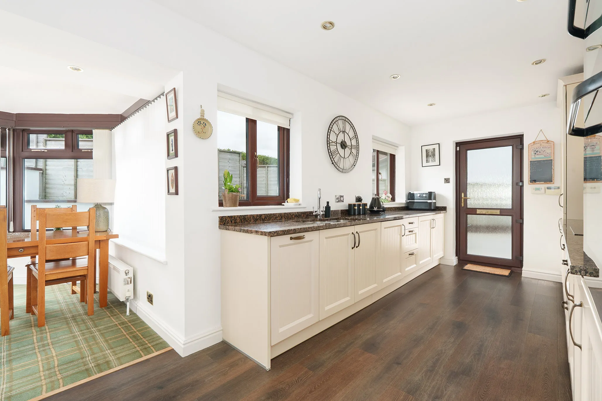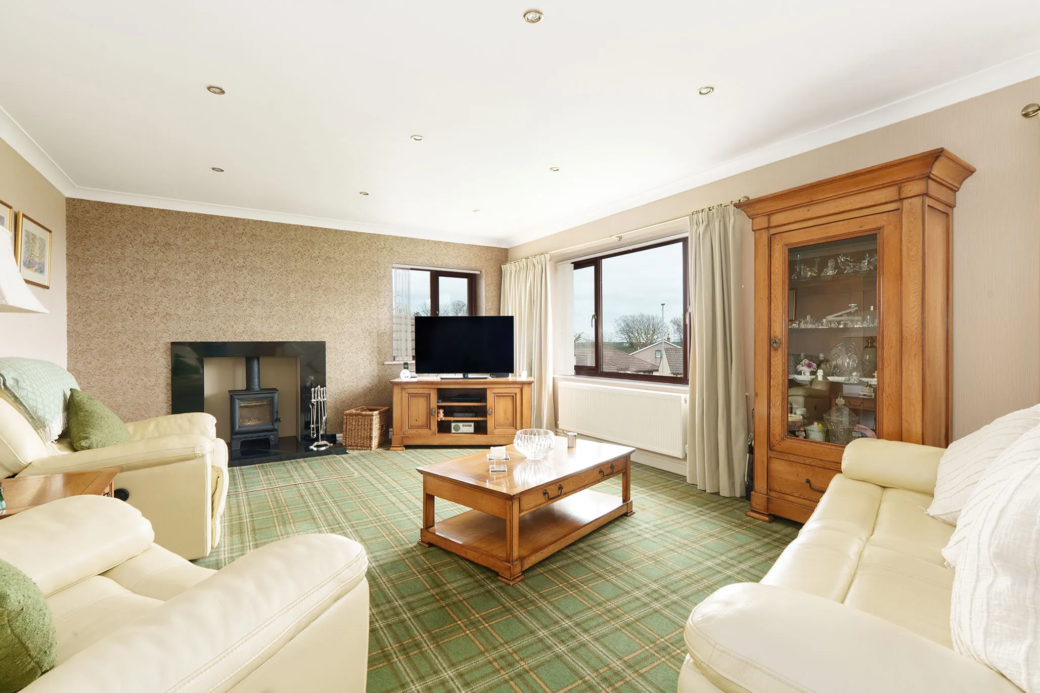 Internally, the accommodation is both spacious and practical. A large living room with cosy log burner provides a comfortable main reception space, ideal for both relaxing and entertaining. The modern fitted kitchen is well-appointed, while a bright sunroom adds a further dimension to the living space.