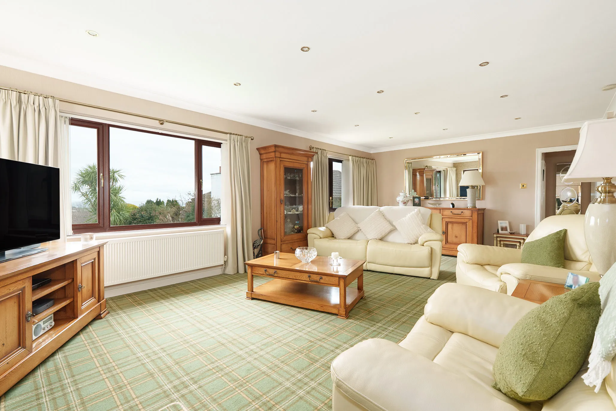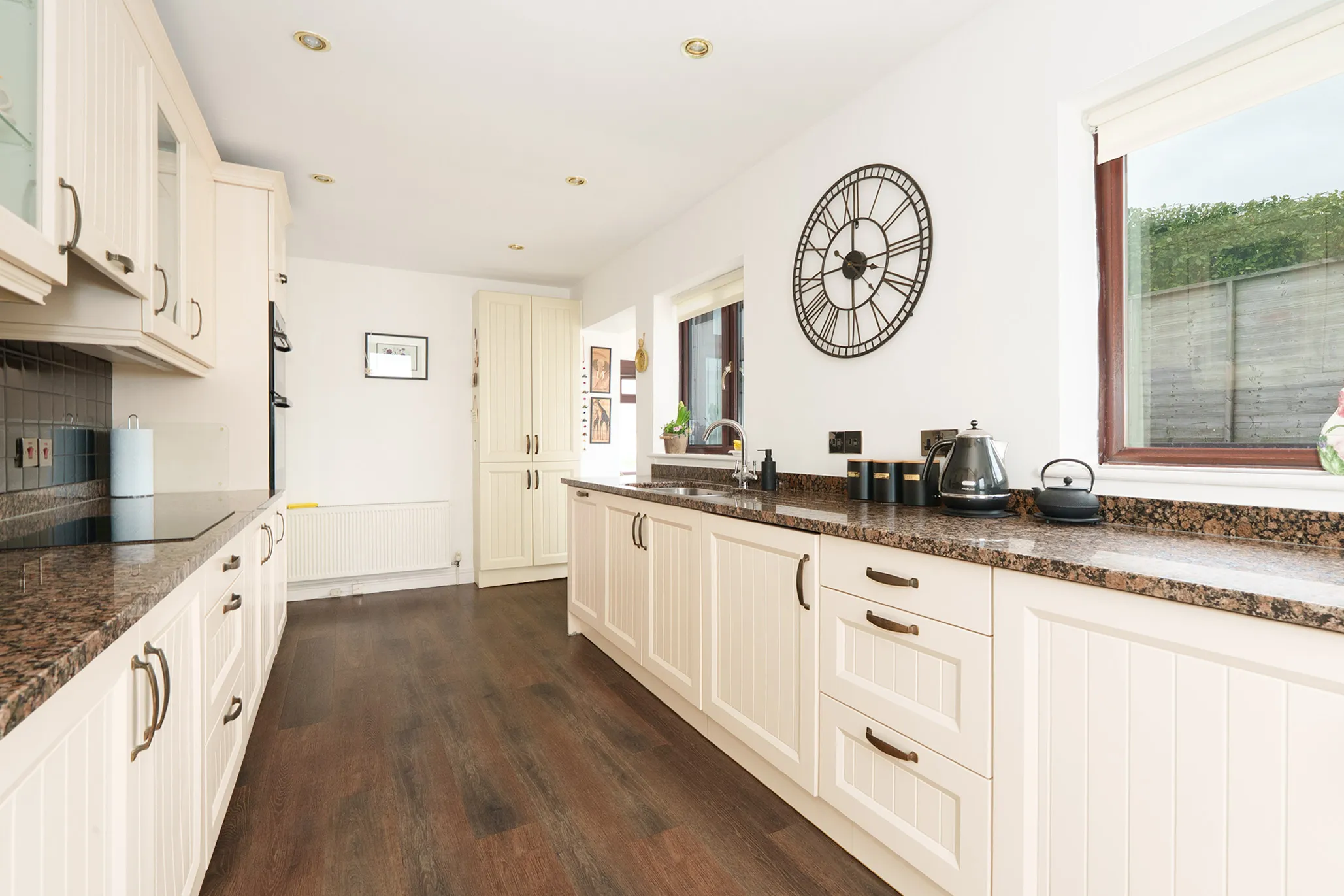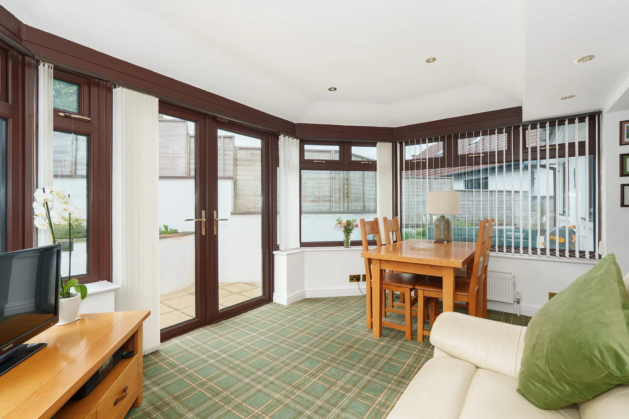 Internally, the accommodation is both spacious and practical. A large living room with cosy log burner provides a comfortable main reception space, ideal for both relaxing and entertaining. The modern fitted kitchen is well-appointed, while a bright sunroom adds a further dimension to the living space.