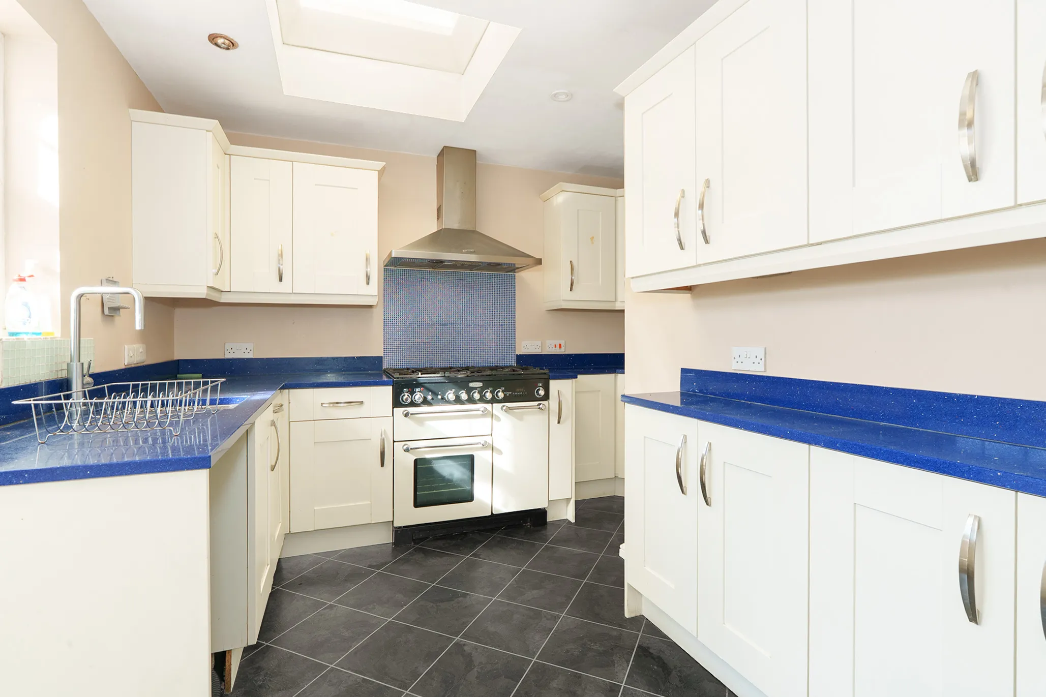 - Stylish modern kitchen with feature blue granite tops and Rangemaster