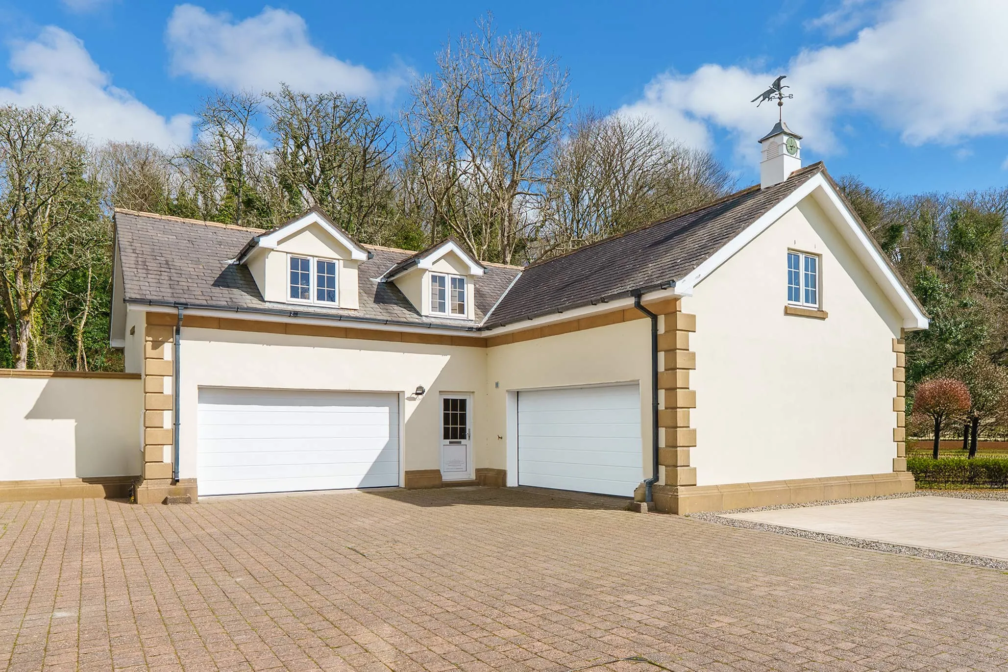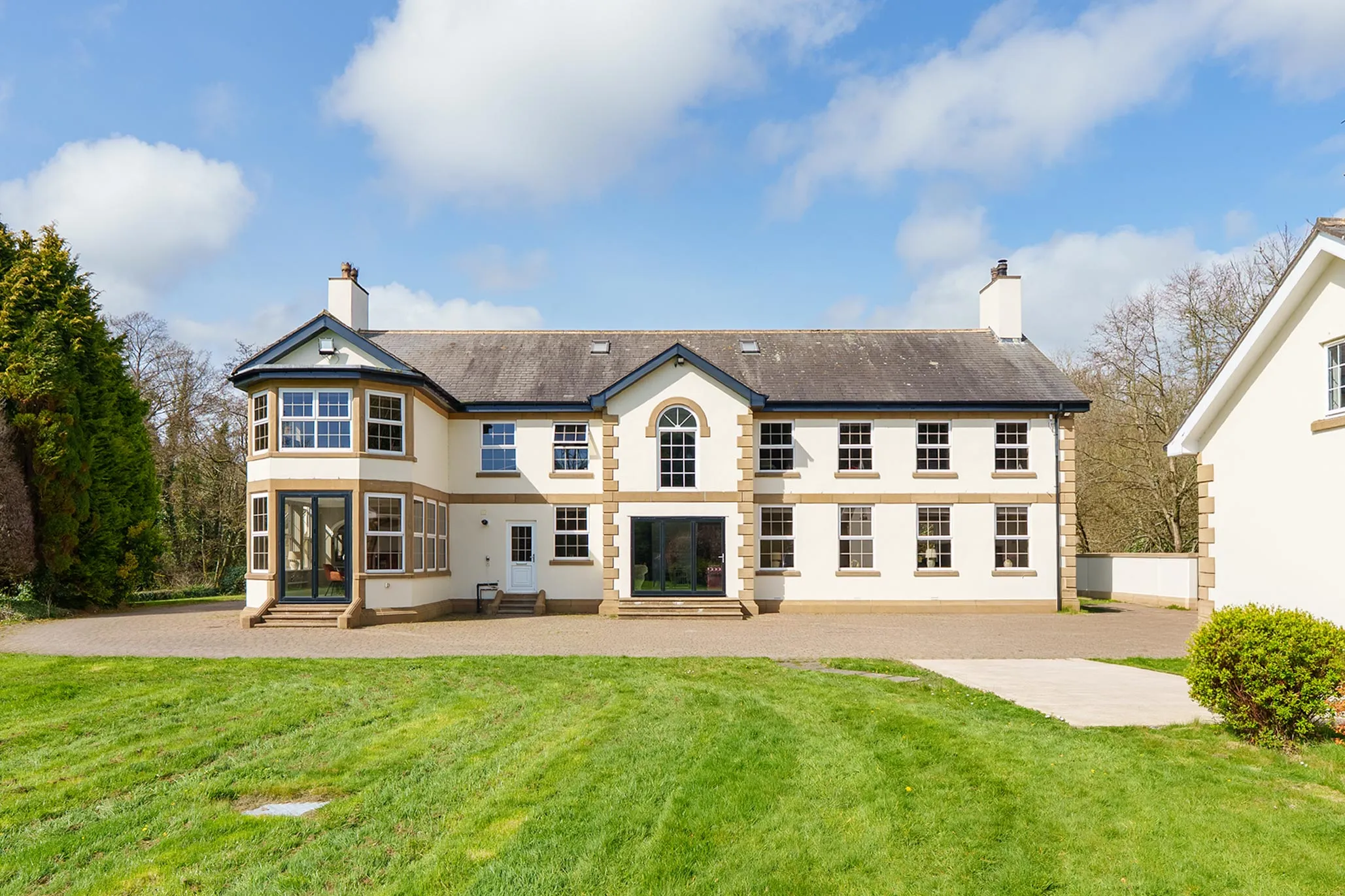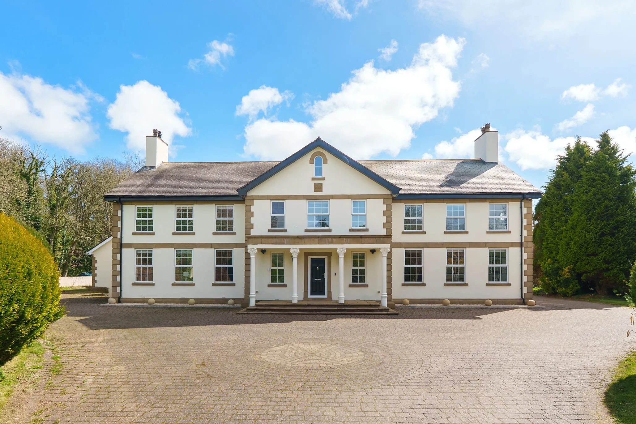 - Imposing sweeping driveway leading to the rear courtyard along with access to the two double garages and apartment