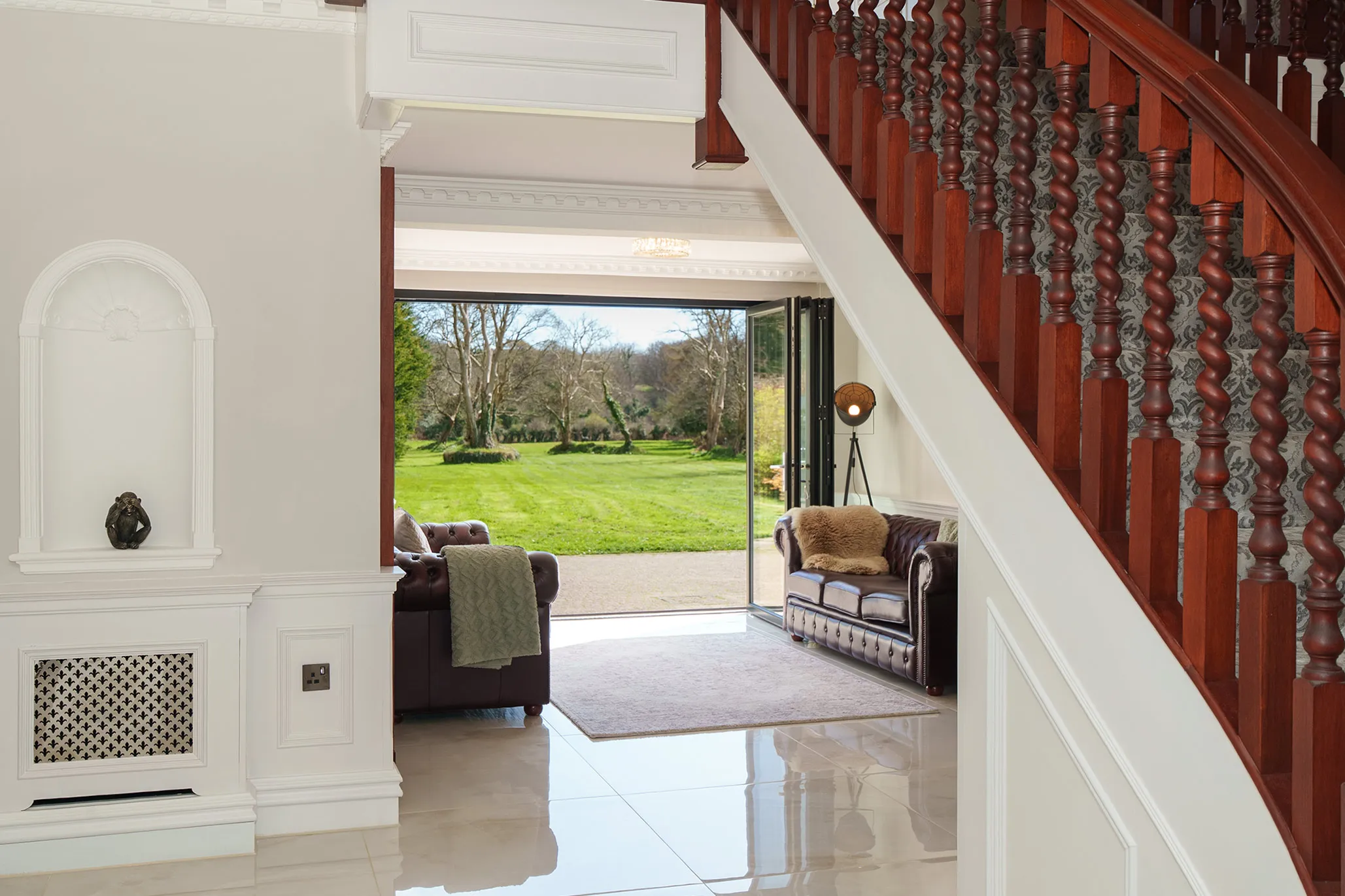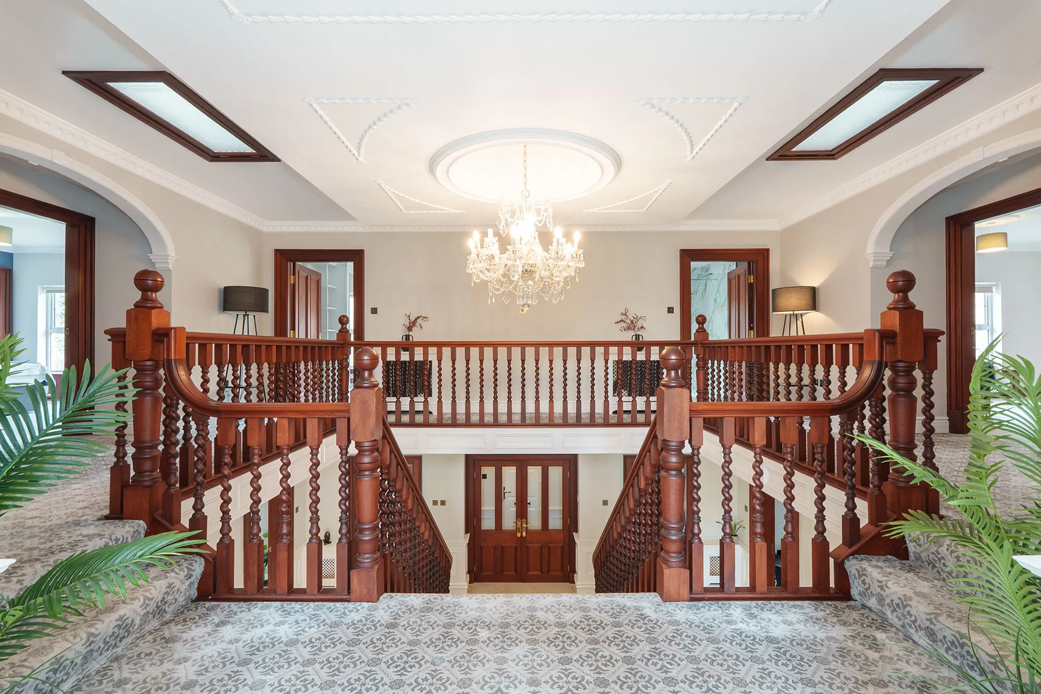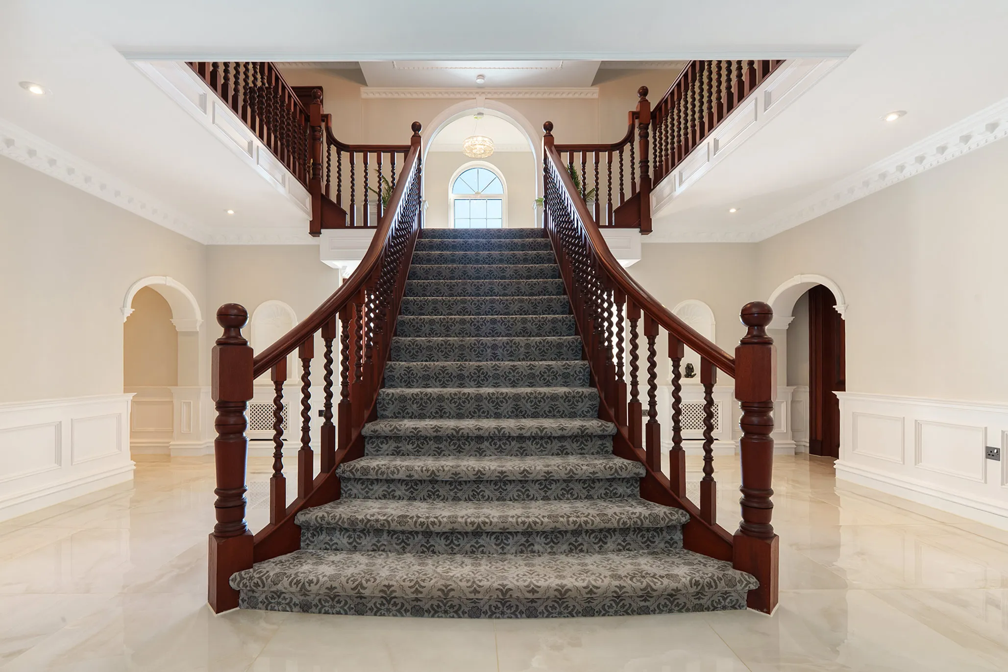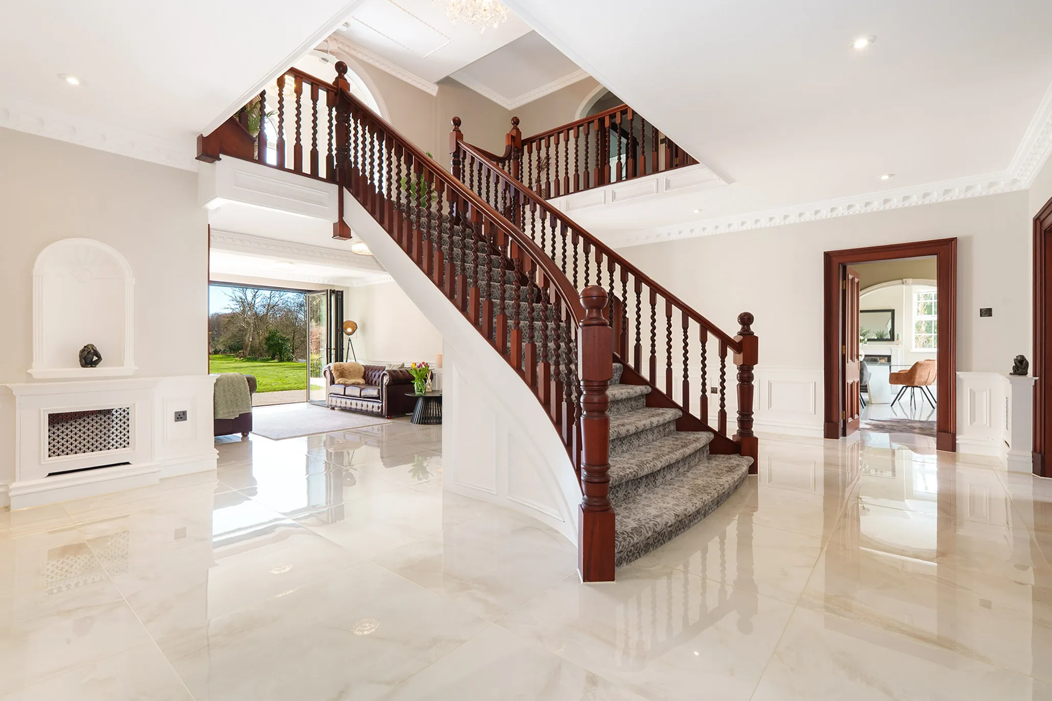 - Grand reception hall framed by a feature centralised sweeping staircase along with a sitting area