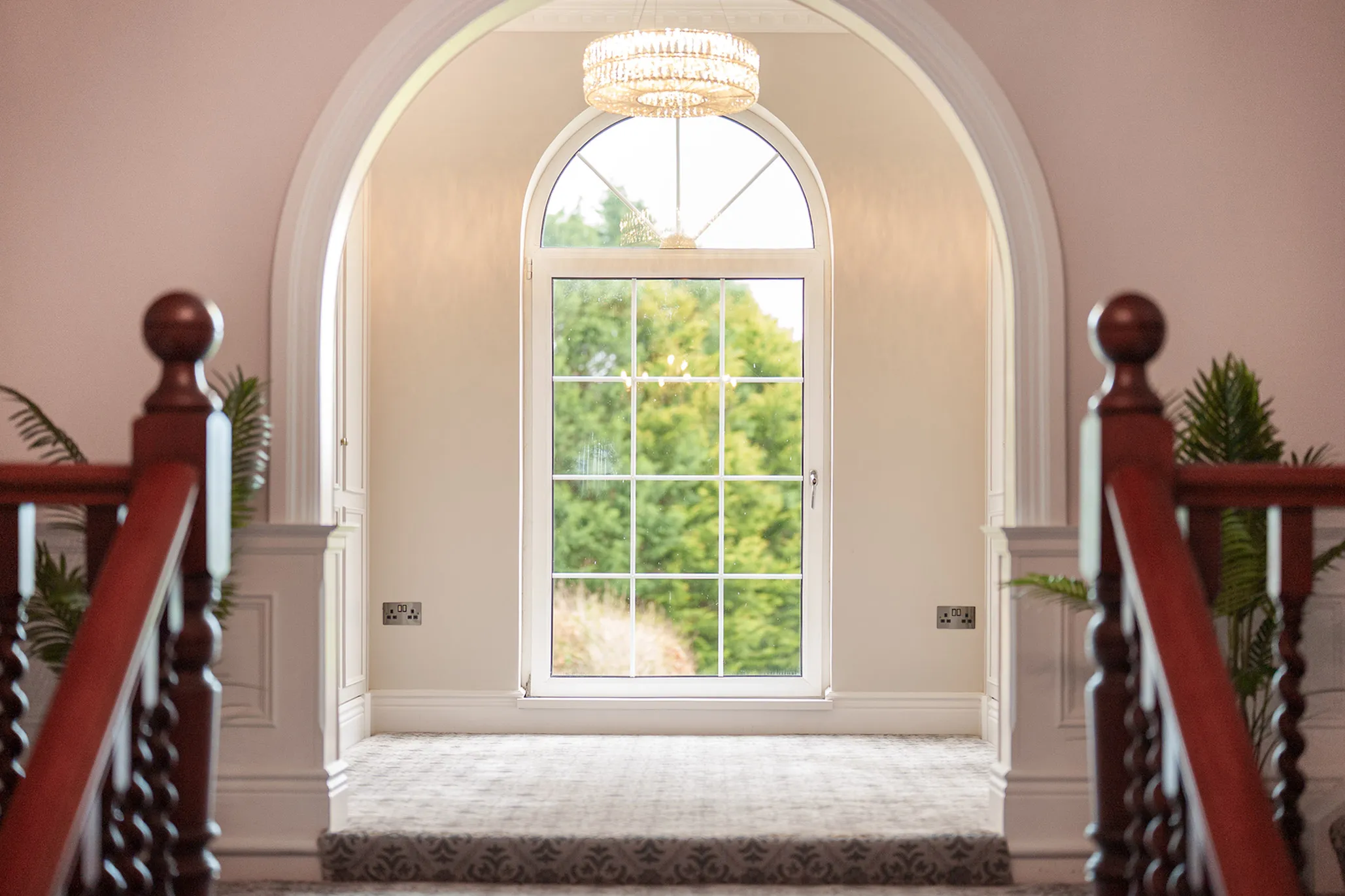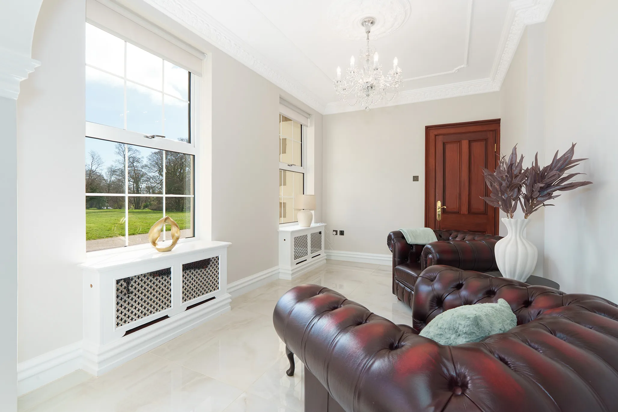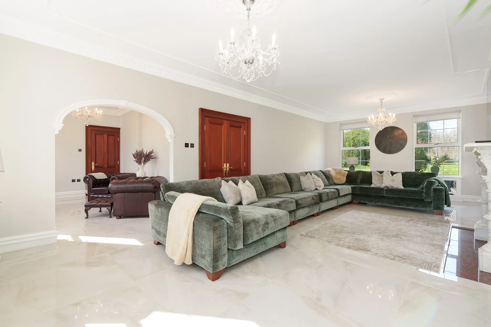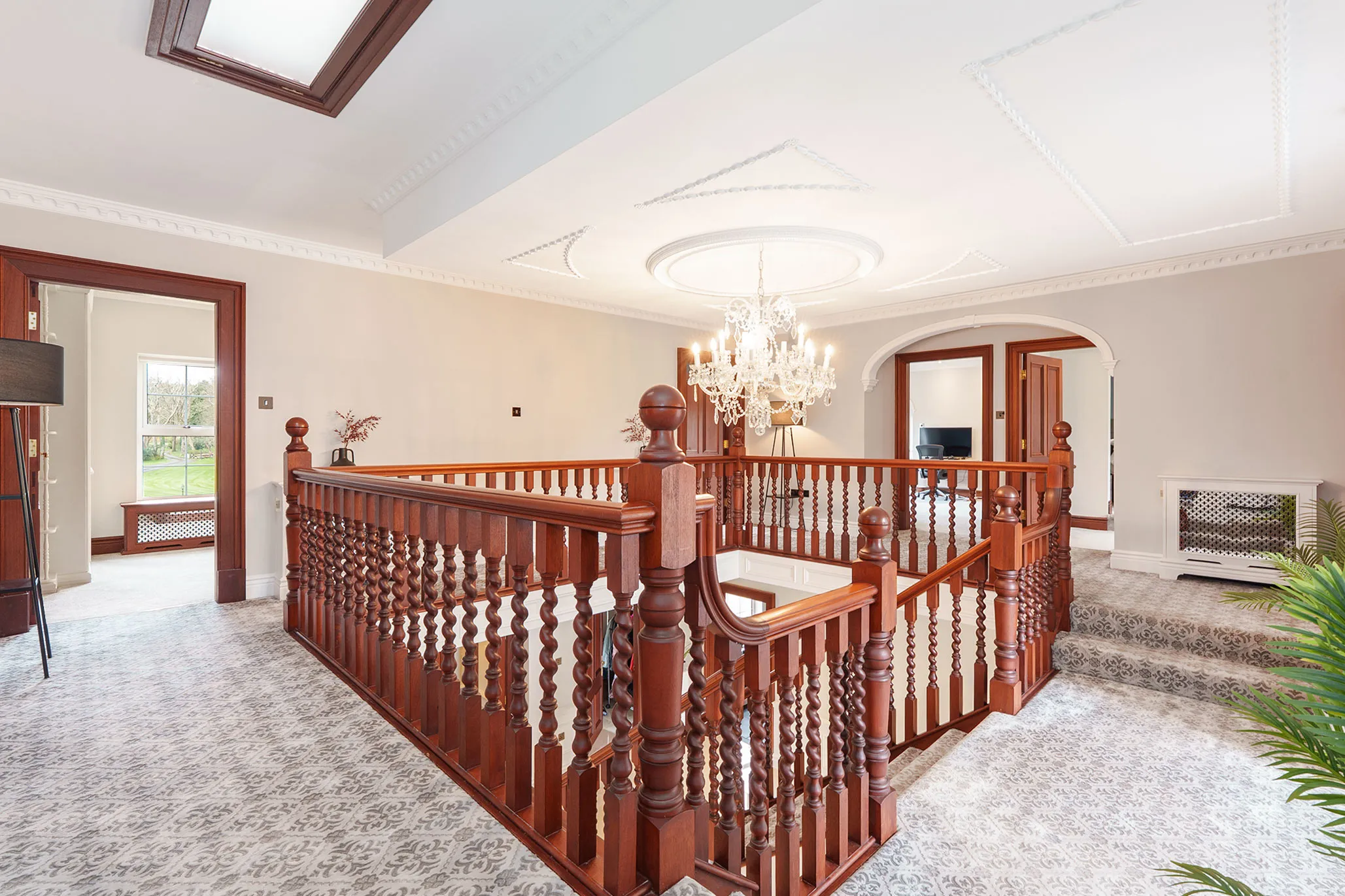 - Grand reception hall framed by a feature centralised sweeping staircase along with a sitting area