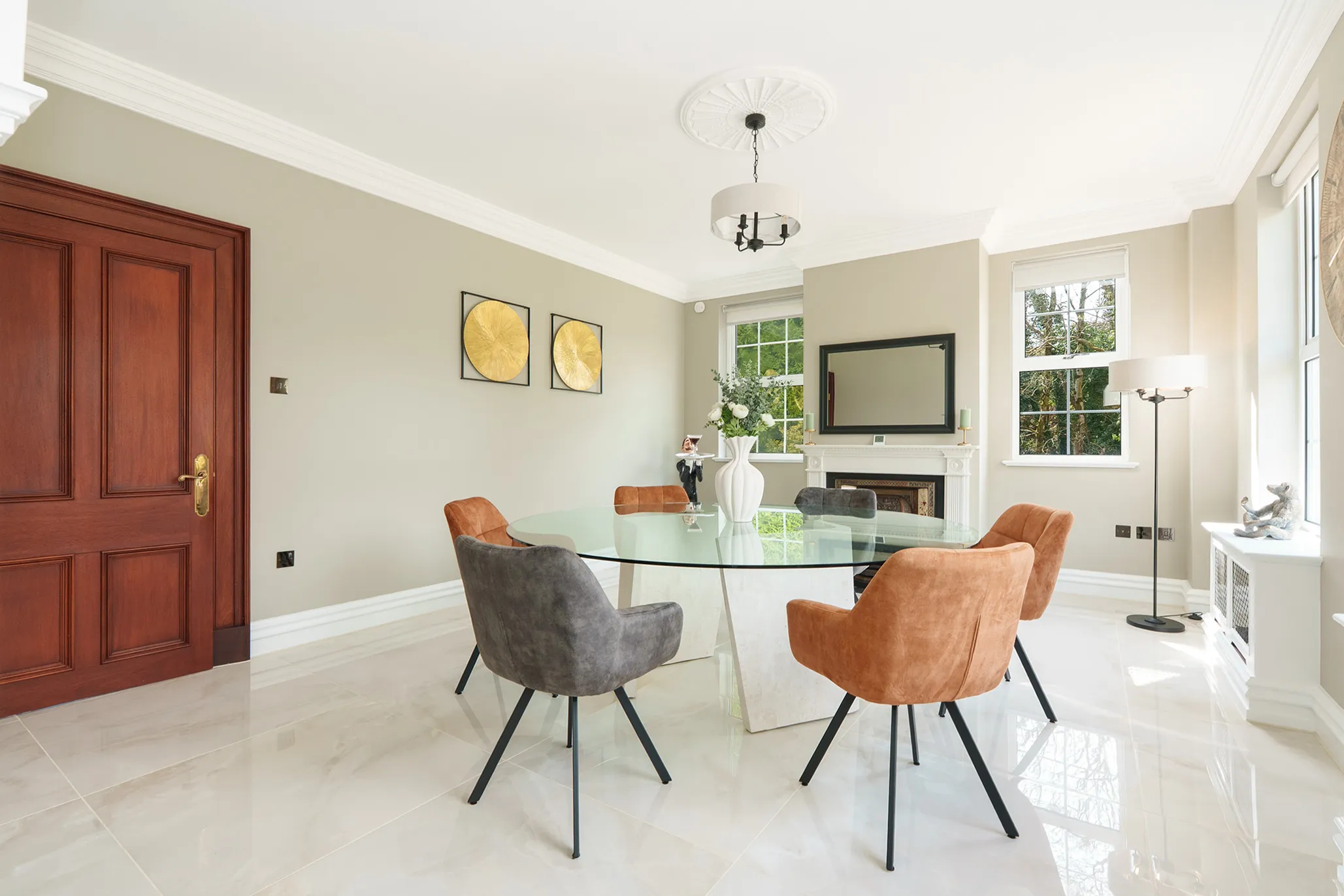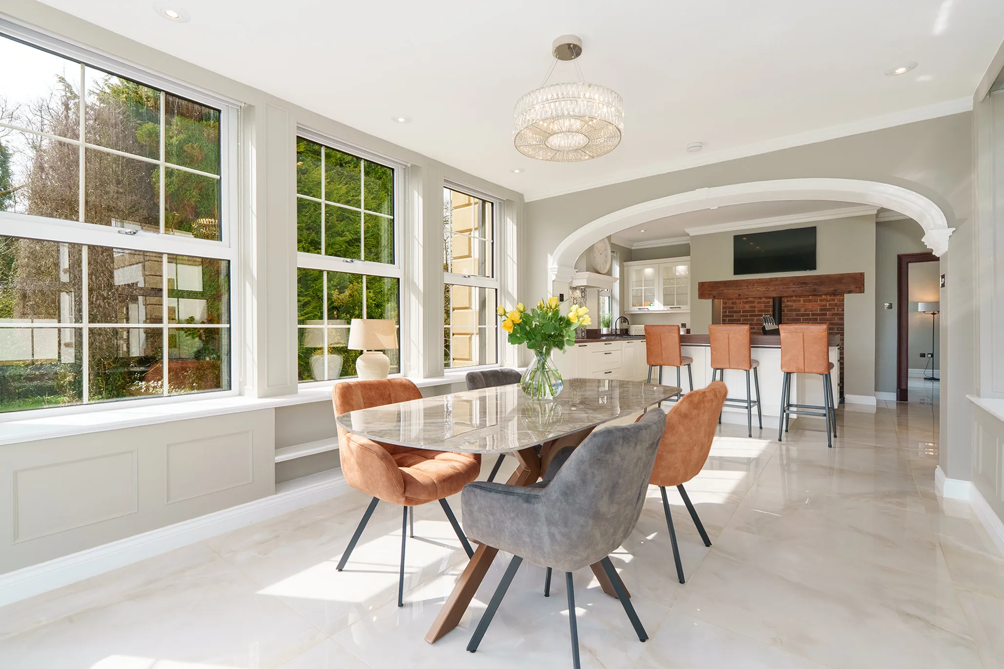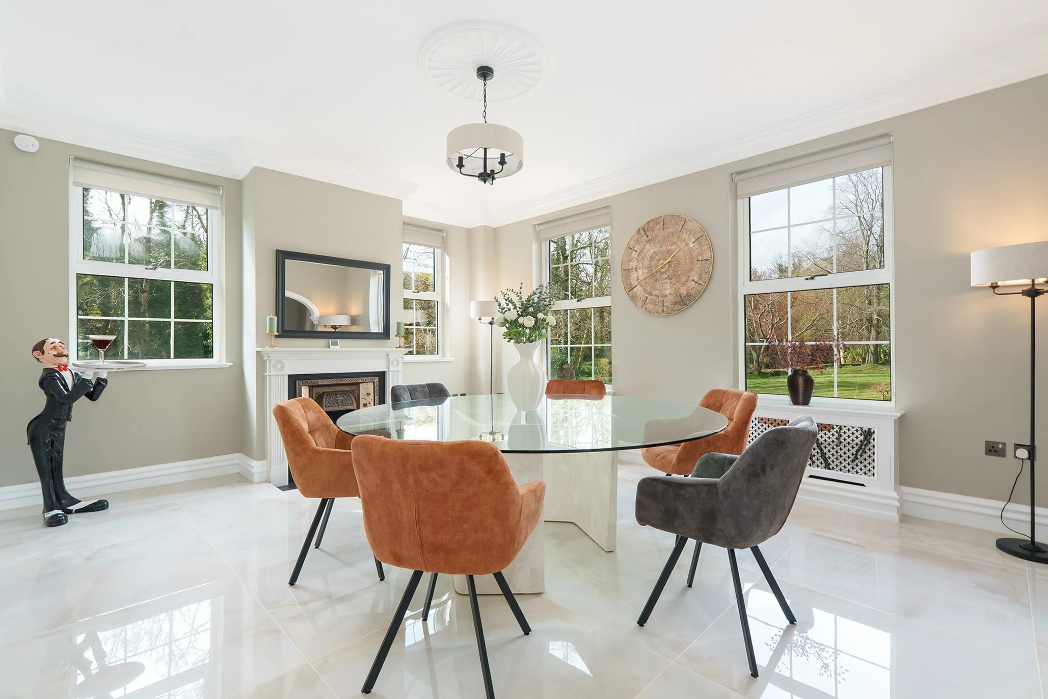 The property has been elegantly and luxuriously modernised, seamlessly blending timeless Georgian proportions with contemporary design and comfort. A truly striking first impression is created by the grand reception hall, where a central sweeping staircase forms an architectural focal point, enhanced by a sophisticated seating area and an abundance of natural light formed by bi-fold doors reinforcing the home’s light-filled, contemporary flow.