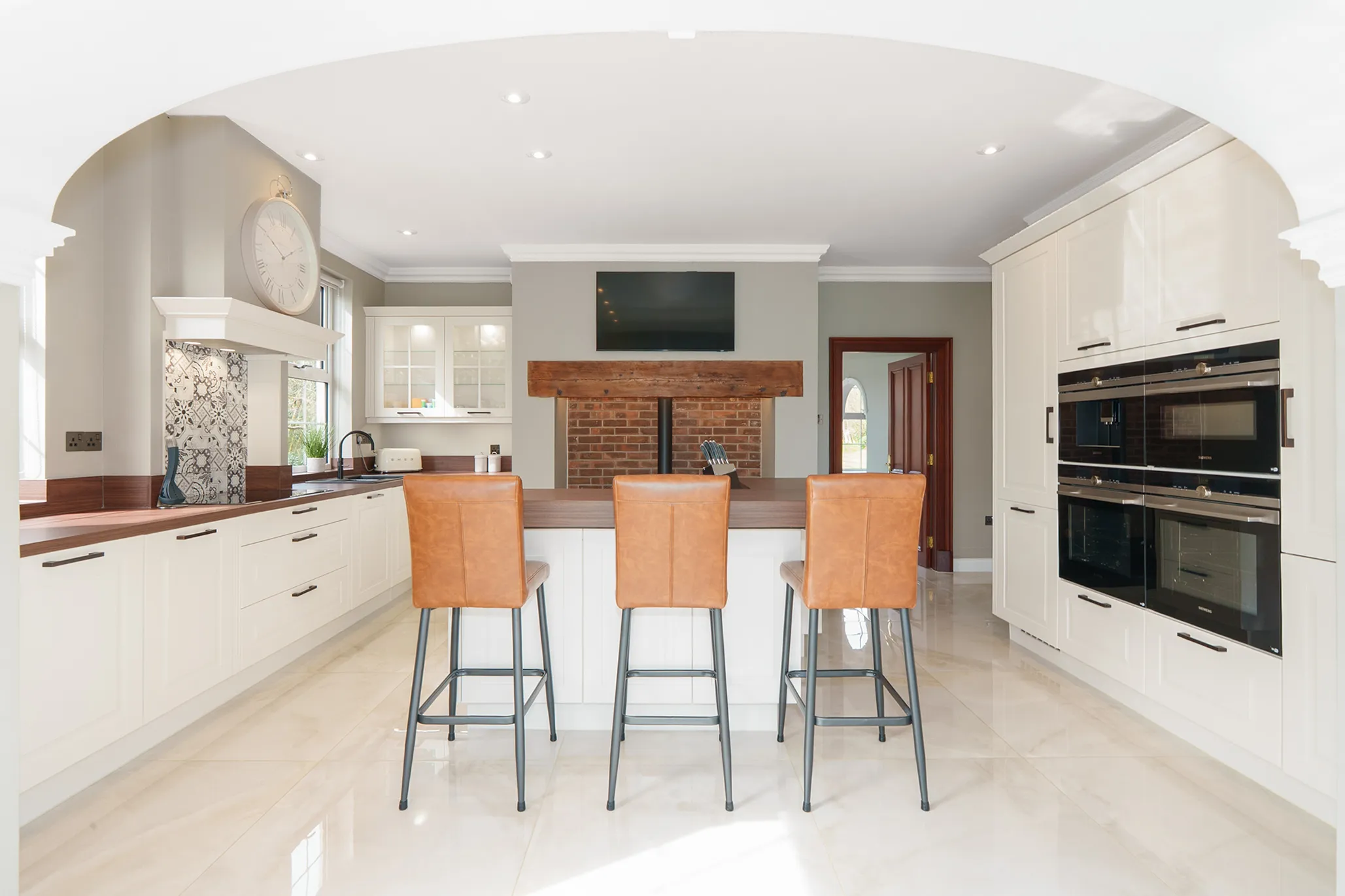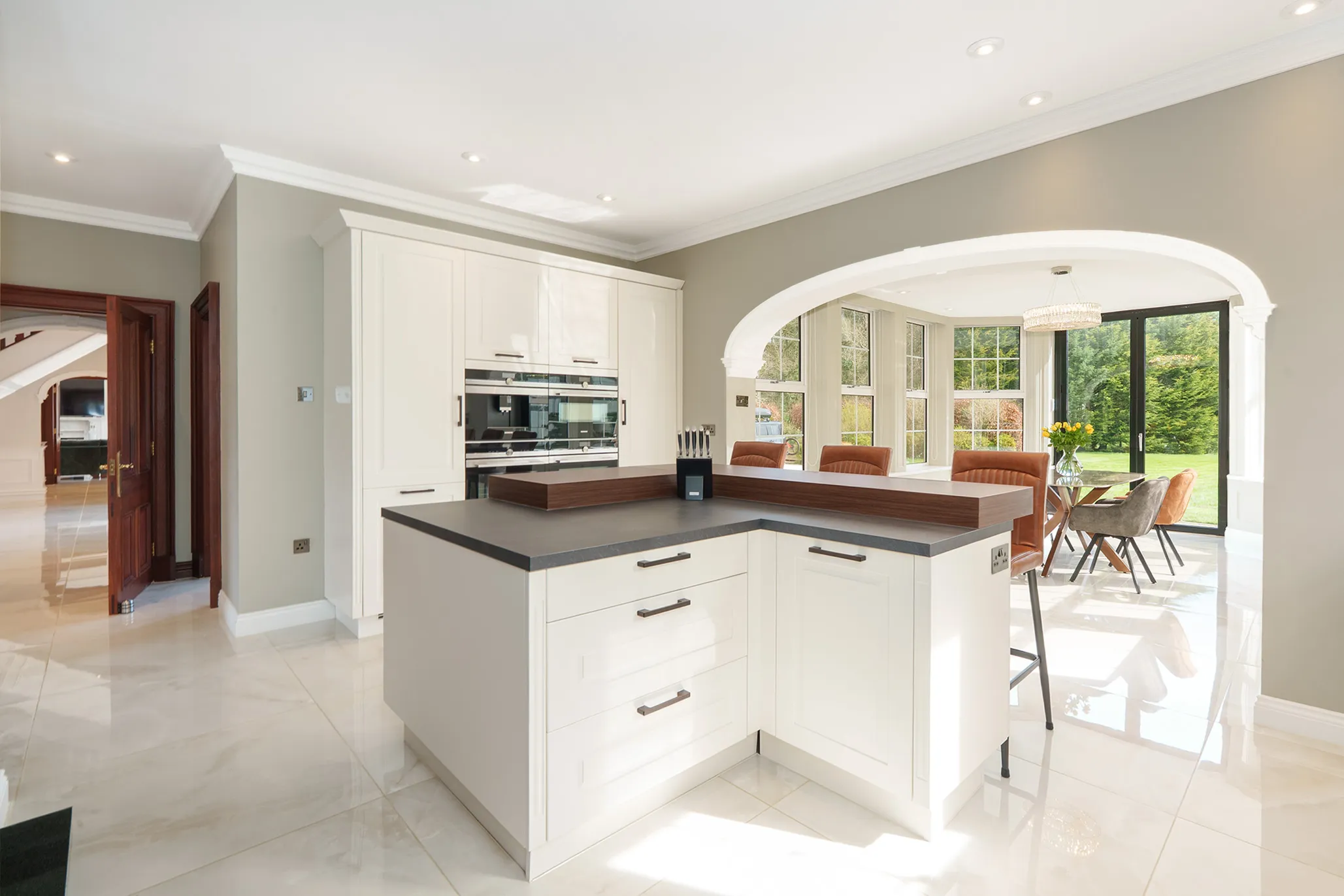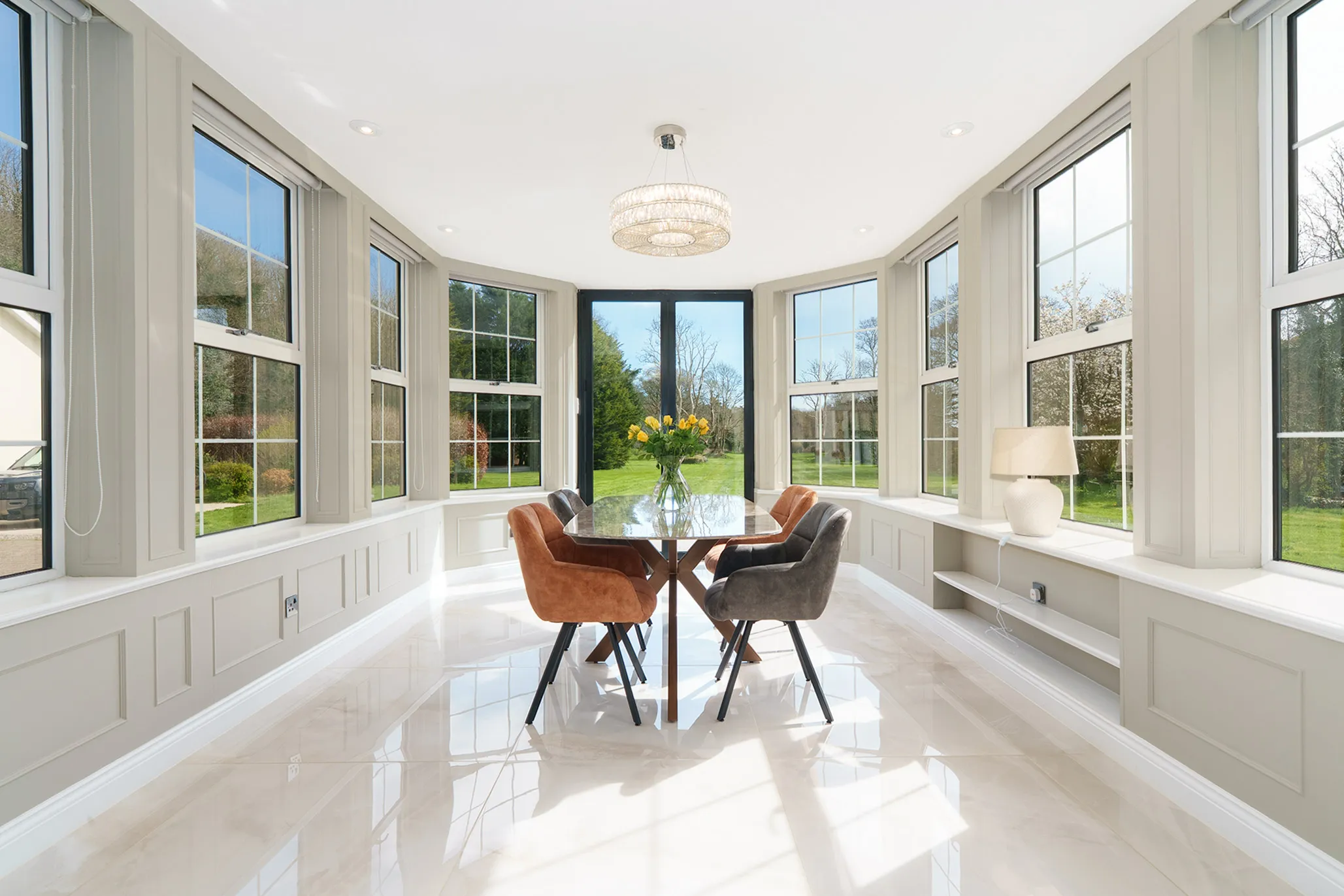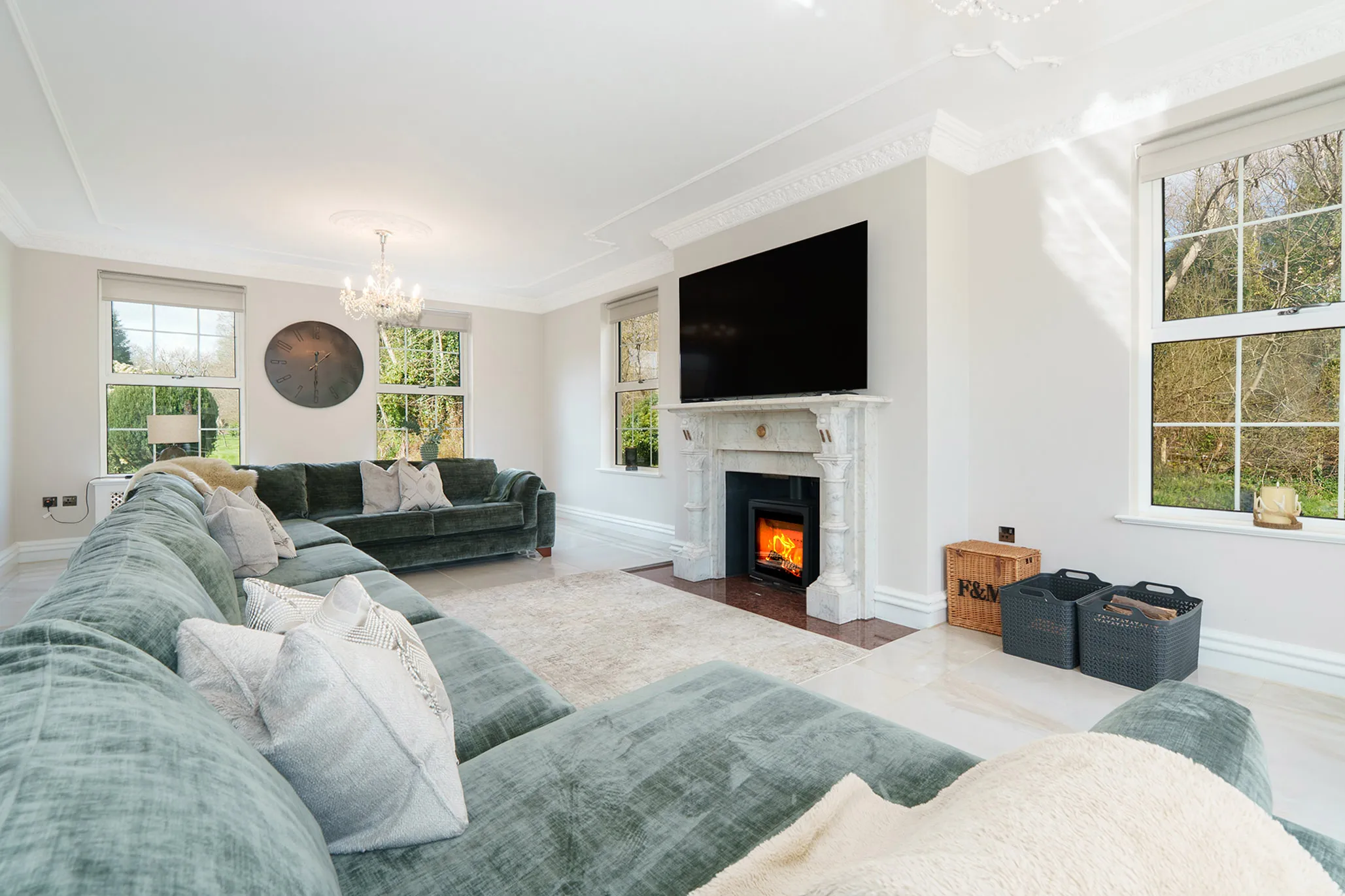 The property has been elegantly and luxuriously modernised, seamlessly blending timeless Georgian proportions with contemporary design and comfort. A truly striking first impression is created by the grand reception hall, where a central sweeping staircase forms an architectural focal point, enhanced by a sophisticated seating area and an abundance of natural light formed by bi-fold doors reinforcing the home’s light-filled, contemporary flow.