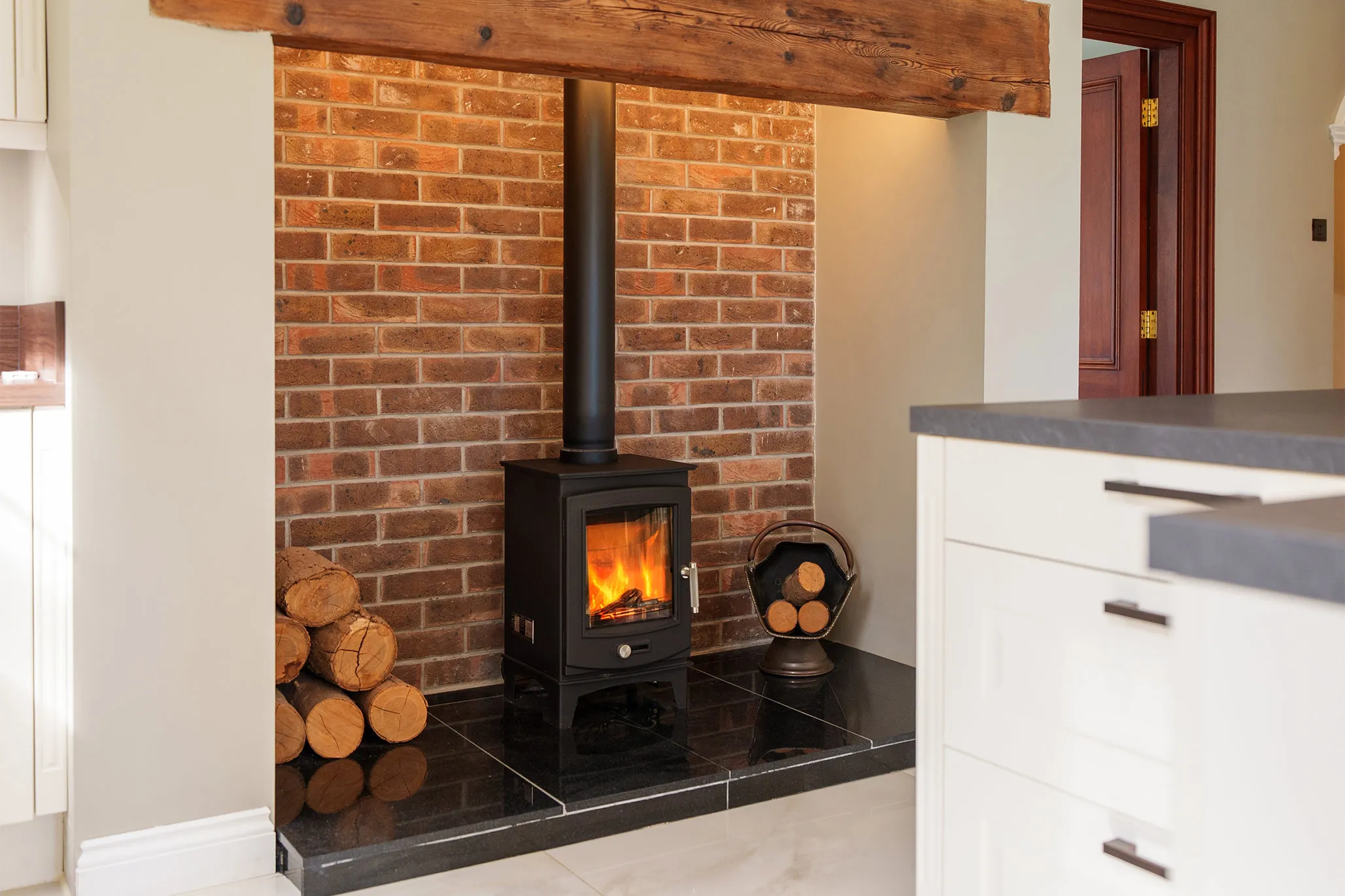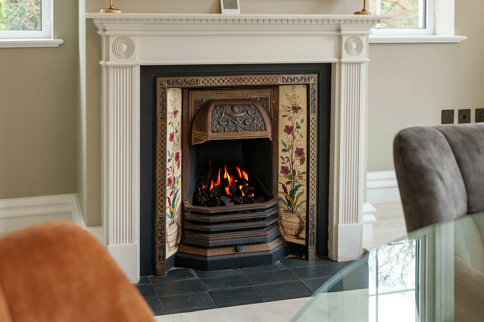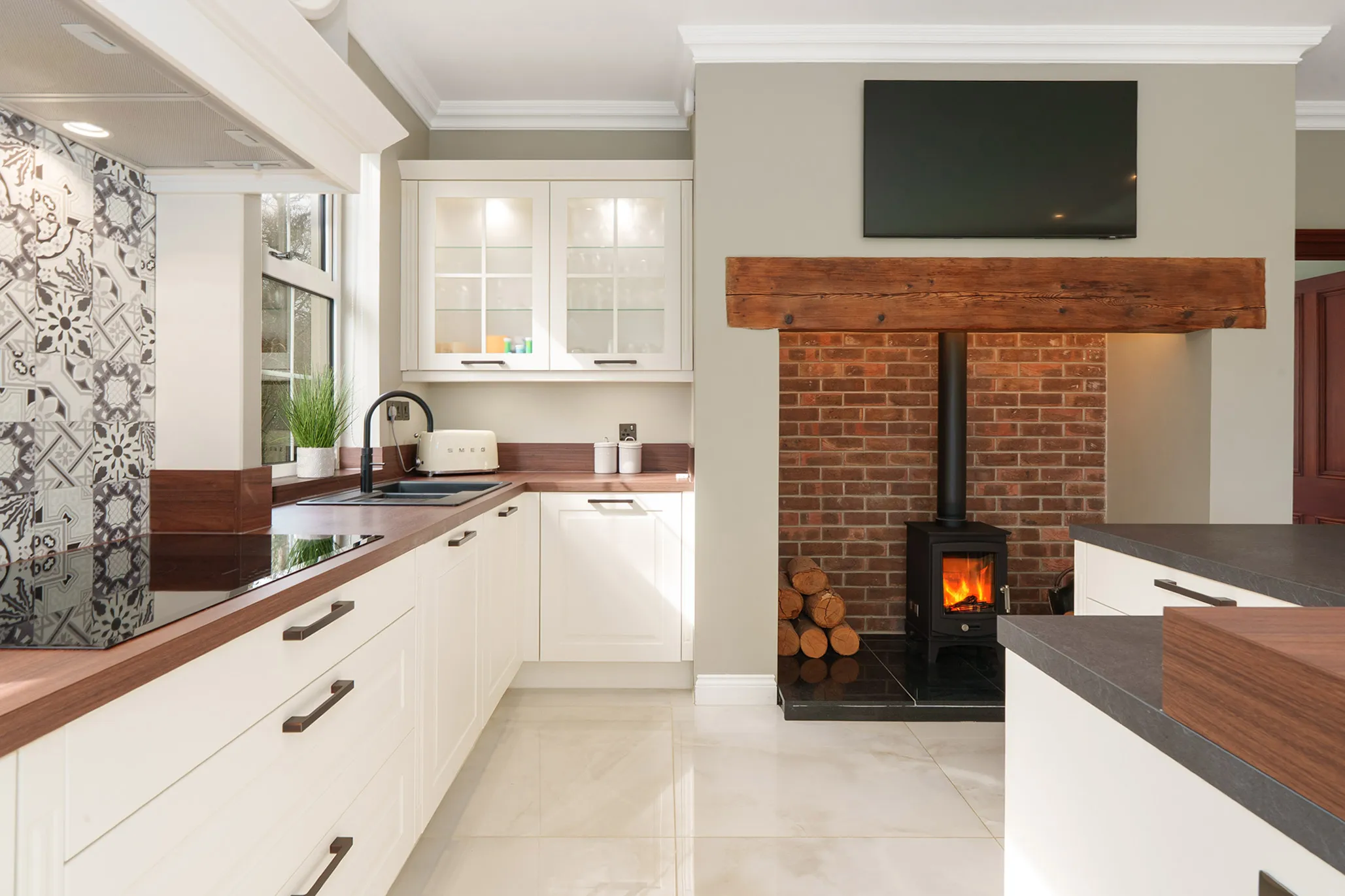 A superb selection of reception spaces provides both versatility and refinement. The principal living room exudes warmth and character, centred around a beautiful period-style fire surround with a wood-burning stove - ideal for relaxed evenings by the fire. A further elegant sitting room offers a peaceful retreat, while the formal dining room is perfectly suited to entertaining, complete with bespoke fitted shelving and bar area, alongside a feature gas fire set within a classic surround.