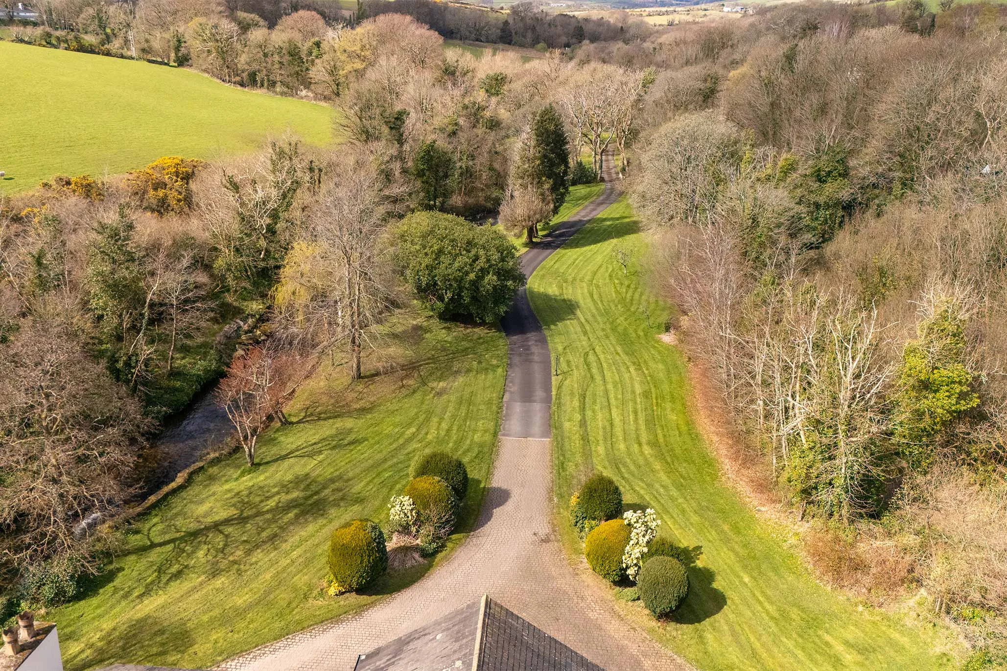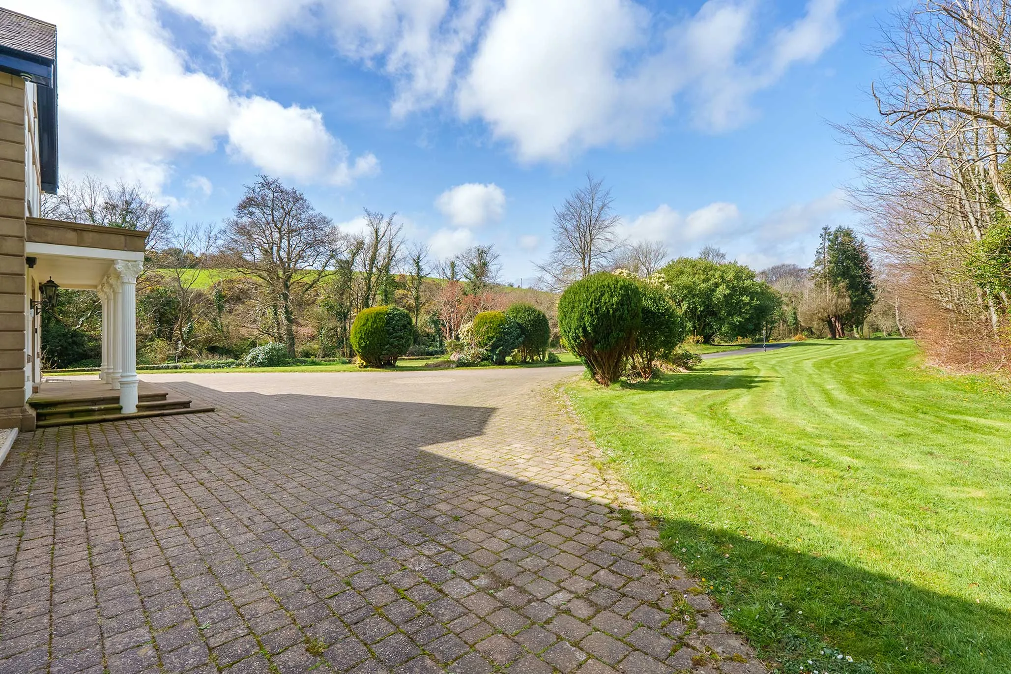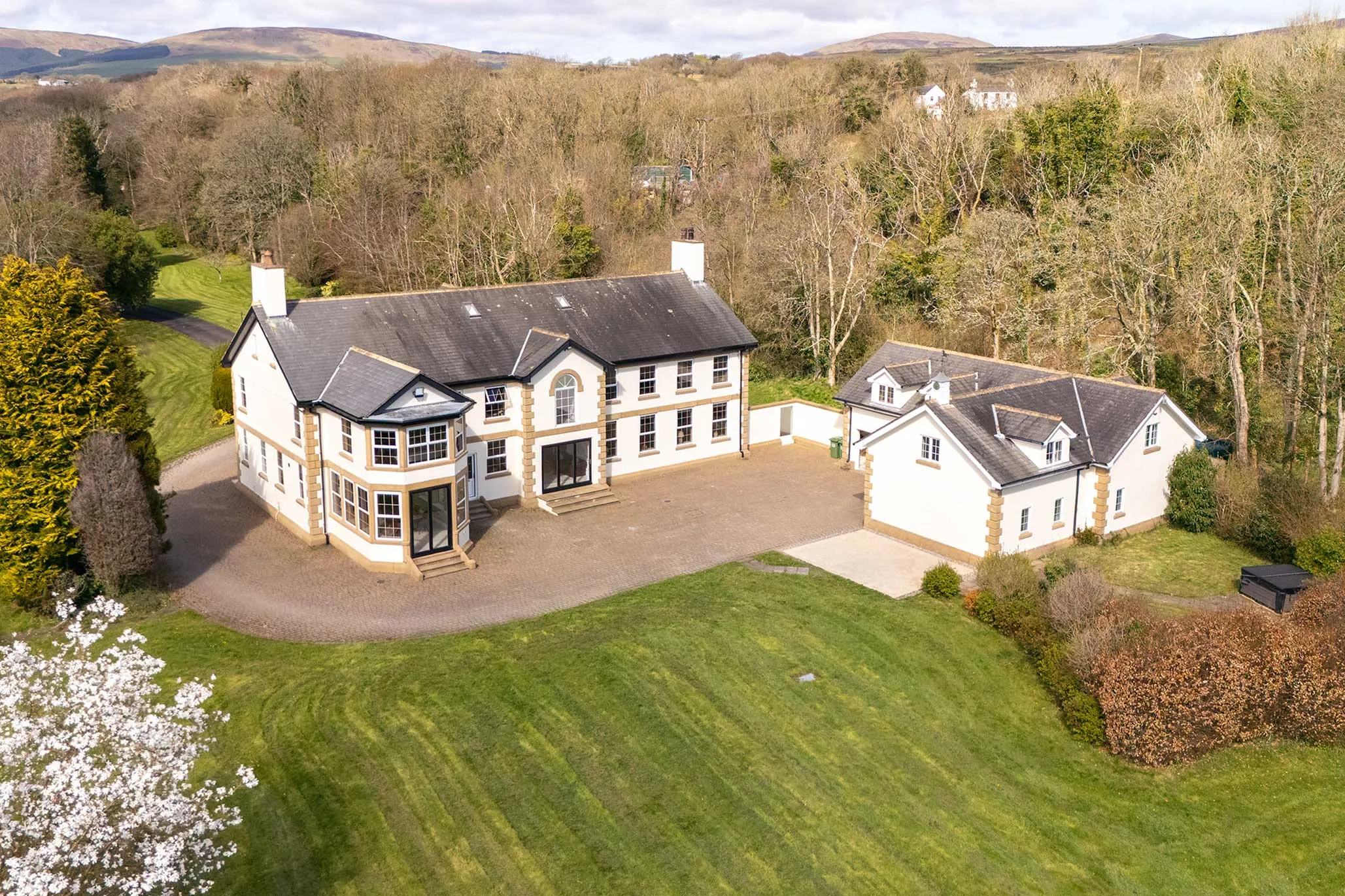 Set amidst beautifully maintained grounds, this impressive country mansion enjoys a peaceful and highly sought-after setting, surrounded by unspoilt countryside and scenic outlooks. The approach is nothing short of spectacular, with an imposing sweeping driveway leading through the grounds to a rear courtyard, perfectly complementing the stature and presence of the home.